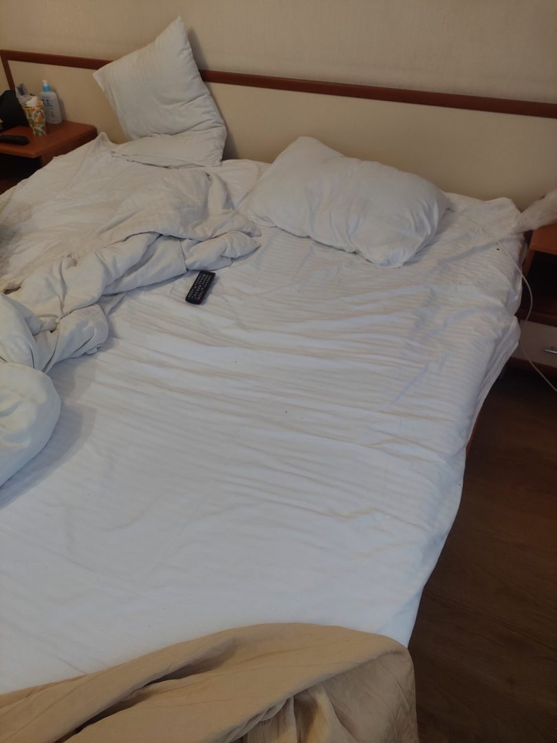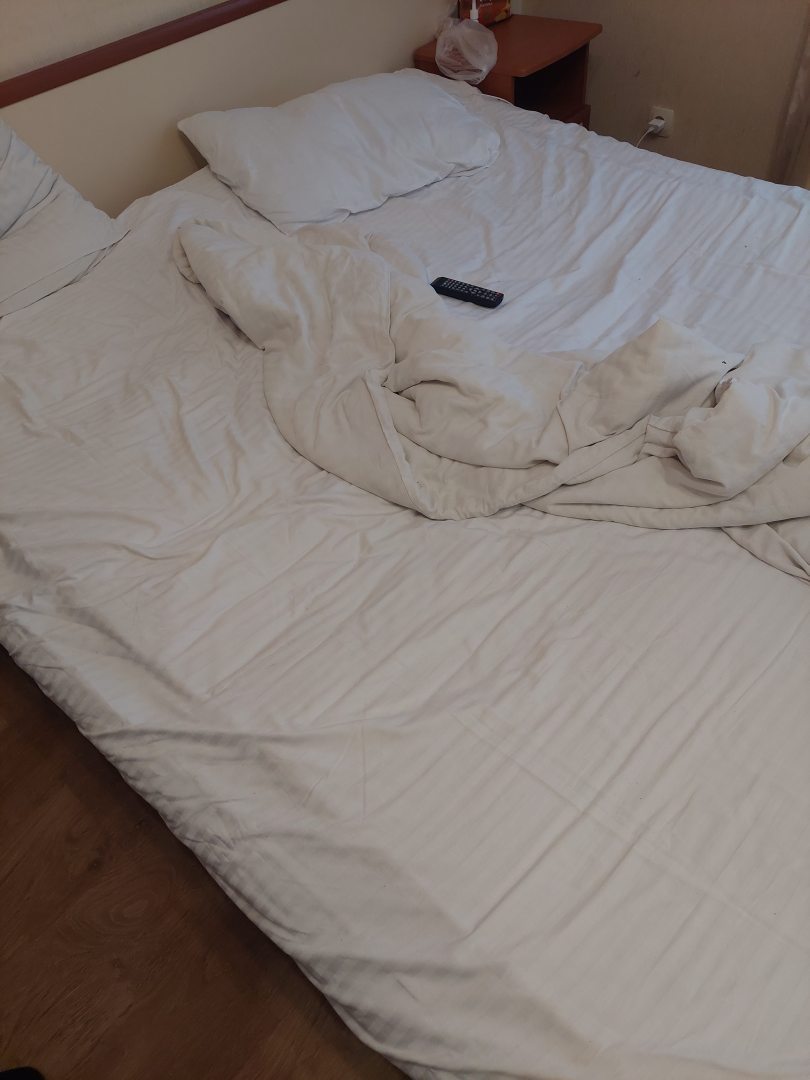 Номер очень светлый, большая двуспальная кровать, кресло, чистые светлые обои и белый потолок. Очень уютно. Имеется телевизор но мне он не понадобился.
