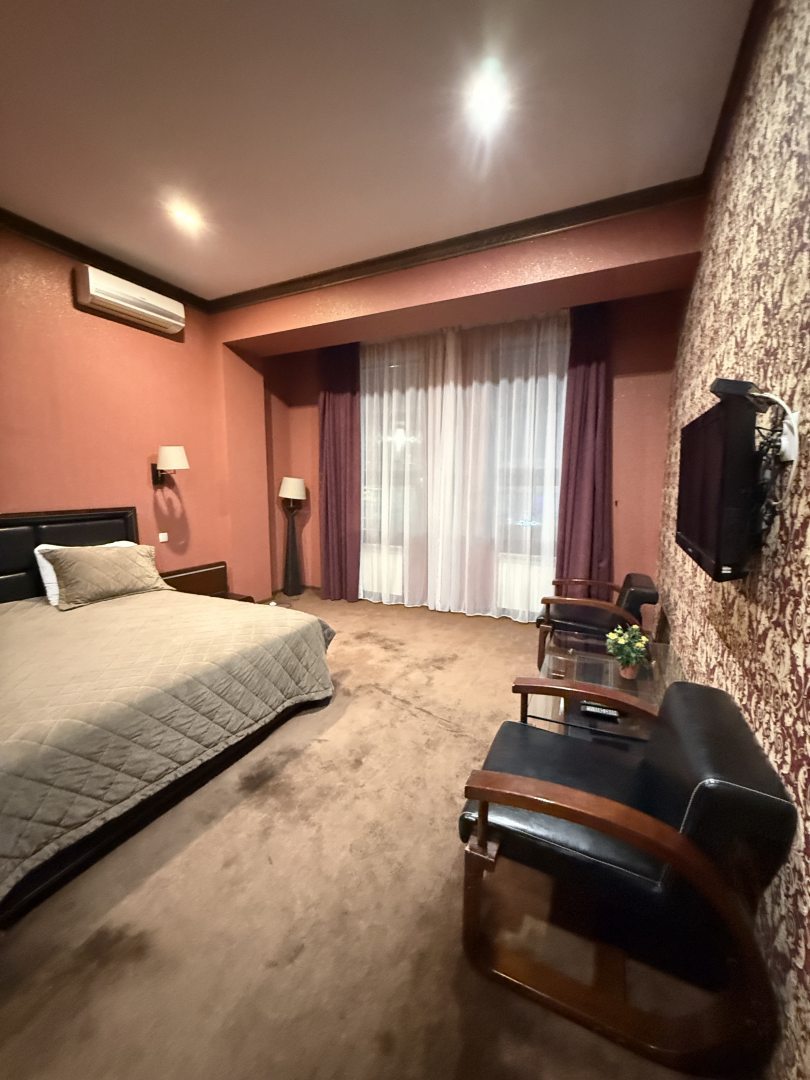 Хороший отель. Цена и качество соответствует.В номере: халаты, банные и зубные принадлежности. Номер бронировали комфорт, по площади номер большой.можно заказать завтрак за дополнительную плату ( каша ,яичница, бутерброд с колбасой и сыром, по желанию (чай, кофе). Мы были на машине, охраняемая бесплатная парковка).