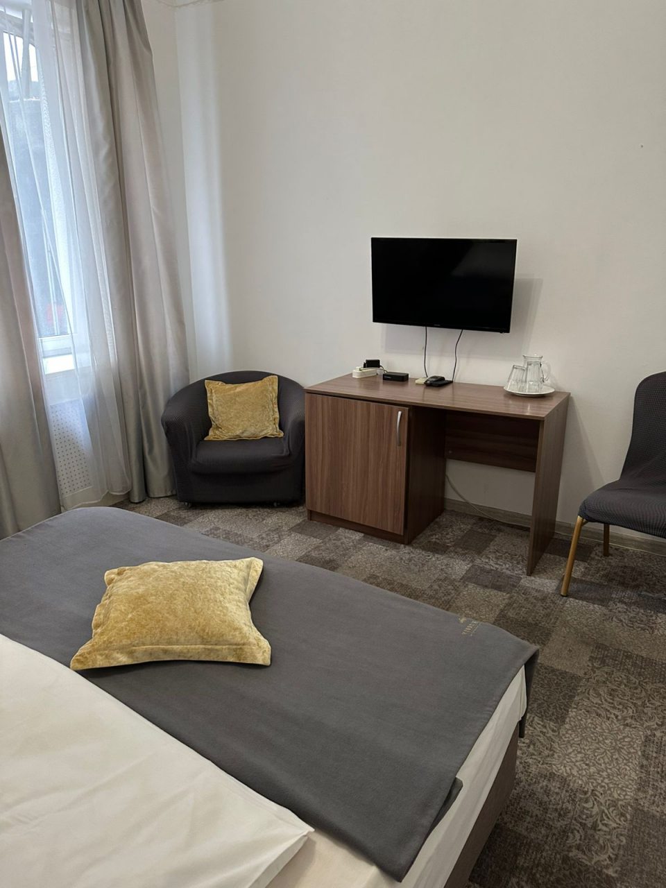 Номер просторный, чистый, имеет все необходимое для проживания, холодильник, телевизор, письменный стол.
