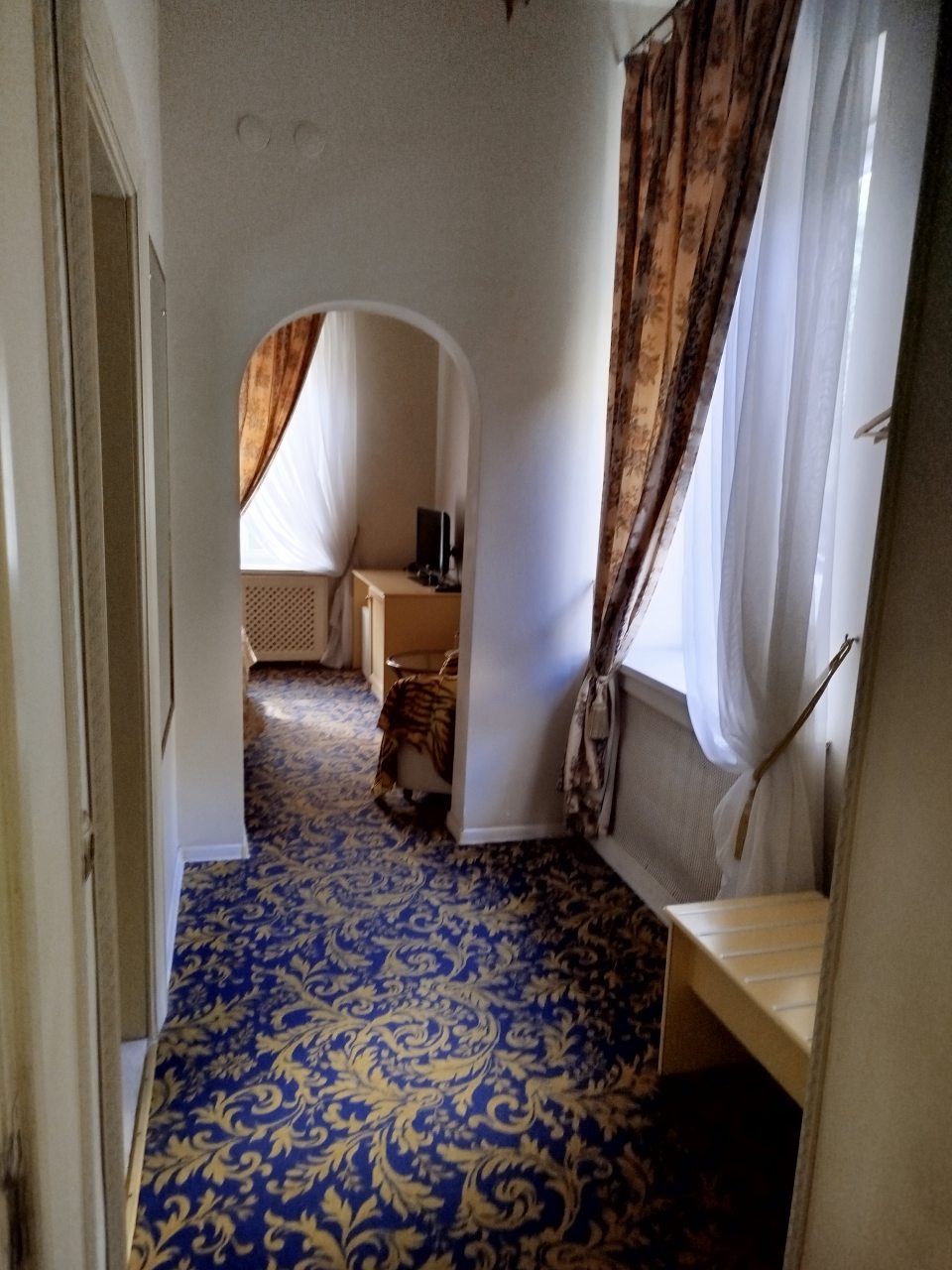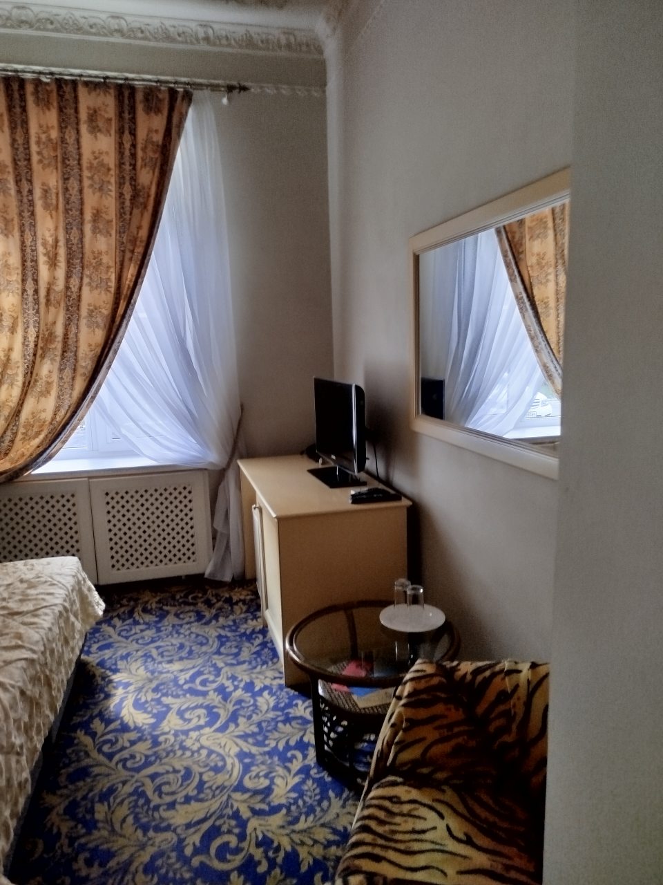 Расположен очень удобно, центр, магазины, парки, вокзал ... Заселилась в 20-ых числах сентября. Даже не знаю как сказать, палка о двух концах - меня поселили в тихом номере (как и просила при бронировании), окна во внутренний дворик, солнца нет - номер не греется, НО - это самый дешманский номер в этой гостинице! Читала о нем отзывы и когда вошла в номер, сразу поняла - он, 5 ! Для тех, кто плохо себя вел, так думаю.