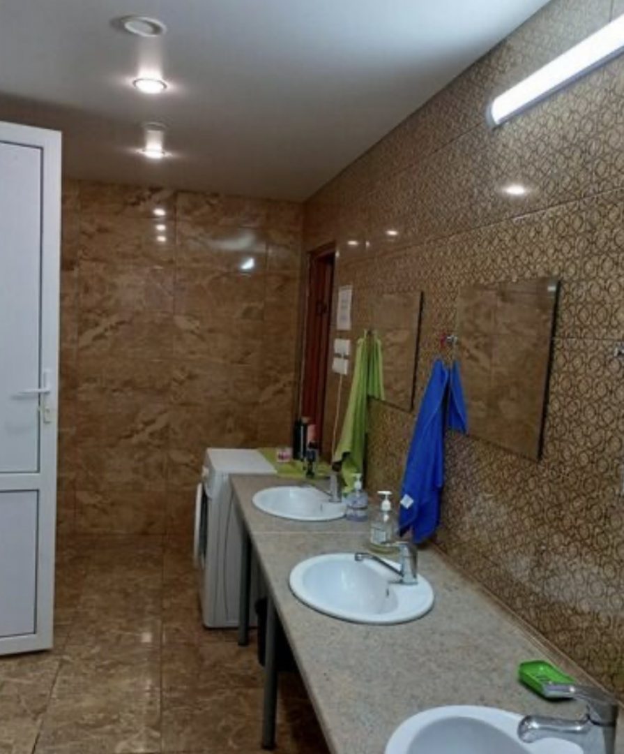Для самостоятельного приготовления оборудована кухня. В наличии: моющие средства, посуда, столовые принадлежности и другие бытовые приборы. Тут же стоят две стиральные машины.