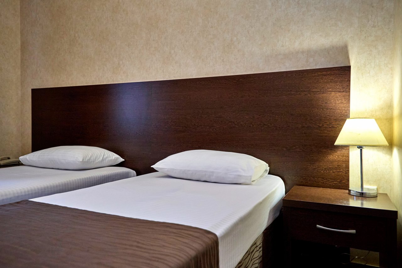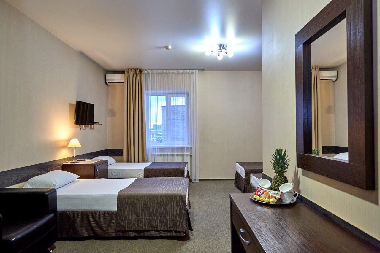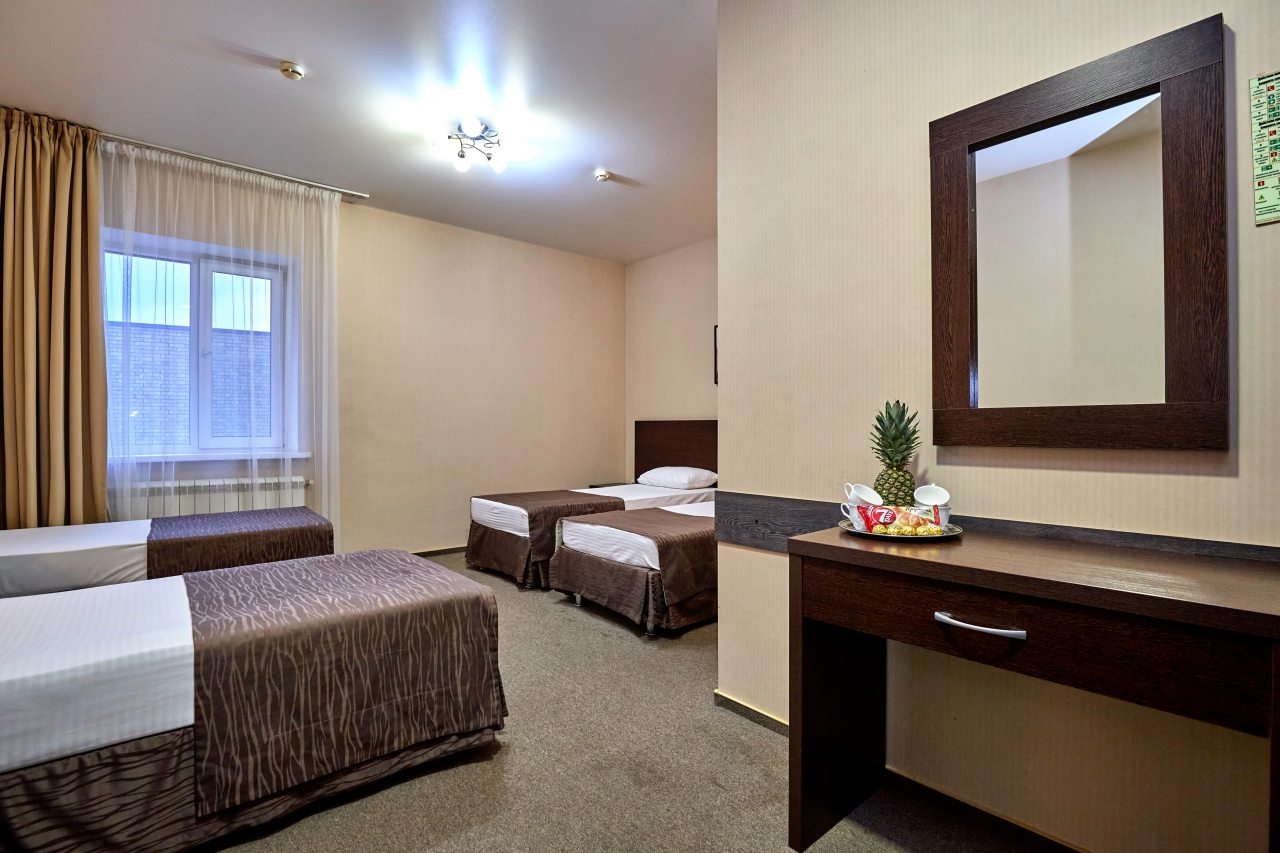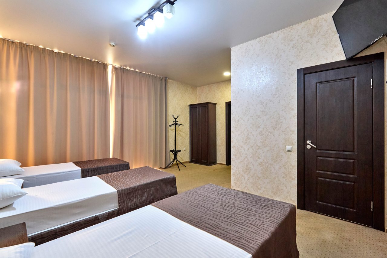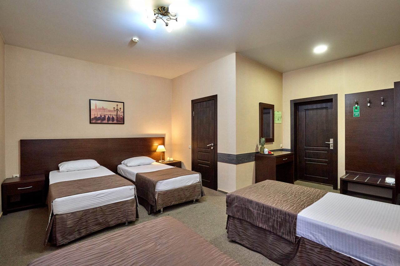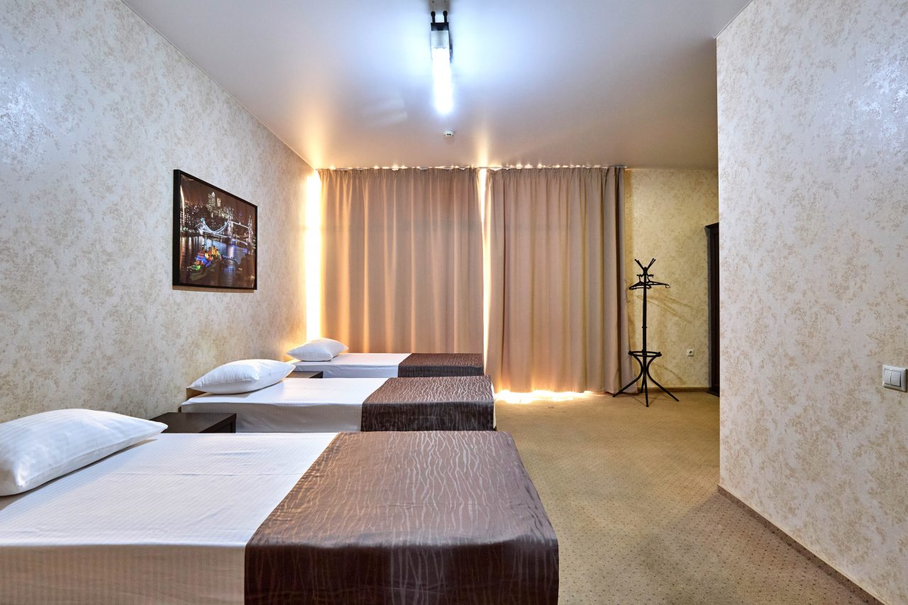 Просторные номера разной вместимости от 2 до 6 человек оснащены удобными спальными местами, прикроватной мебелью, кондиционером, вешалками для верхней одежды, шкафом, телевизором с кабельным телевидением, wi-fi и др. Собственная ванная комната укомплектована качественной сантехникой, феном, гигиеническими средствами.