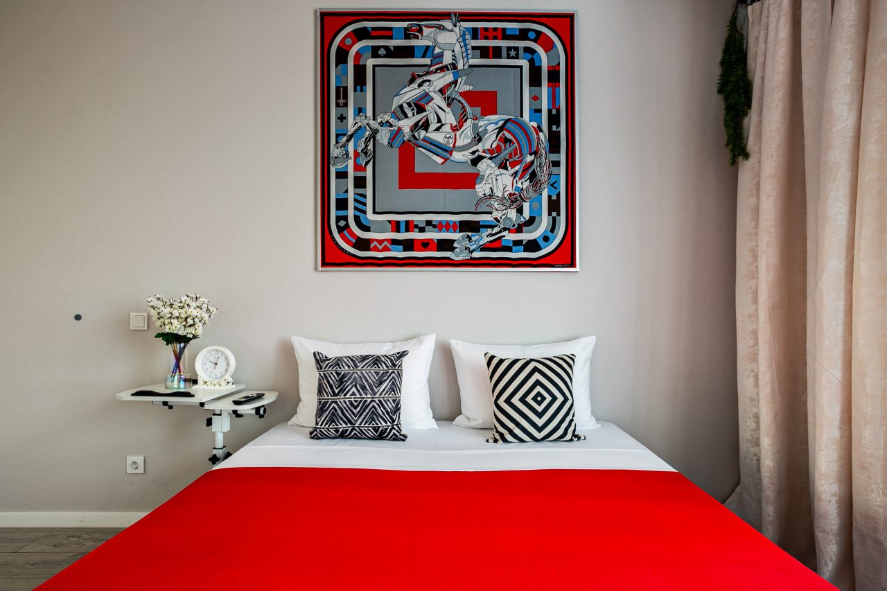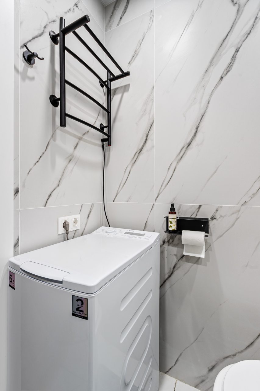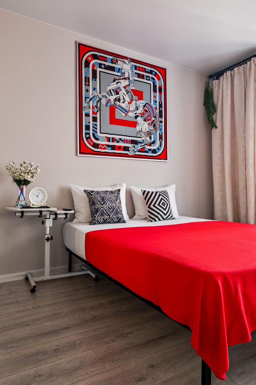 Проживать предлагается в однокомнатной квартире, которая оснащена всем необходимым для приятного отдыха: двуспальной кроватью, раскладным диваном, гладильными принадлежностями для удобства, кондиционером. Есть собственная ванная комната, где установлены: стиральная машина, душевая кабина и полотенцесушитель. Подключена высокоскоростная сеть Wi-Fi. Имеется телевизор для просмотра фильмов.