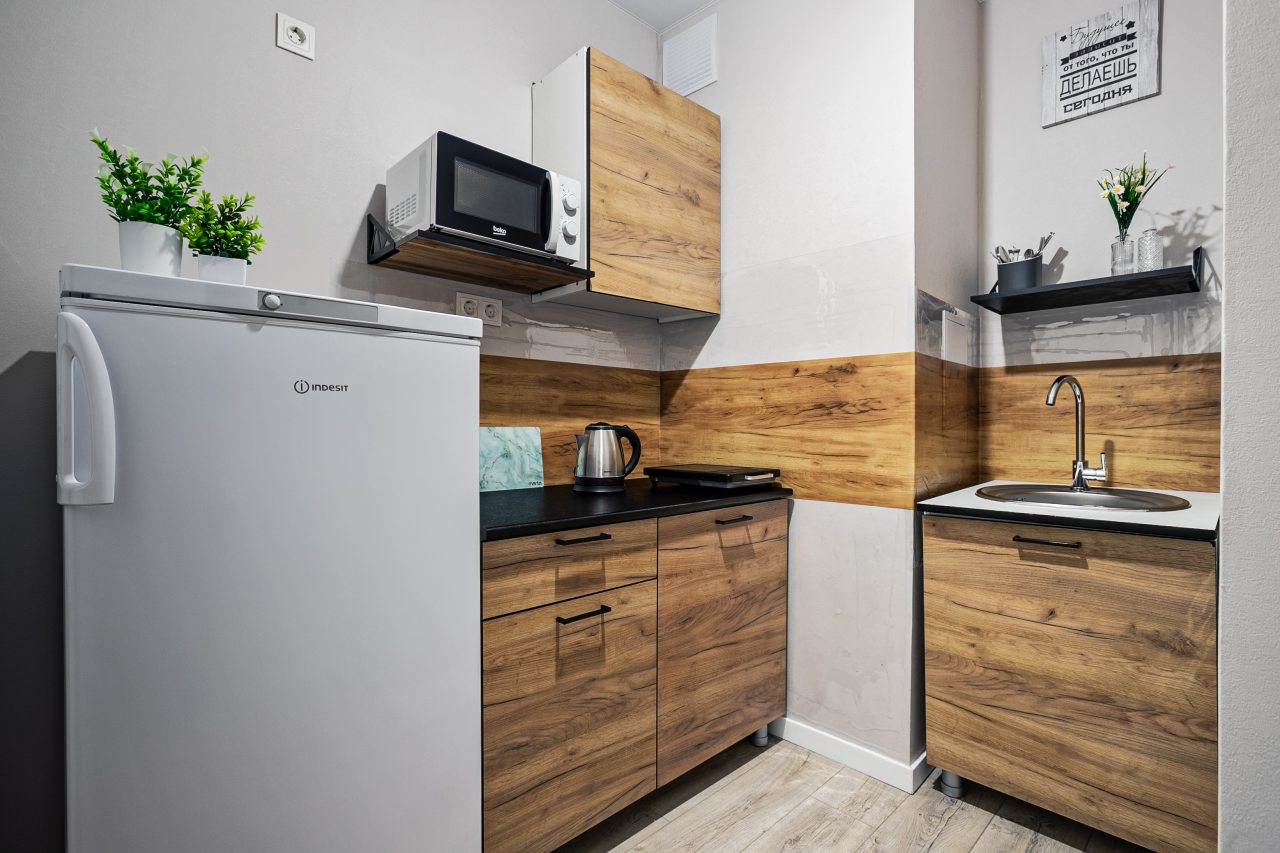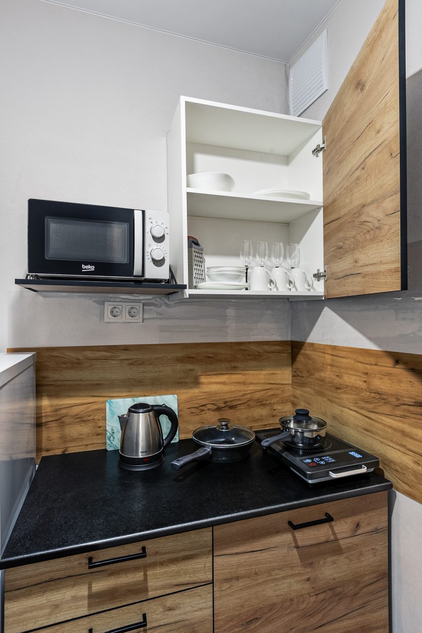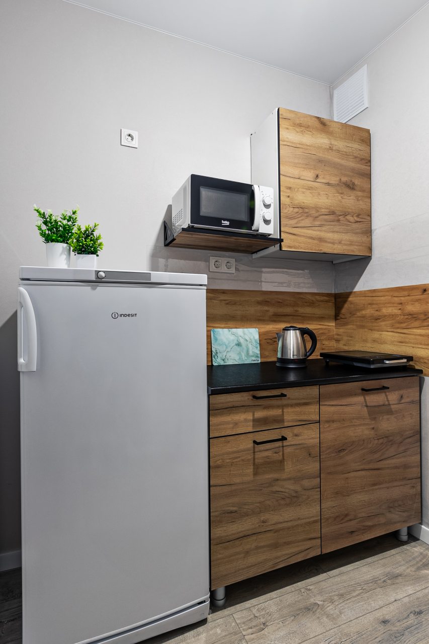 Созданы условия для самостоятельного приготовления разнообразных блюд, так как кухня оборудована СВЧ-печью, электрической плитой, духовым шкафом, холодильником и чайником.