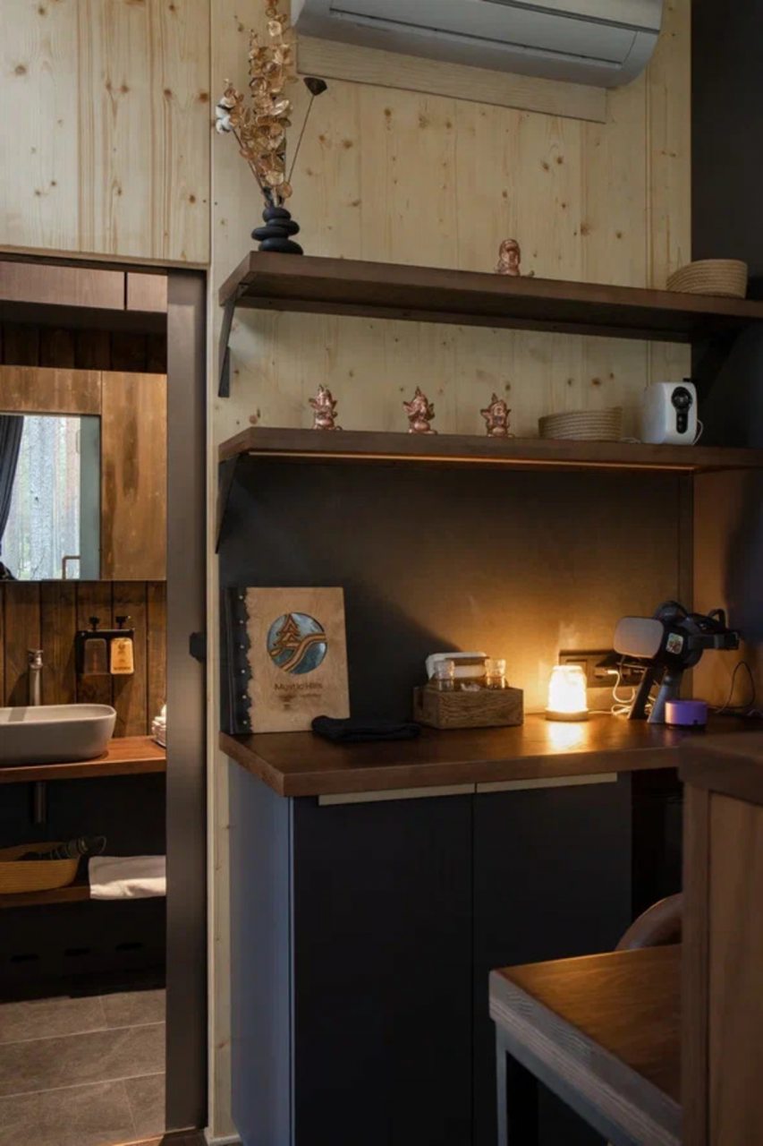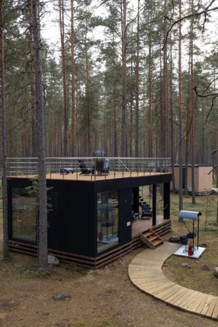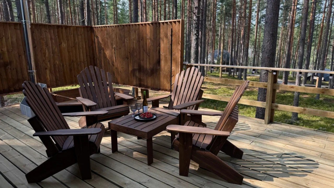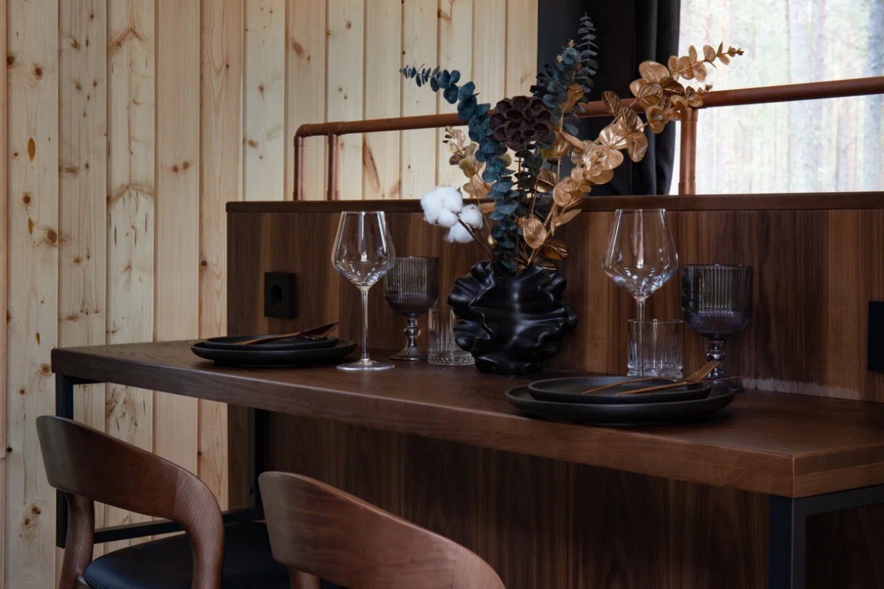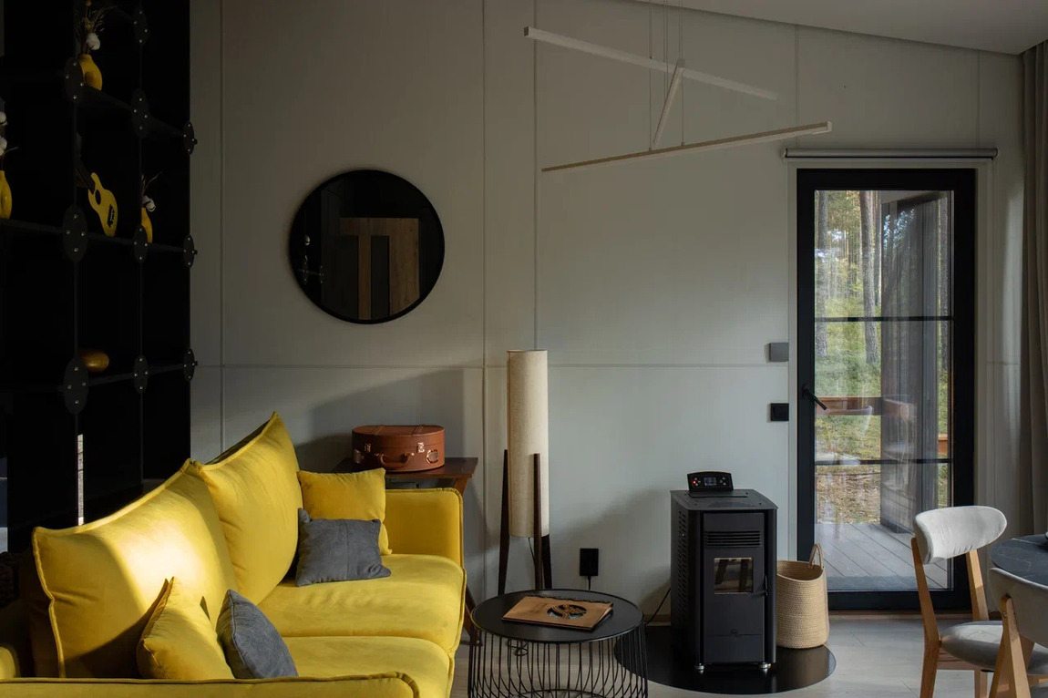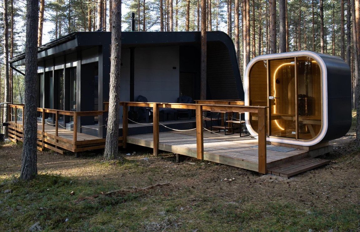 Загородный отель предоставляет для размещения двухместные домики типа Полулюкс. Каждый дом выполнен в современном стиле и оборудован мебелью и техникой: двуспальная кровать, небольшой обеденный столик, полки для книг и личных вещей, кондиционер, ванная комната. Из панорамных окон открывается вид на сосны, которые окружают территорию, создавая чудесный пейзаж.