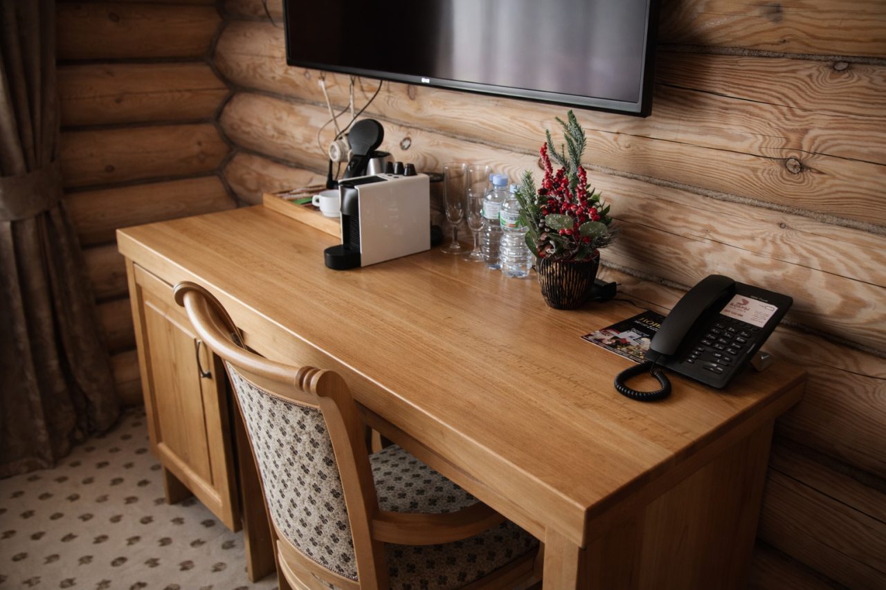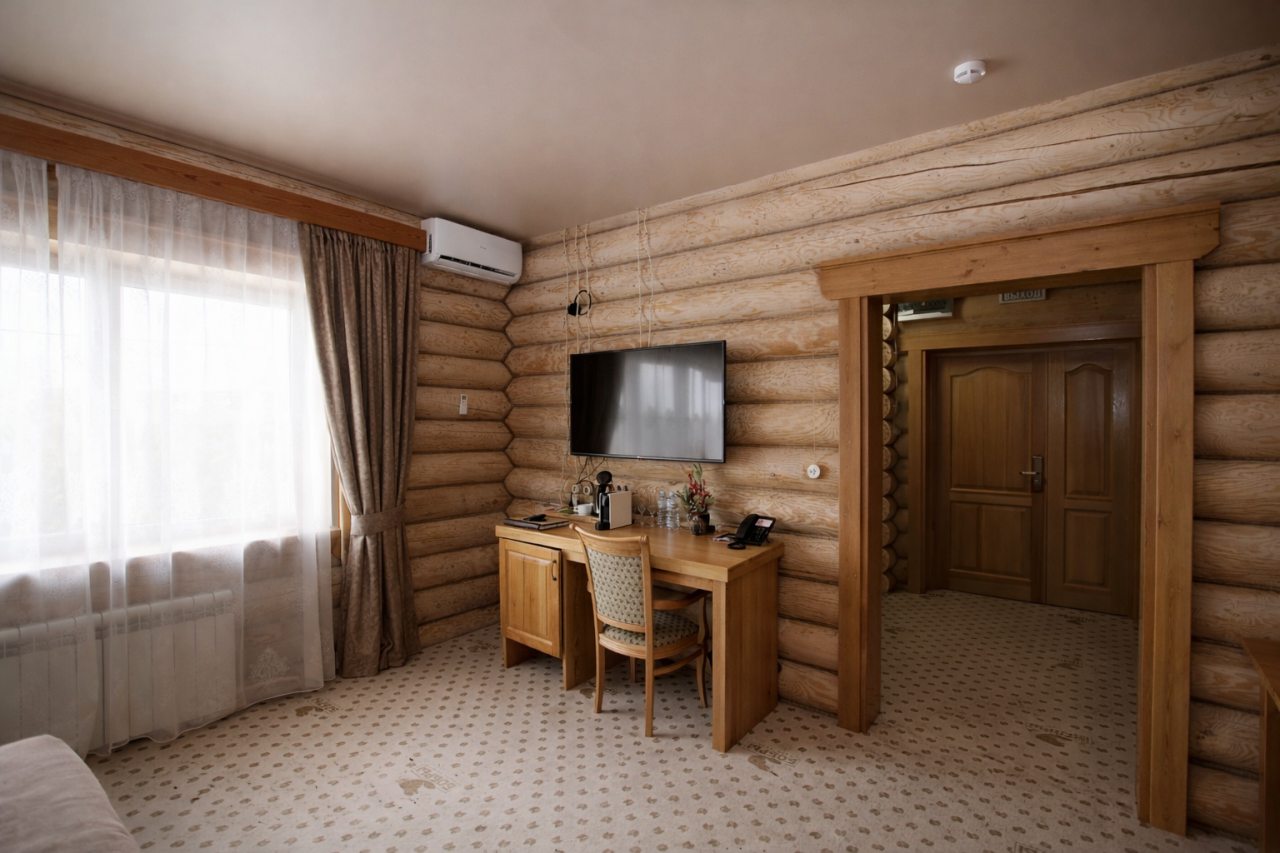 В номерах есть мини-бар и чайная станция, а в срубах обустроена полноценная кухня с бытовой техникой, посудой и просторной обеденной зоной. В проживание включен завтрак. Вкусно поесть и приятно провести время можно в ресторане русской кухни «Хлеб да Соль». Доступна аренда мангальной зоны с беседкой.