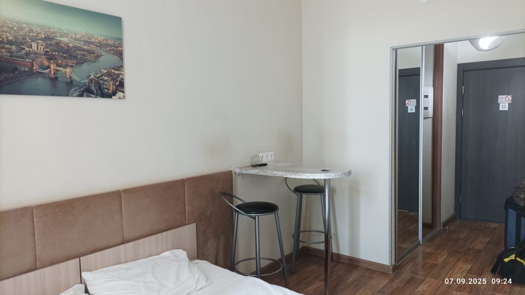 Комната просторная, есть небольшая кухонная зона единственное нет плиты, зато есть микроволновка, у моего коллеги было наоборот. Сама комната немного подустала, но в целом смотрится прилично, кровать большая для одного просто супер. Завтраки шведский стол все очень вкусно. В номере все есть гладилка, утюг, фен, холодильник, даже тапочки одноразовые, правда халата нет.