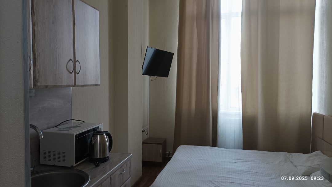 Забронировала номер на сайте. Номер был с большой и очень классной кроватью В номере новый ремонт, всё очень красиво и удобно! Есть всё необходимое для проживания: холодильник, посуда, микроволновка, большой телевизор. В ванной комнате вообще полный восторг: современная сантехника, стиральная машина, фен. Мне номер очень понравился девушки на ресепшене очень приветливые) внизу есть кофейня, где продают вкусный кофе номер бронировала всего на одну ночь и утром не хотелось уезжать спасибо Вам! Теперь буду останавливаться только в вашем отеле)
