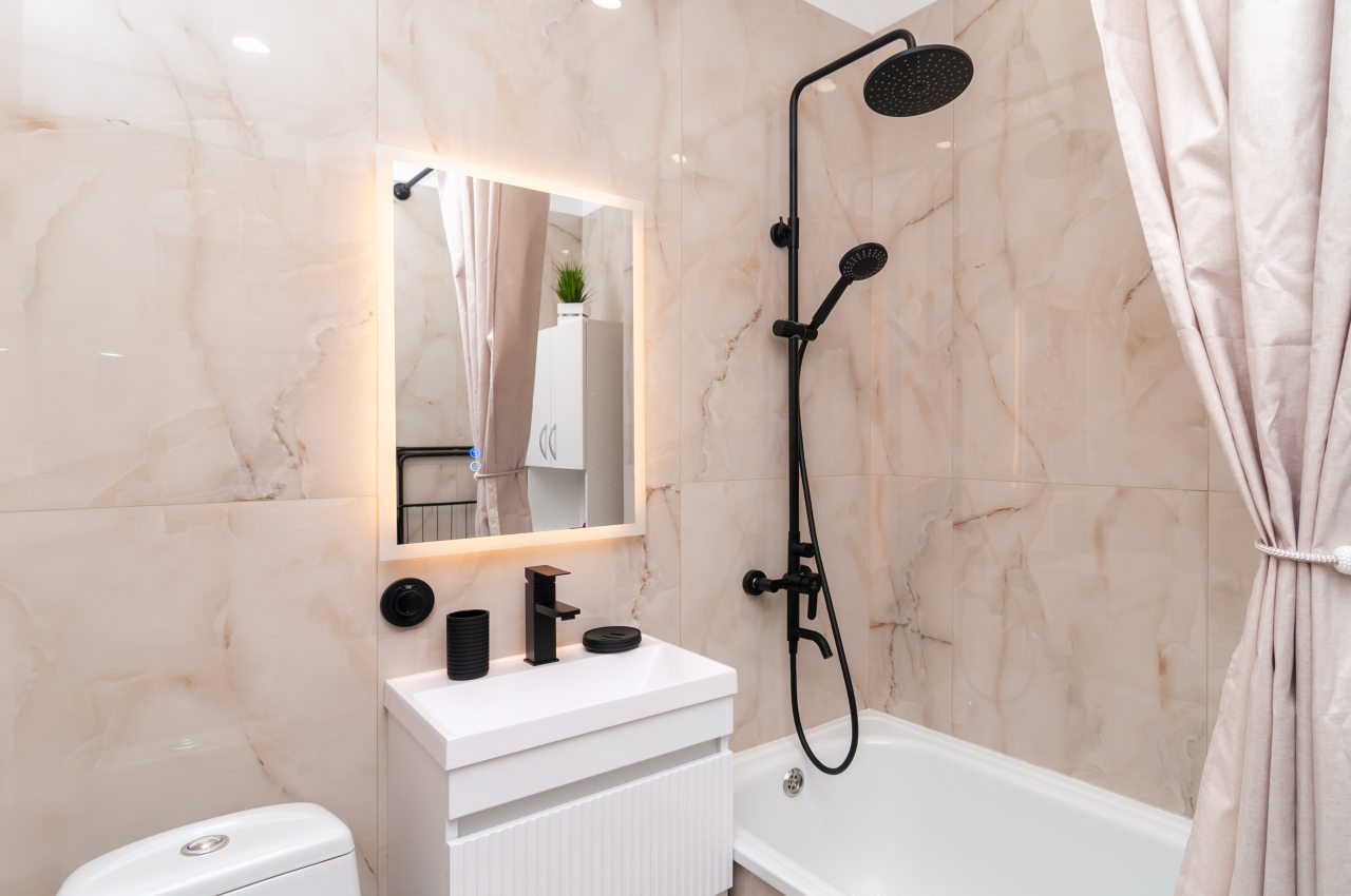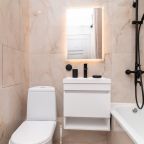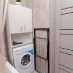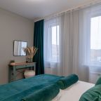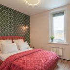 Это хороший вариант для размещения большой компанией или семьей, так как на площади в 56 квадратных метров есть две удобные двуспальные кровати, диван, телевизоры, а также полноценная ванна.