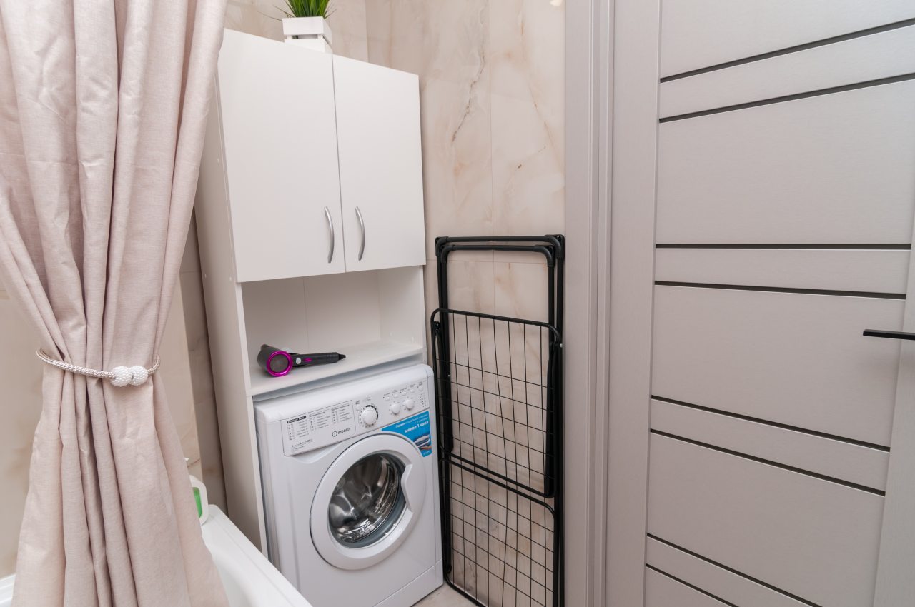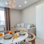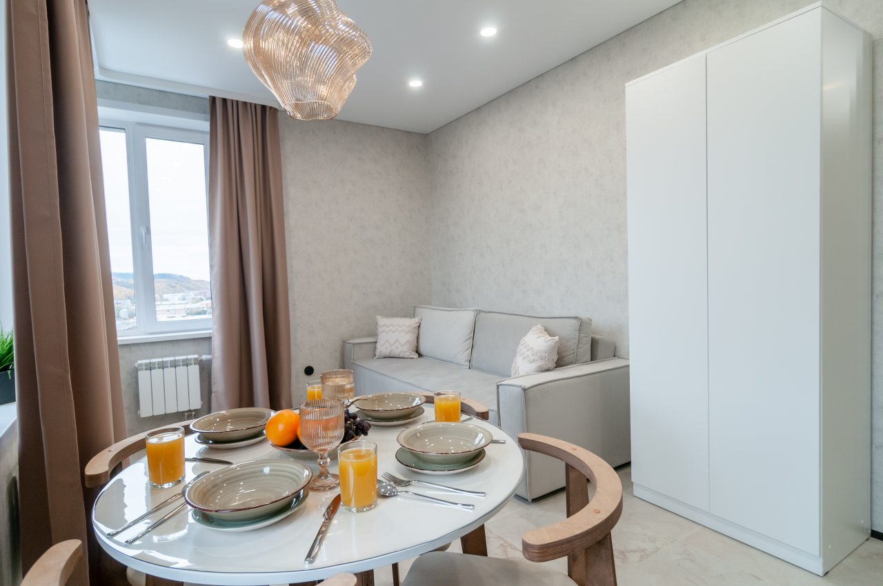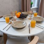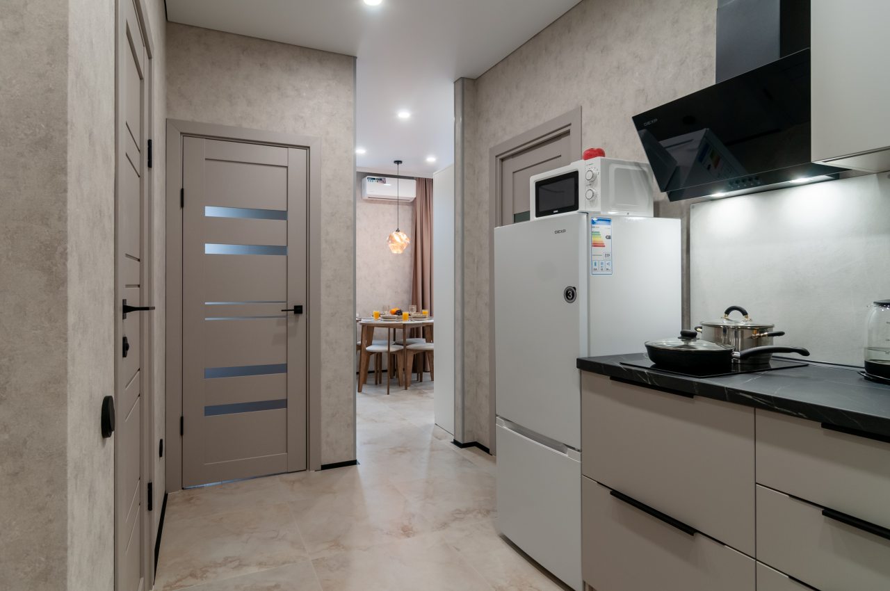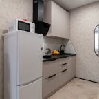 Кухня полностью укомплектована: в наличии индукционная плита, СВЧ, холодильник, чайник, посуда, красивая обеденная зона.