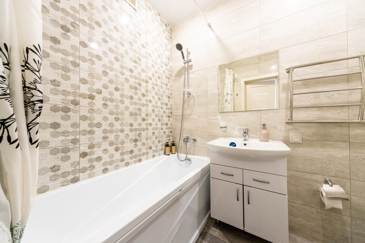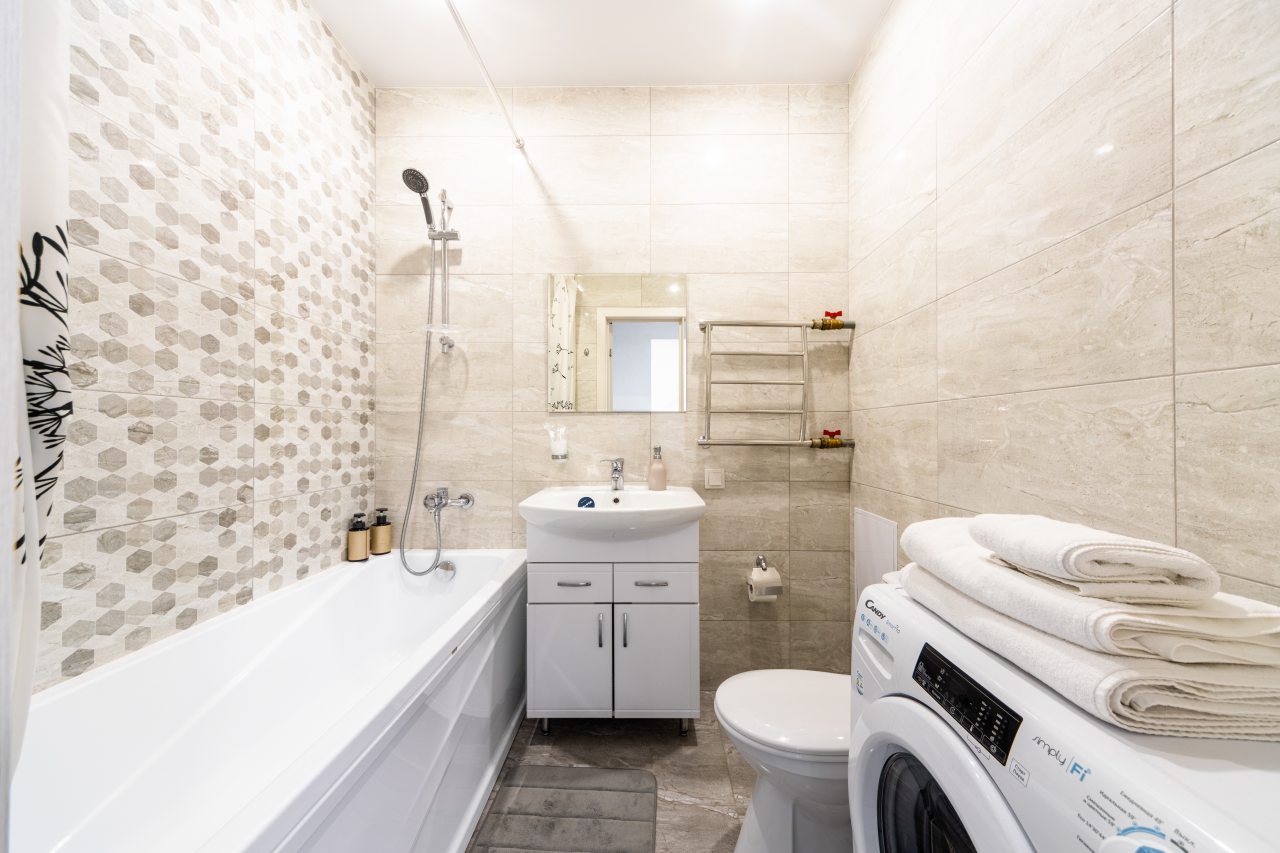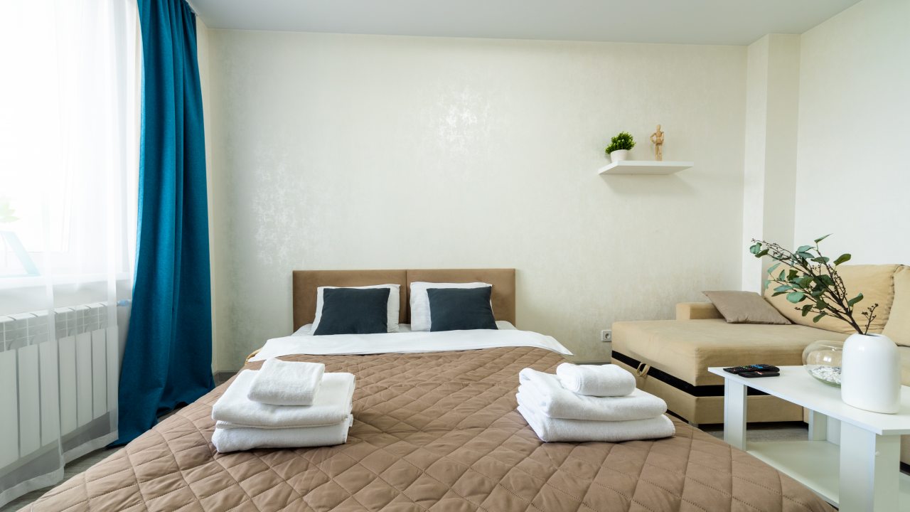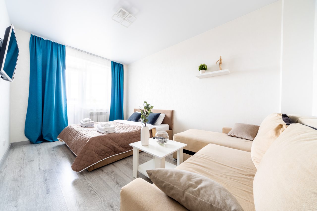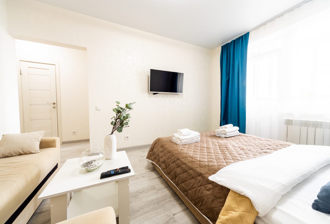 Двуспальная кровать, мягкий диван, телевизор, набор полотенец, плотные шторы, шкаф с зеркалом, гладильные принадлежности, стиральная машина, полноценная ванна — все это ожидает вас внутри апартаментов.