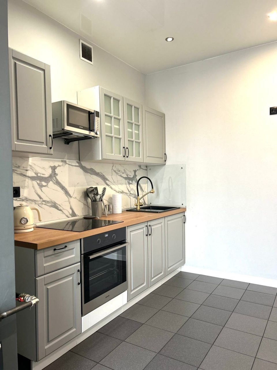 Просторная кухня укомплектована микроволновой печью, электрическим чайником, варочной панелью и посудой. В шаговой доступности продовольственный магазин и кафе.