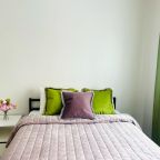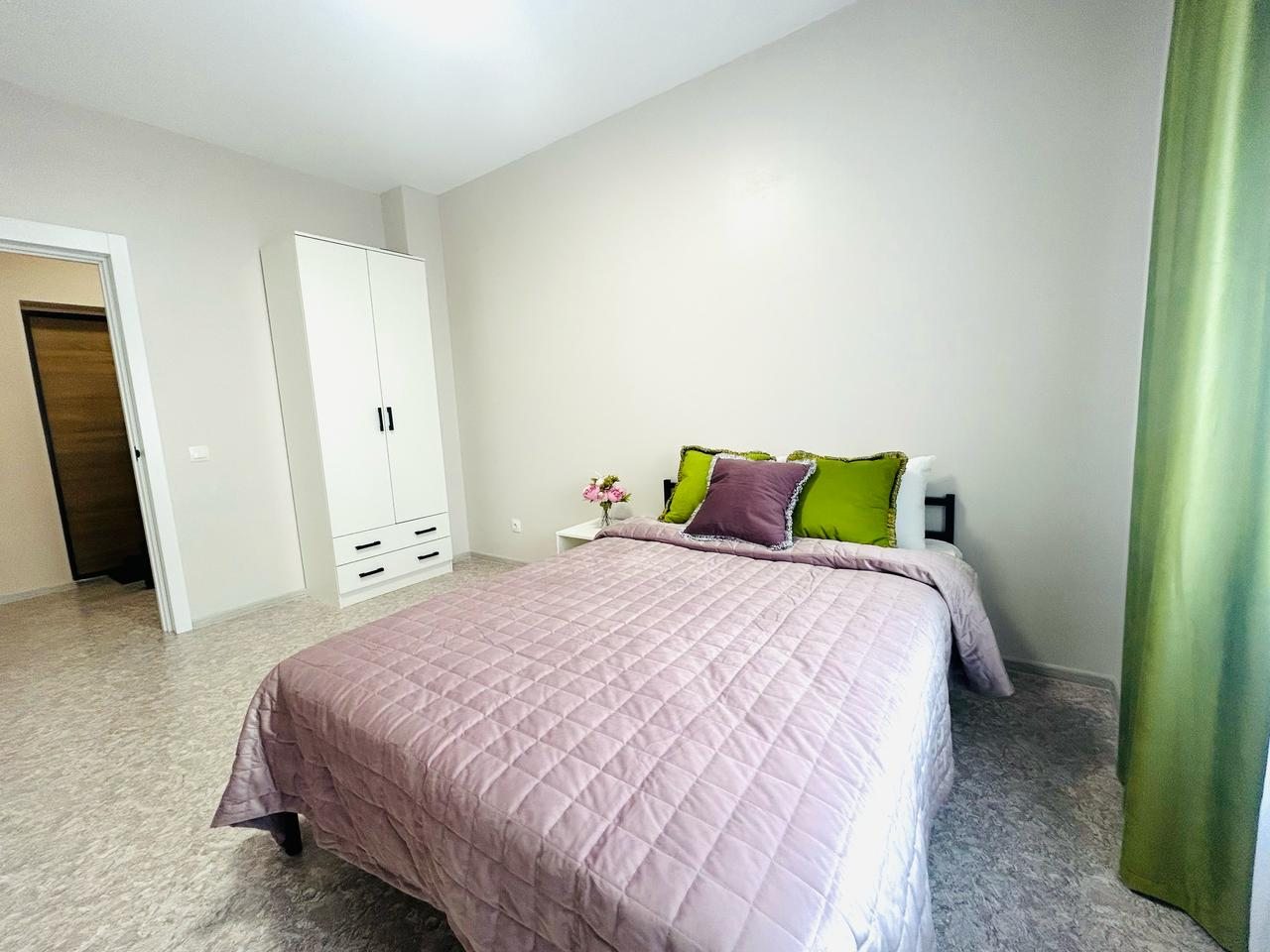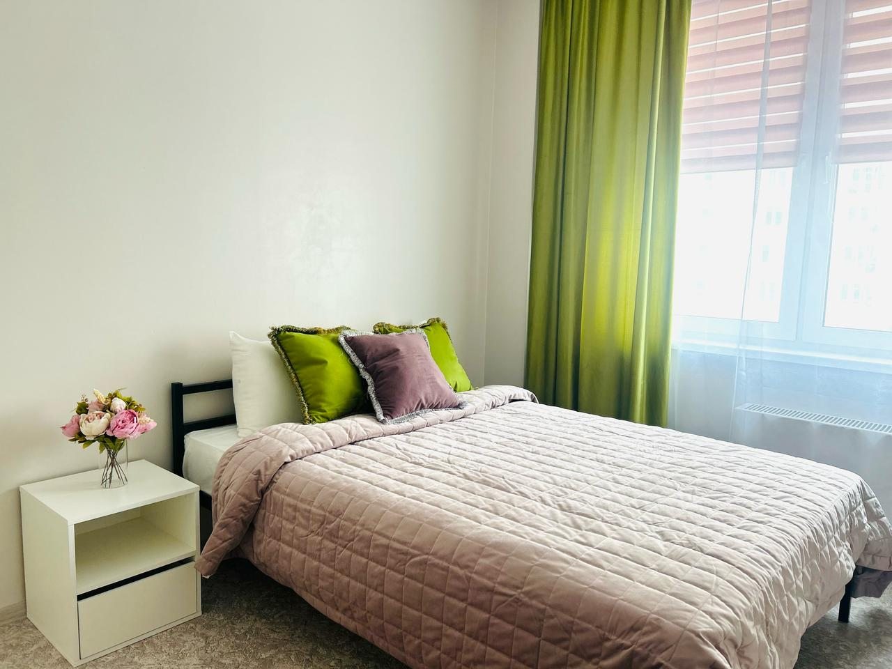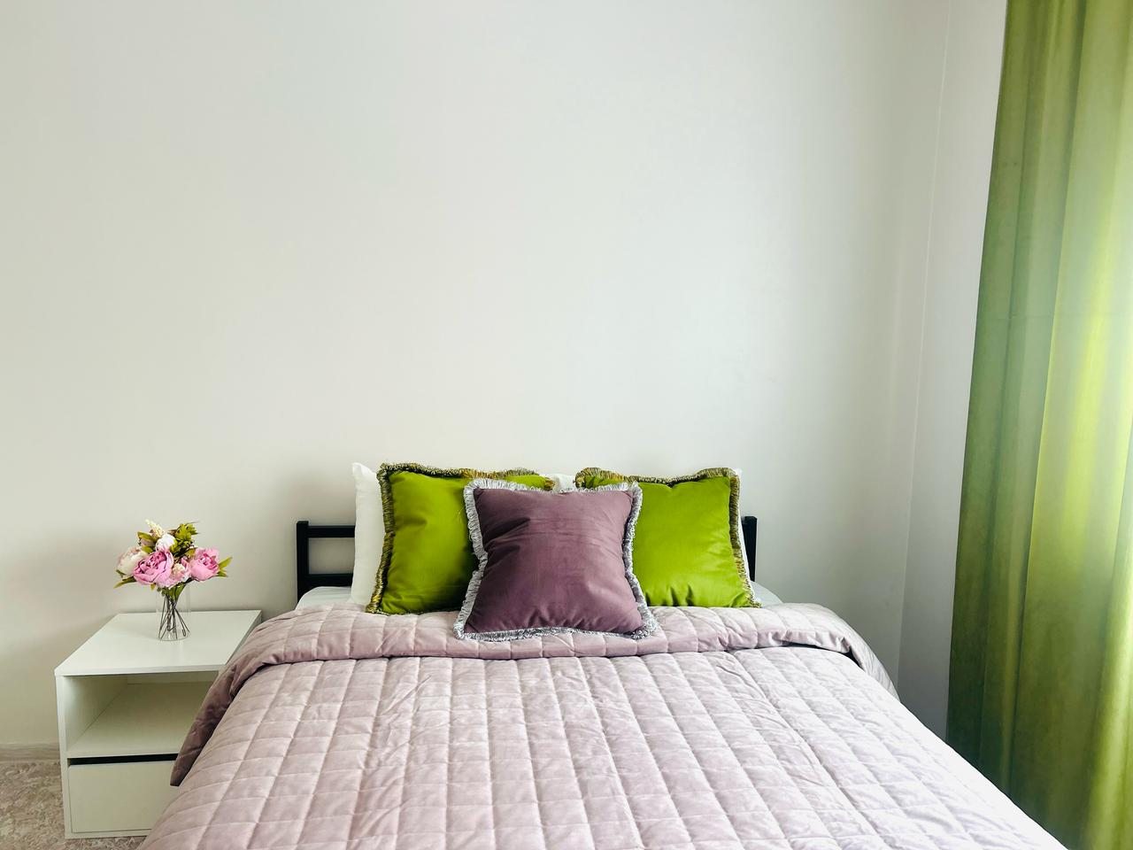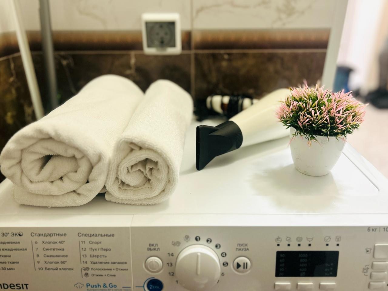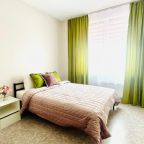 Двуспальная кровать с удобным матрасом, телевизор с мягким диваном, затемнённые шторы, шкаф, а также ванная комната со стиральной машиной — всё это ждет гостей внутри.