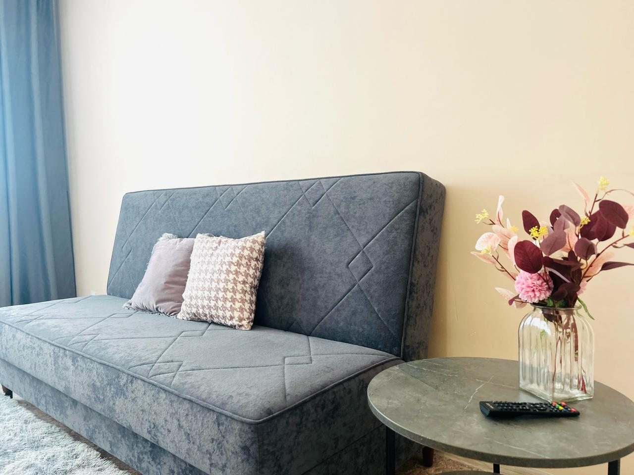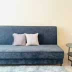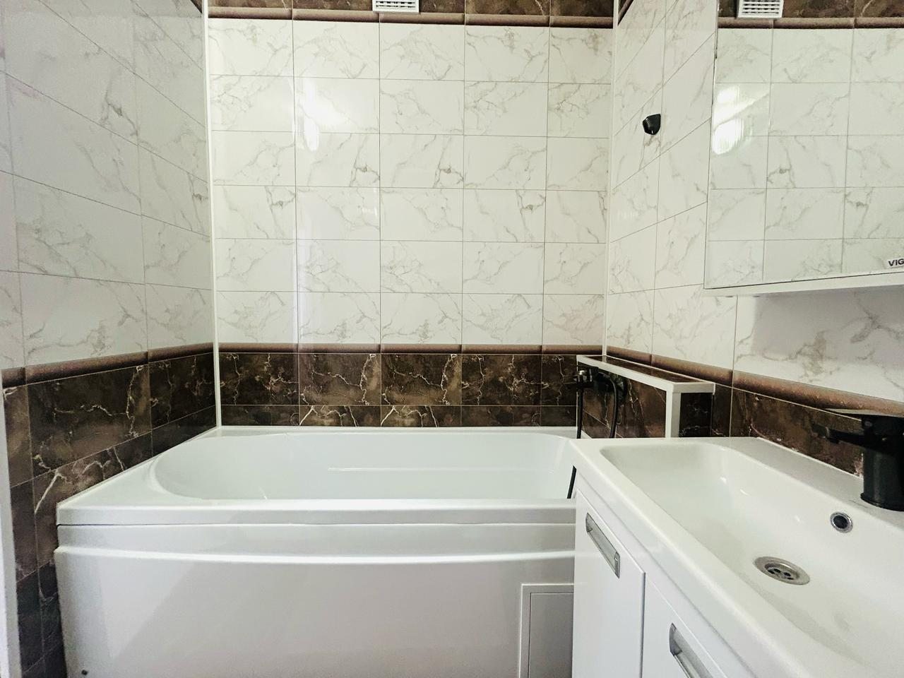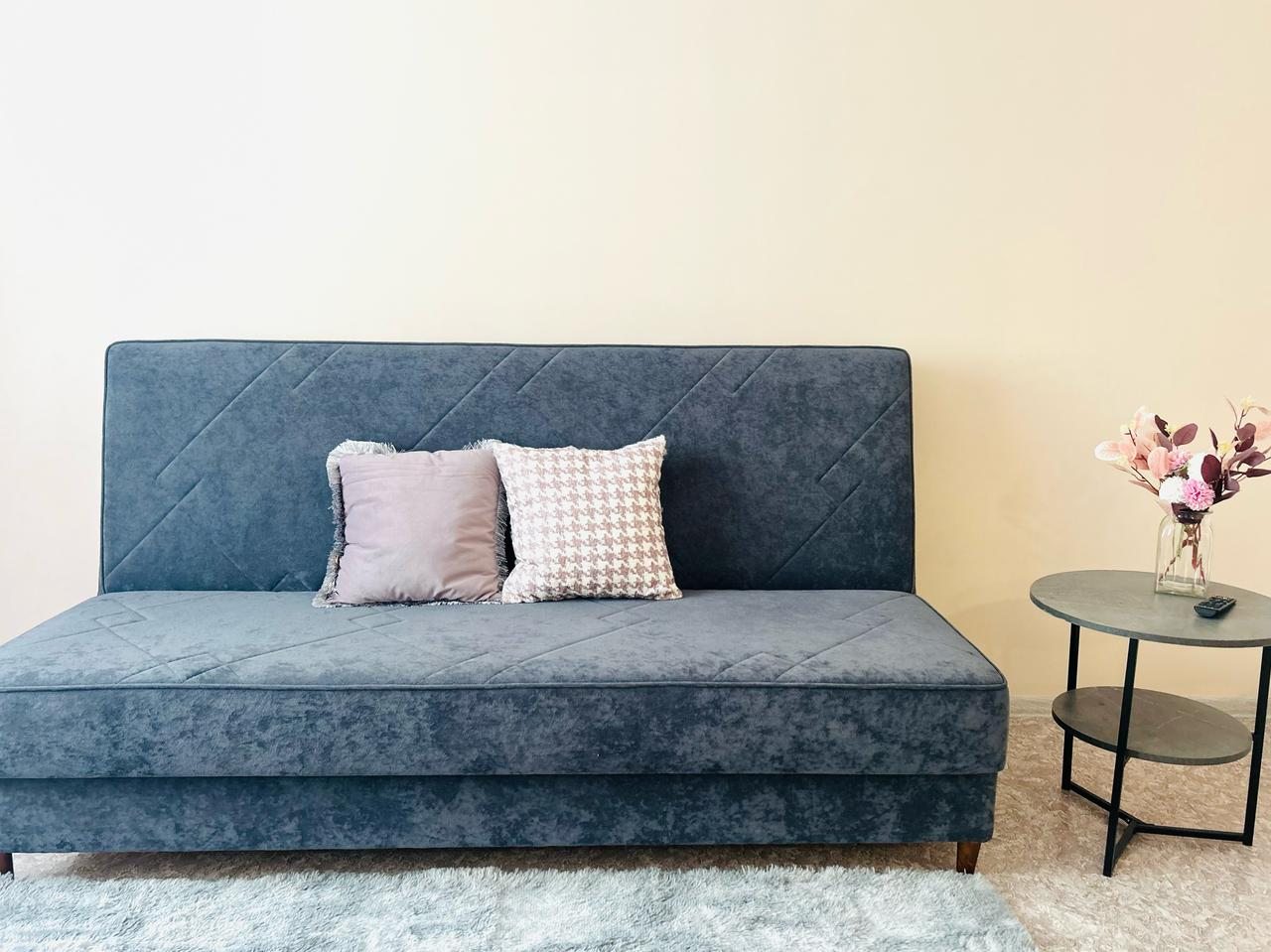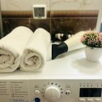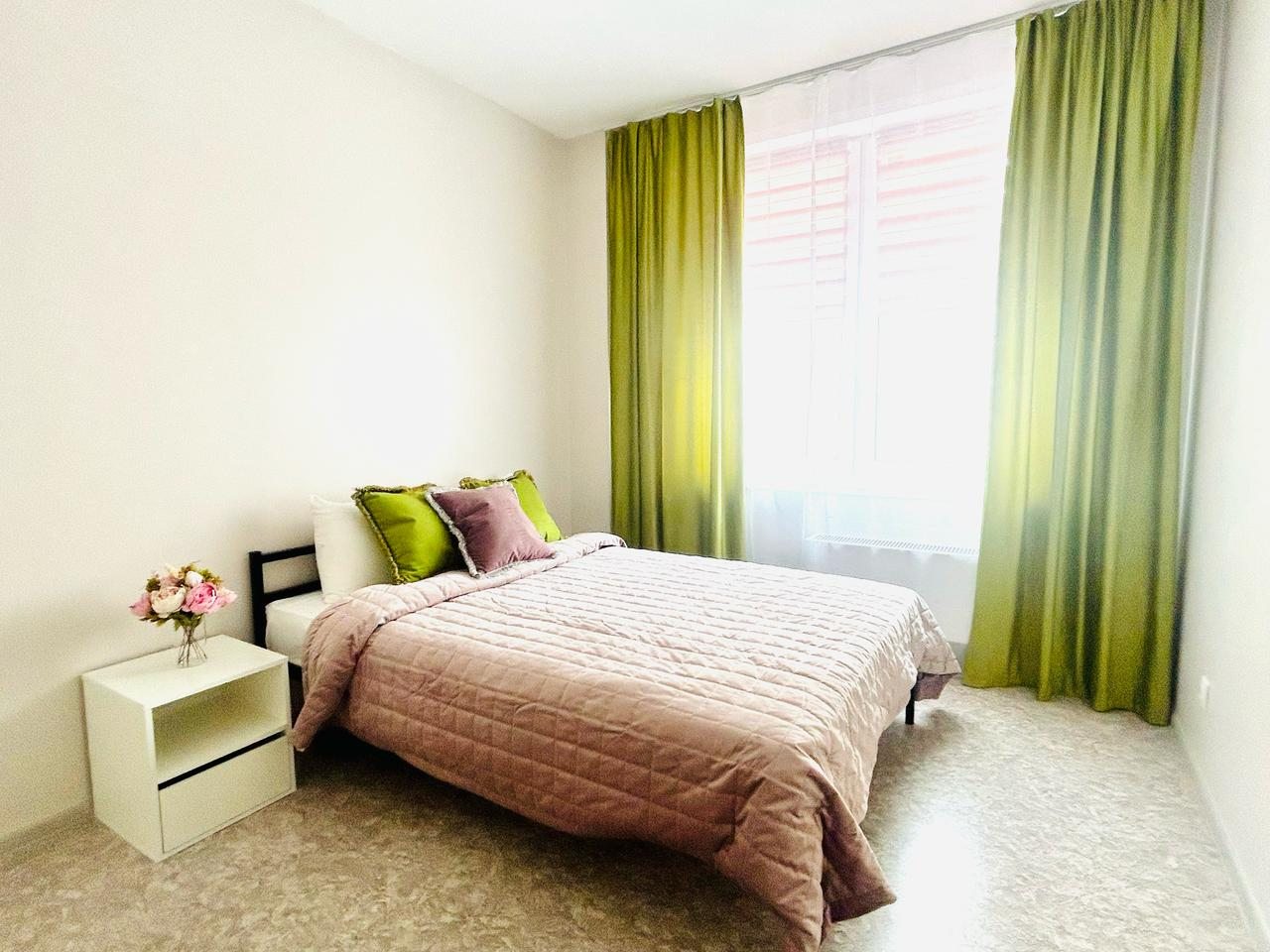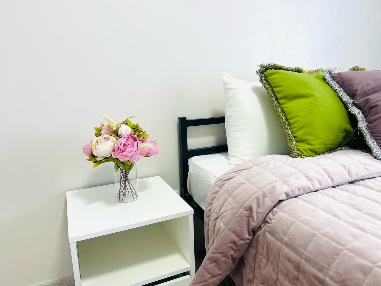 Двуспальная кровать с удобным матрасом, телевизор с мягким диваном, затемнённые шторы, шкаф, а также ванная комната со стиральной машиной — всё это ждет гостей внутри.