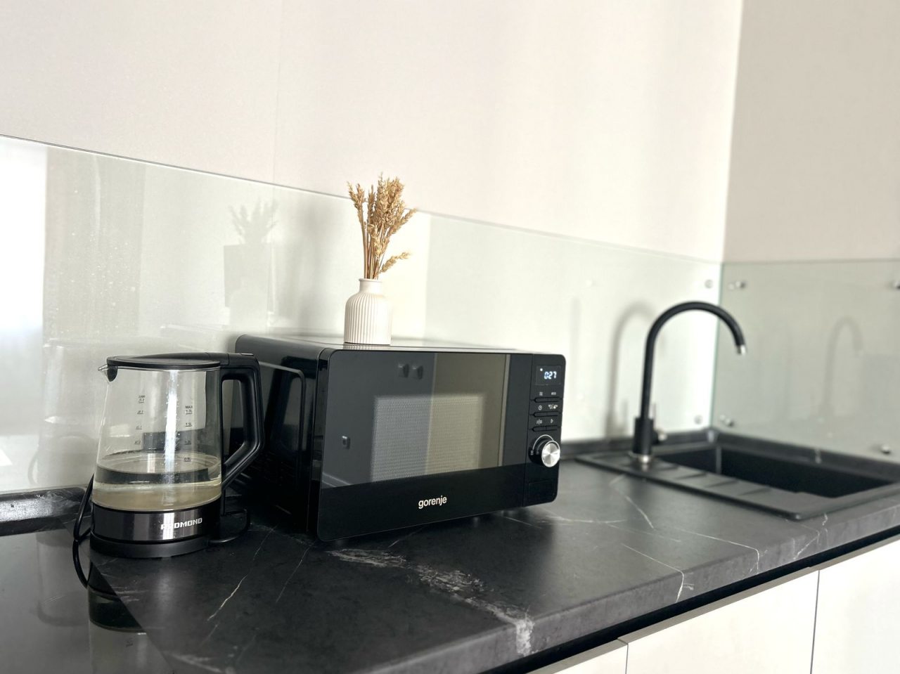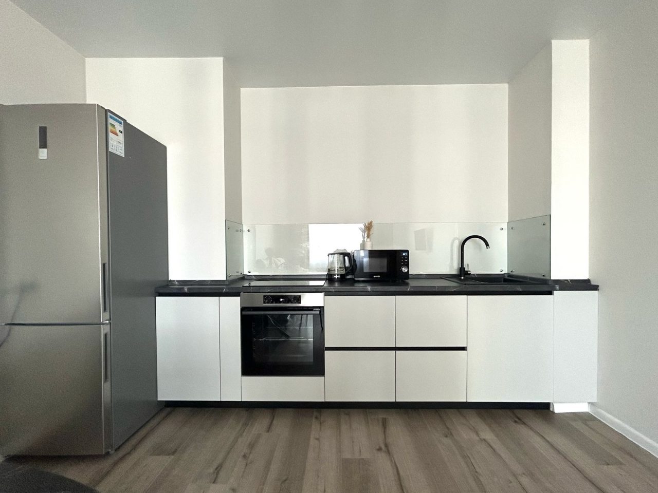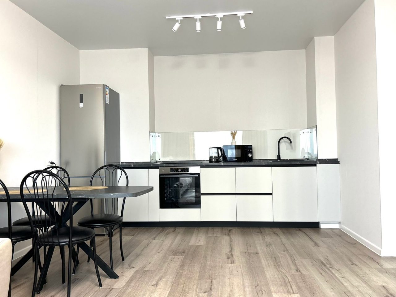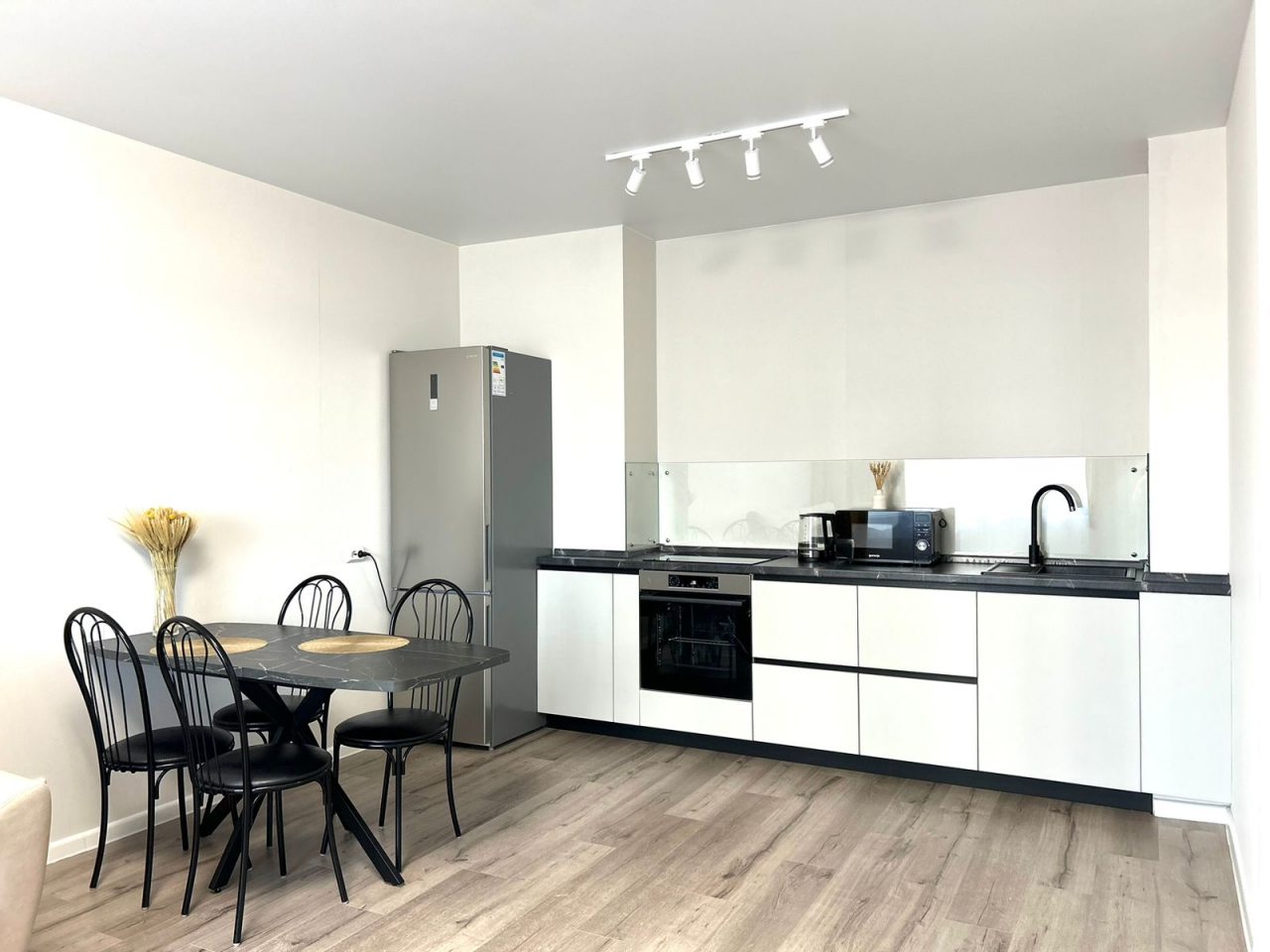 На кухне есть обеденный стол, кухонный гарнитур и бытовая техника для организации питания: варочная панель, двухкамерный холодильник, духовой шкаф, микроволновая печь, чайник. Неподалеку располагается кафе, где можно перекусить.