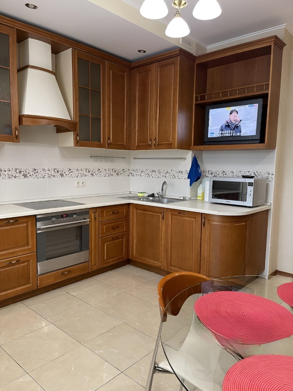На кухне будет приятно готовить домашние напитки и блюда, так как в наличии духовой шкаф, варочная панель с вытяжкой, СВЧ-печь, холодильник, чайник, красивая обеденная зона.
