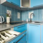 Кухня укомплектована бытовыми приборами для комфортного приготовления блюд: варочная панель, чайник, холодильник, микроволновая печь. Есть уютная обеденная зона на несколько персон. В соседних домах работают несколько заведений питания: столовая, сеть быстрого питания и ресторан.