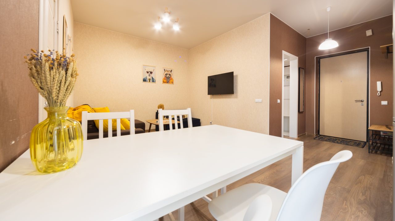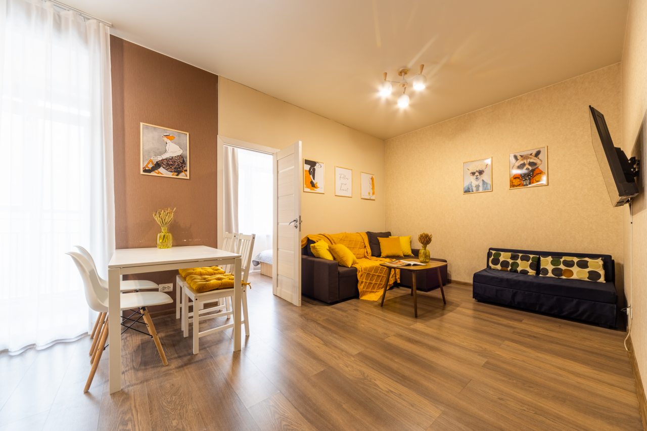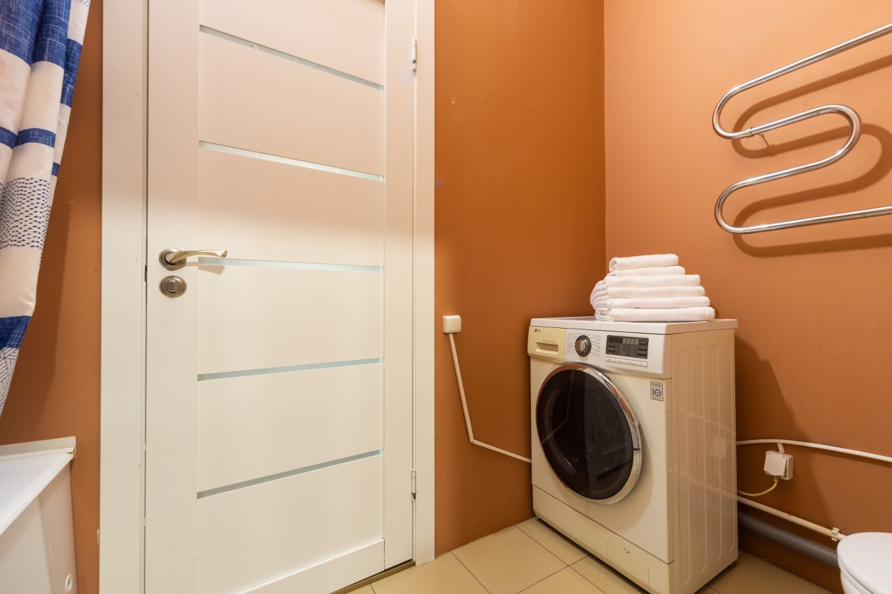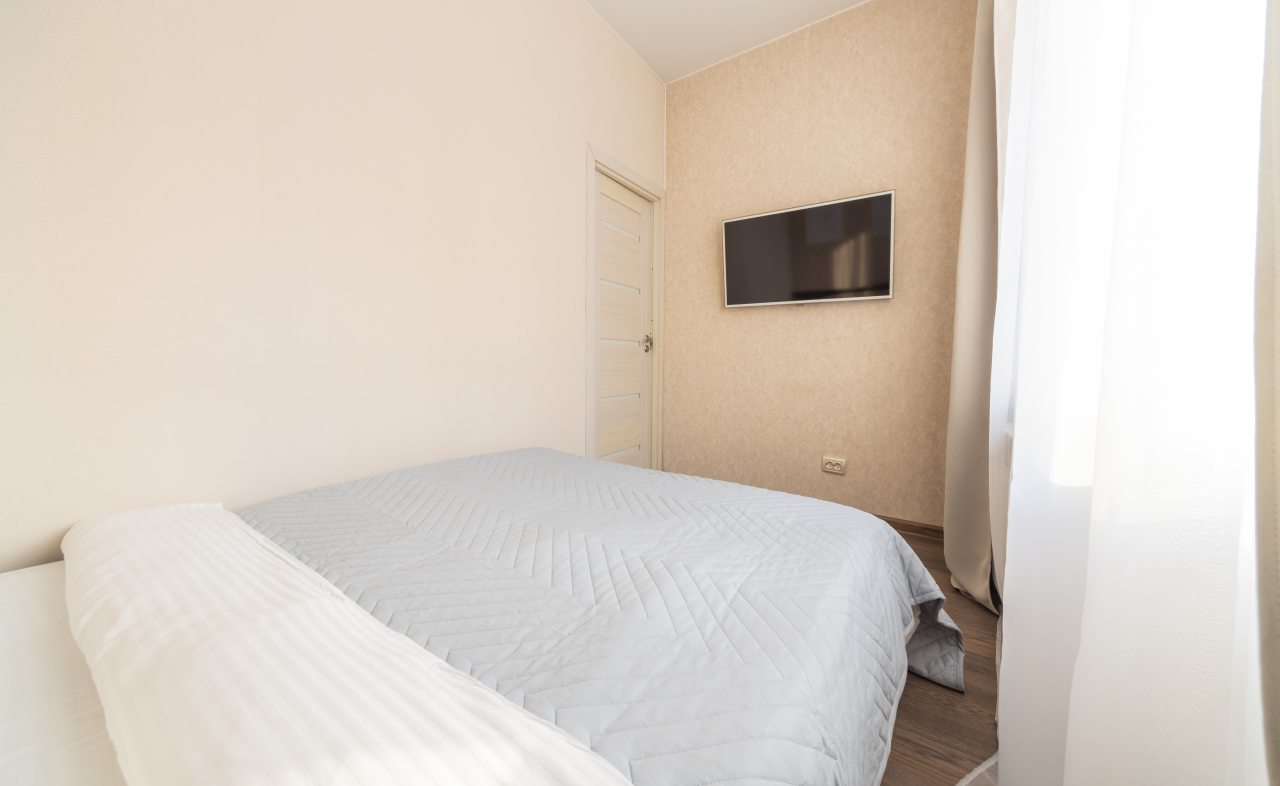Большая и комфортная для сна кровать, мягкий диван, телевизор, балкон с панорамным остеклением, набор полотенец, вместительная гардеробная, стиральная машина, полноценная ванна, гигиенические принадлежности — все это вы обнаружите внутри апартаментов.