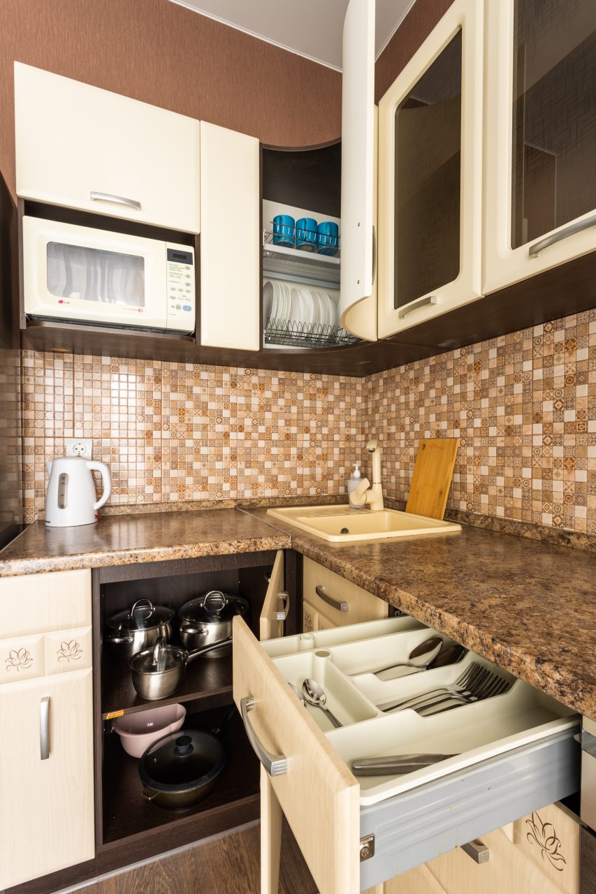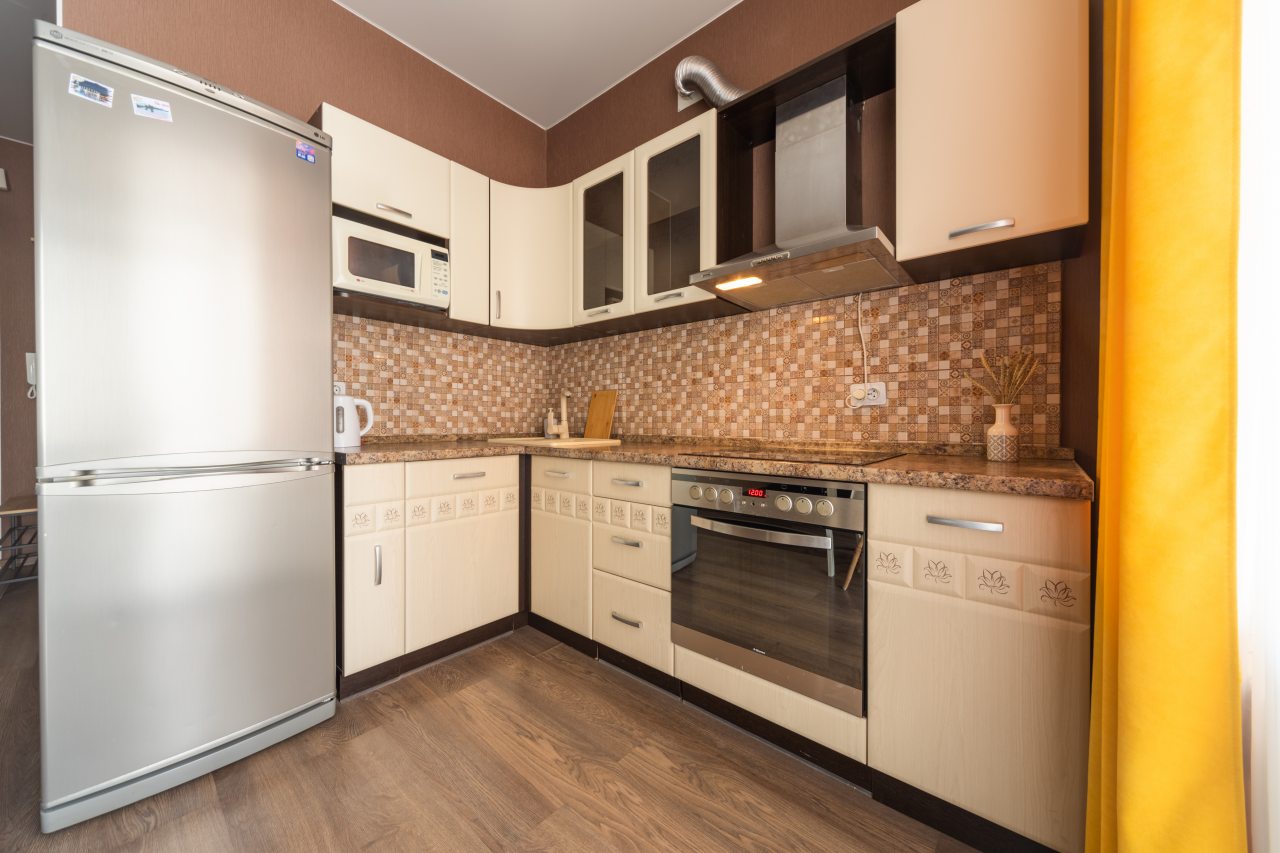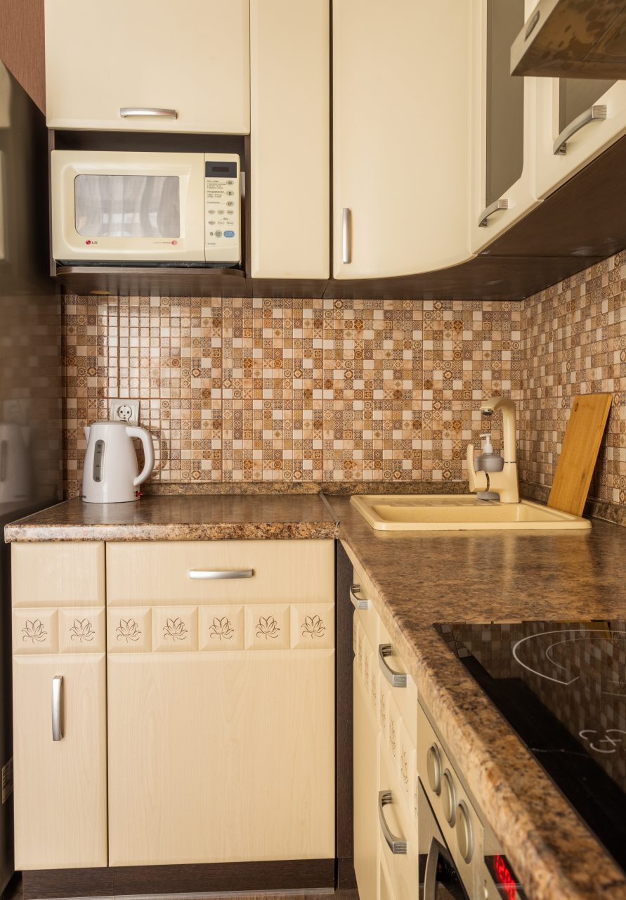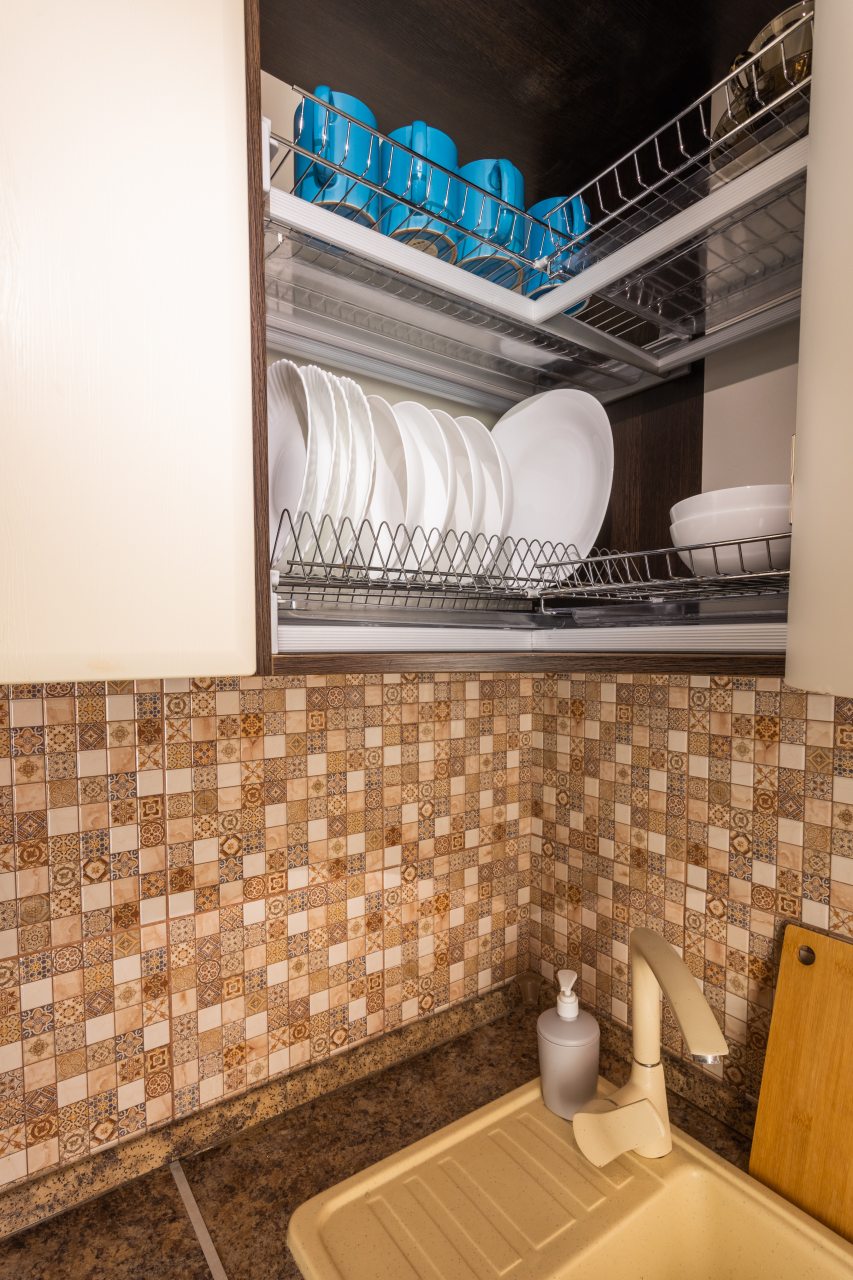 Кухонная зона позволит вам готовить любимые домашние блюда, так как в наличии уютная обеденная зона, духовой шкаф, плита, СВЧ-печь, чайник, холодильник.