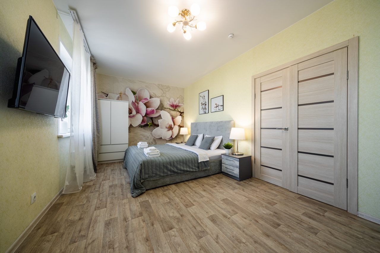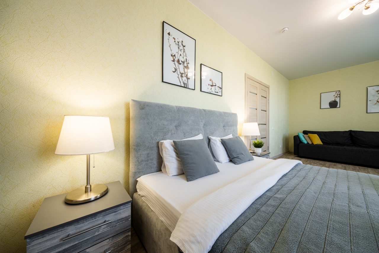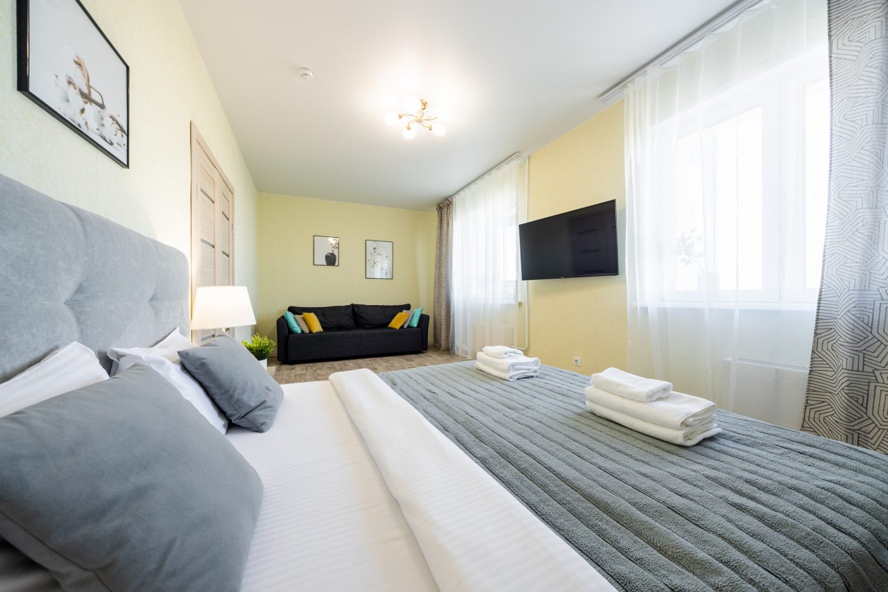 Внутри вы обнаружите всё, что может потребоваться для качественного отдыха и проживания, включая большую кровать с удобным матрасом, ЖК-телевизор, шкаф, прикроватную лампу для уютного вечернего света, диван, ванную комнату со средствами для гигиены, а также лоджию с красивым видом на город.