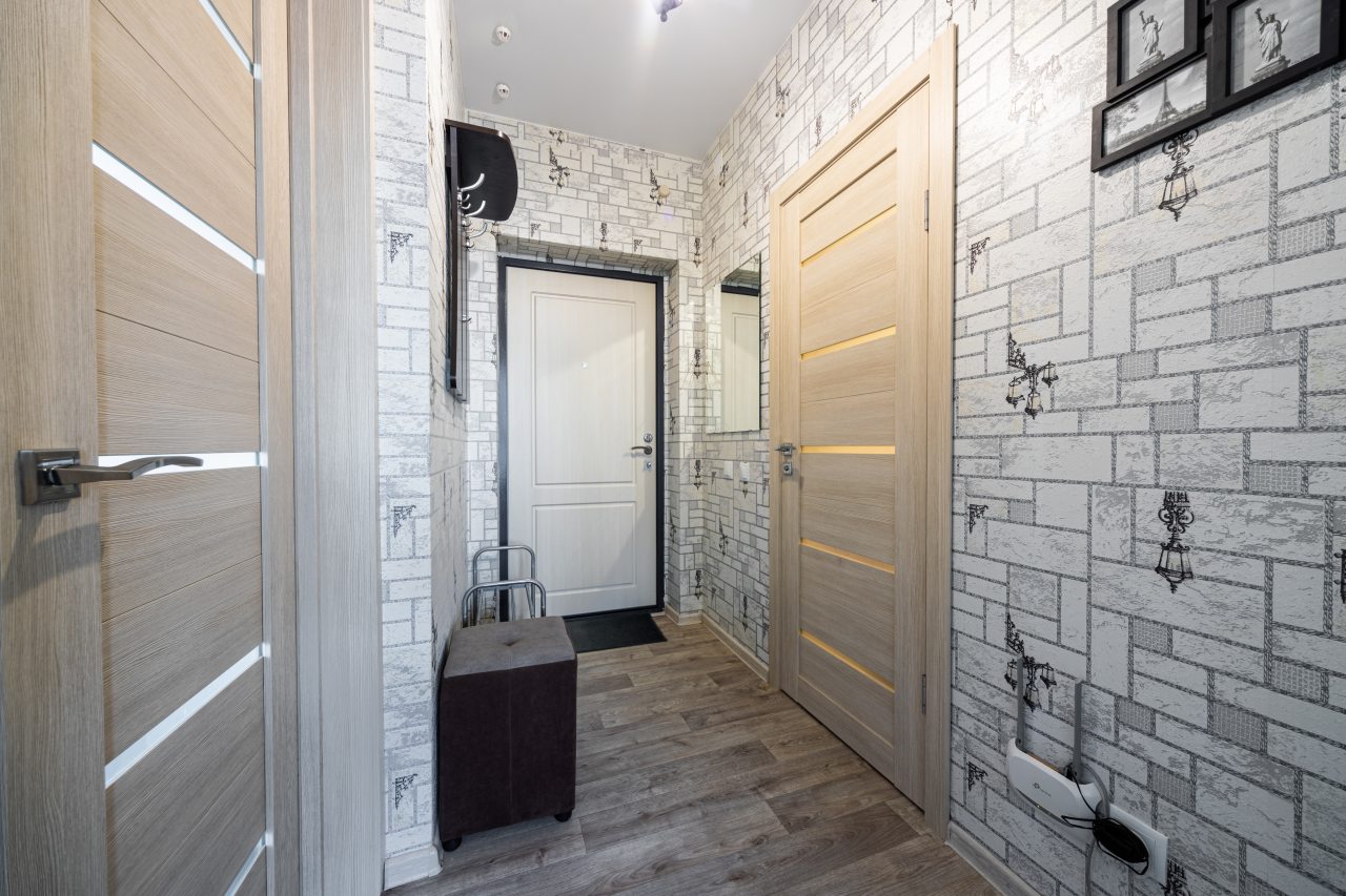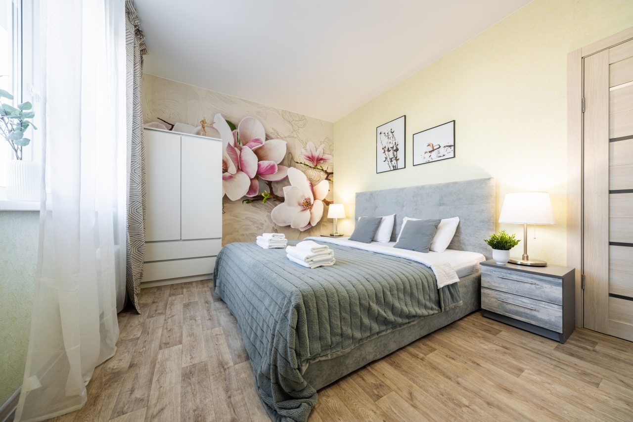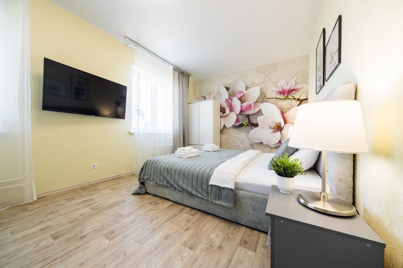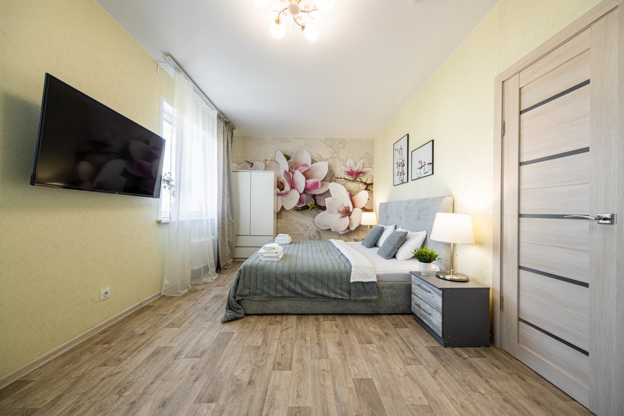 Внутри вы обнаружите всё, что может потребоваться для качественного отдыха и проживания, включая большую кровать с удобным матрасом, ЖК-телевизор, шкаф, прикроватную лампу для уютного вечернего света, диван, ванную комнату со средствами для гигиены, а также лоджию с красивым видом на город.