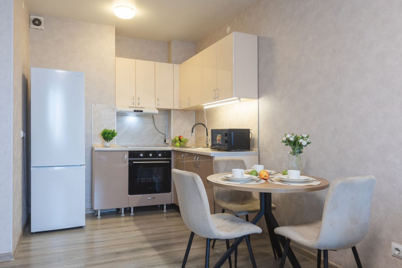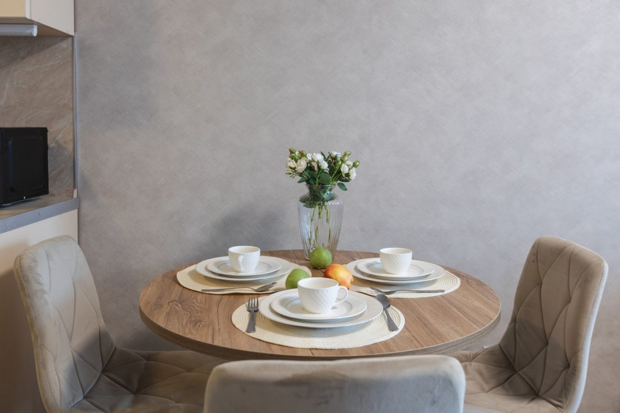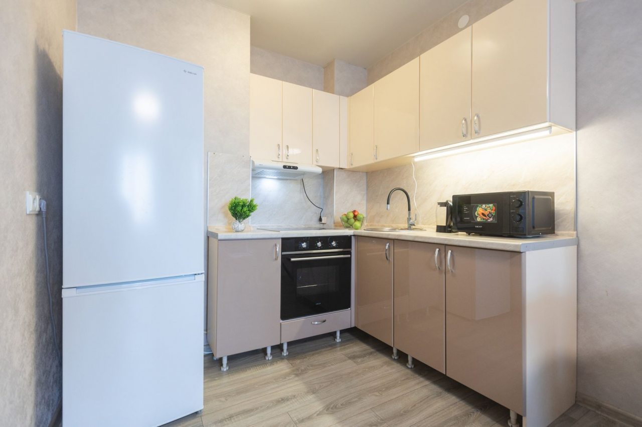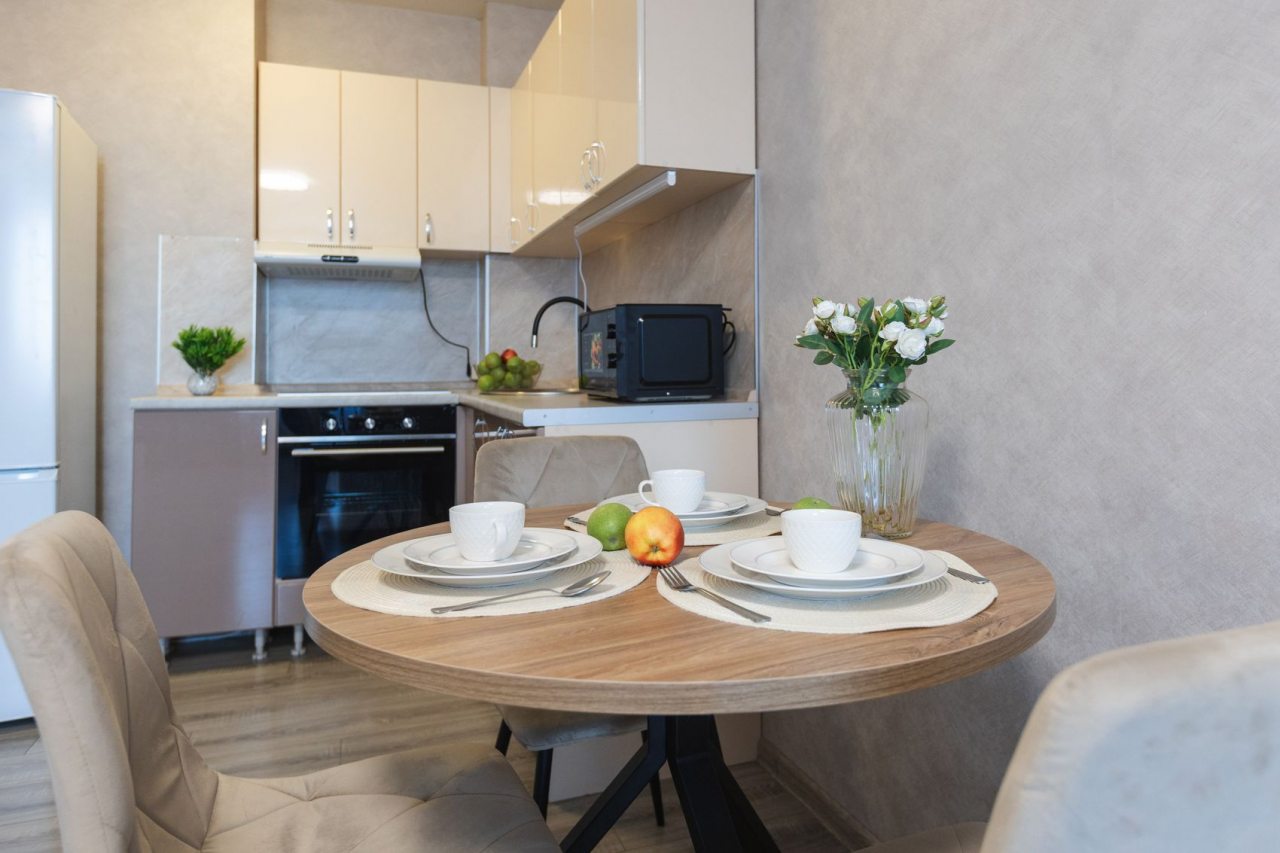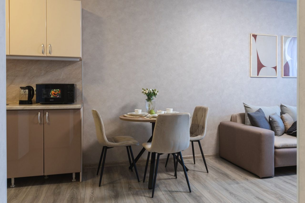 На уютной кухне вы сможете готовить любимые домашние блюда, так как в наличии плита, духовой шкаф, СВЧ-печь, чайник, вытяжка и обеденная зона.
