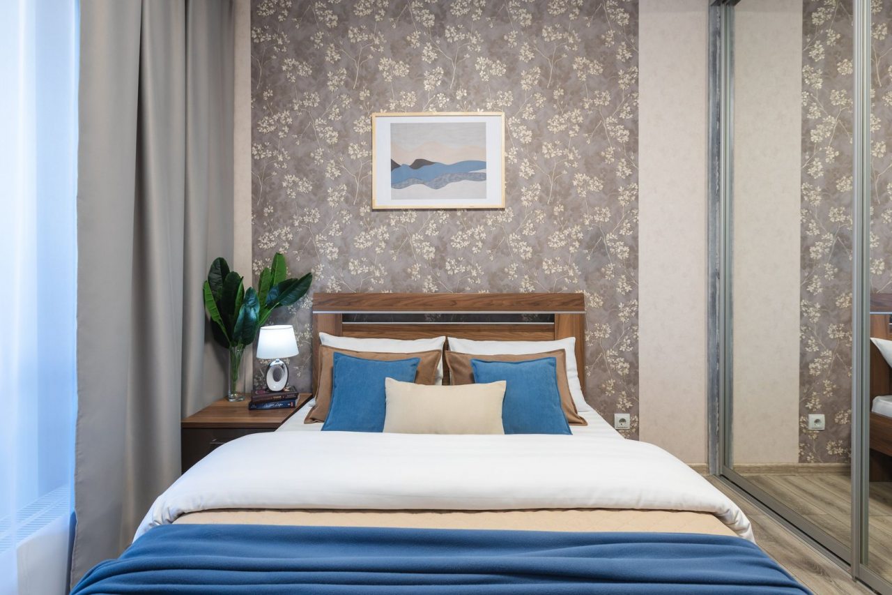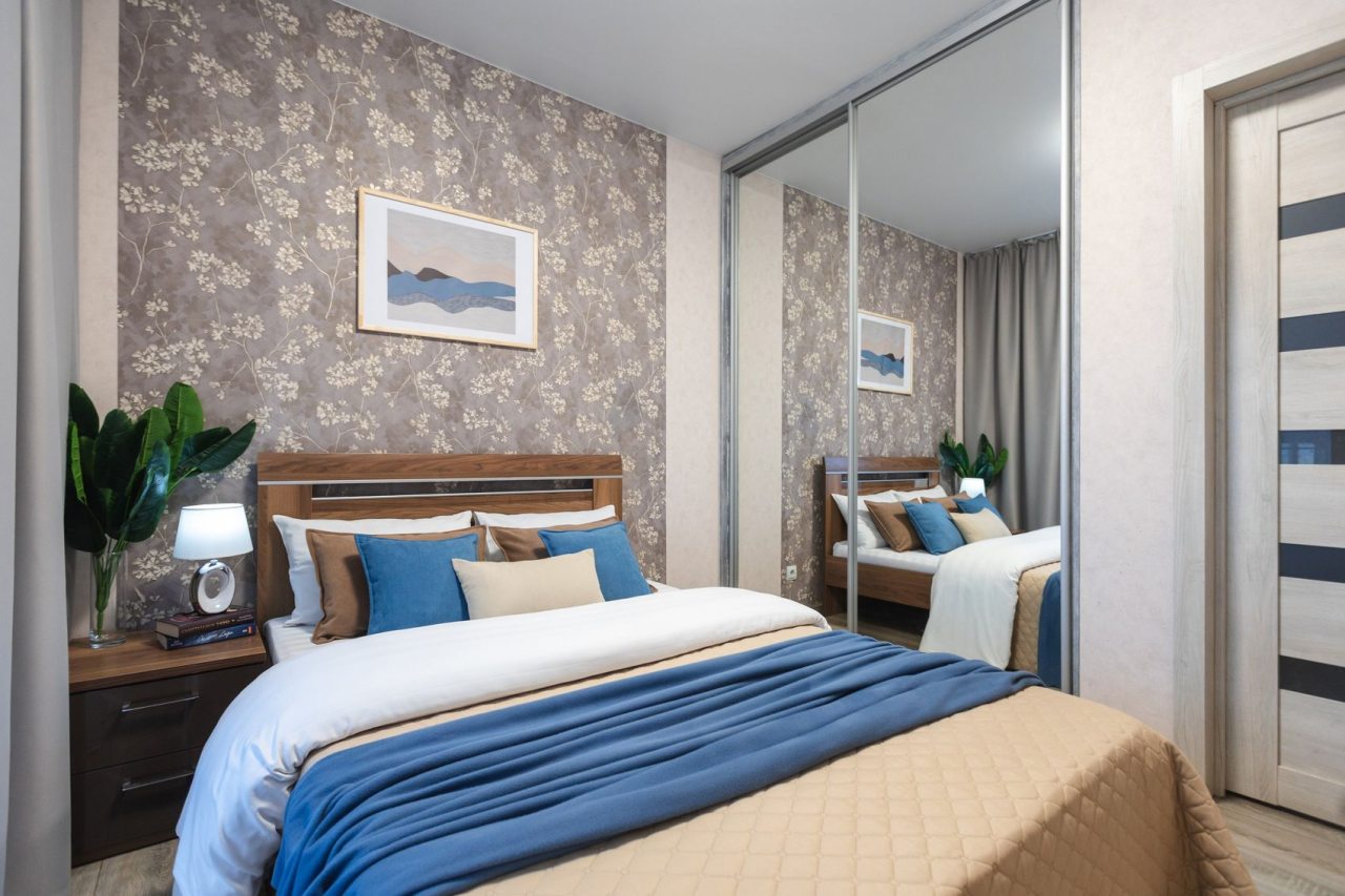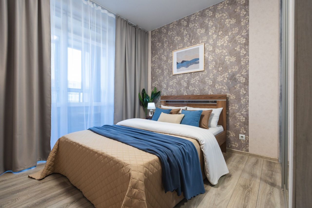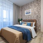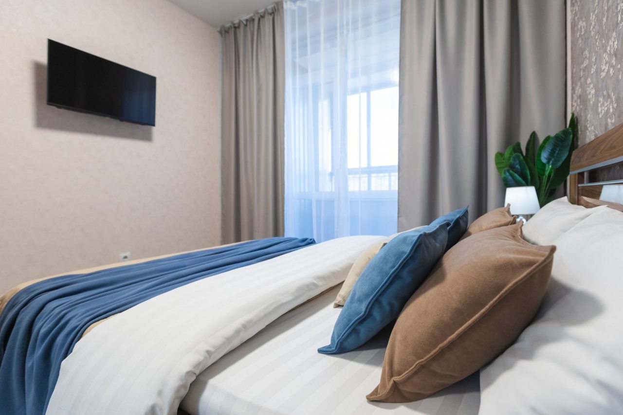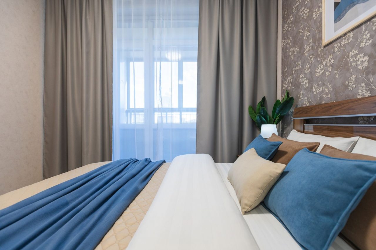 Внутри гостей ожидает удобная двуспальная кровать, телевизор, плотные шторы, вместительный шкаф с зеркалом в полный рост, а также ванная комната со стиральной машиной и феном.