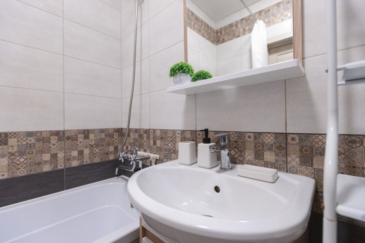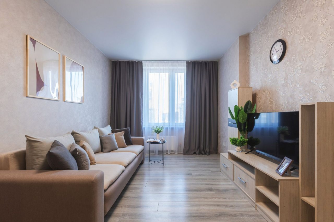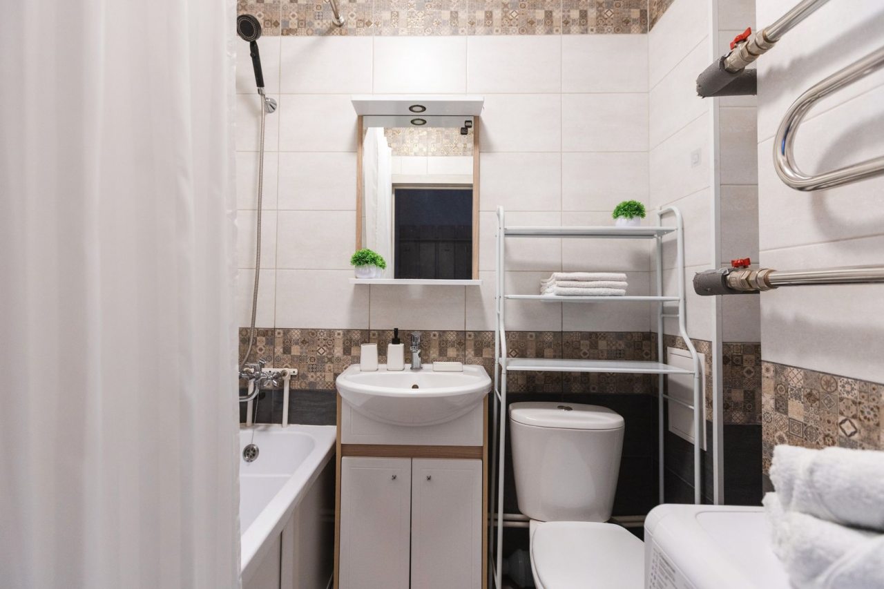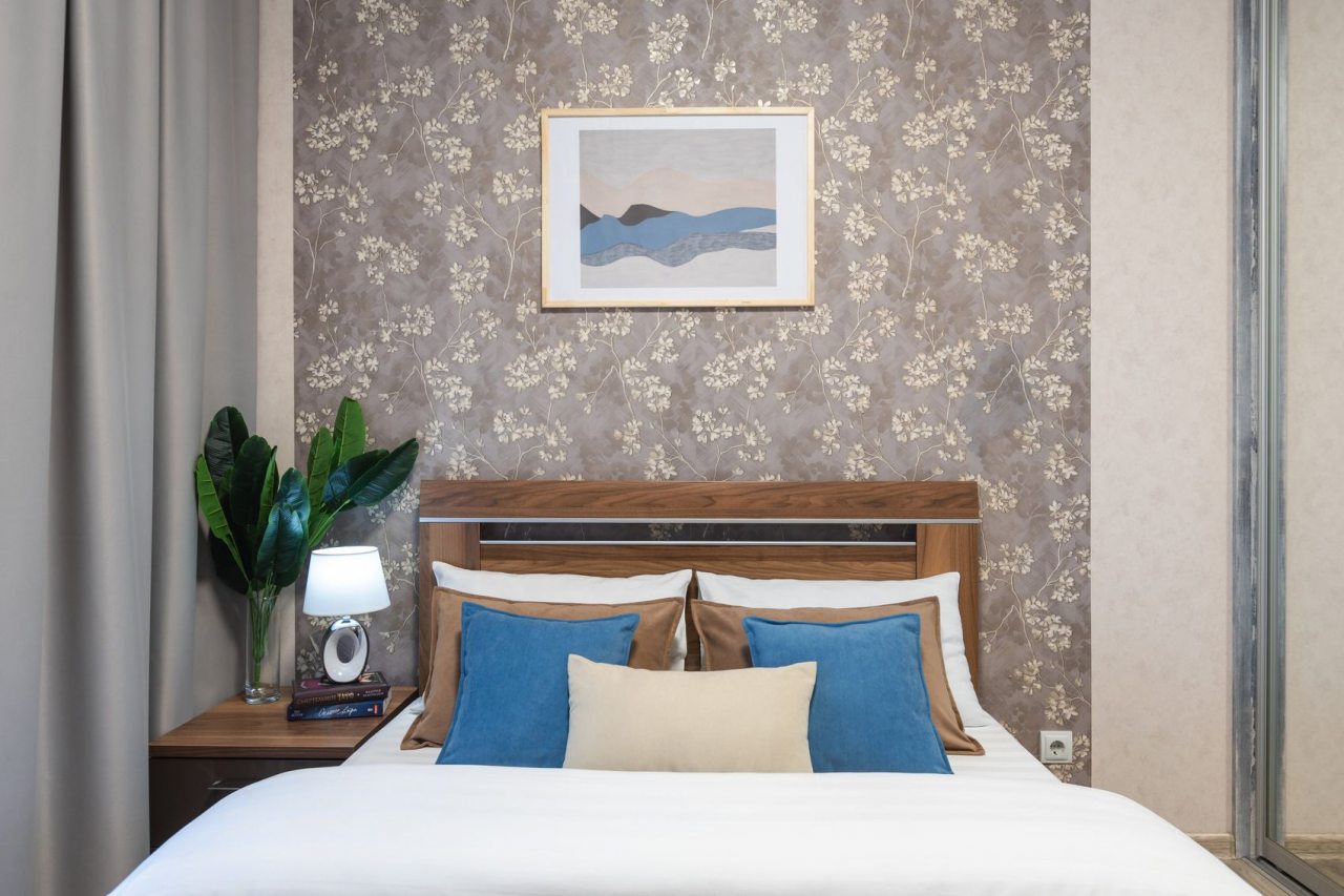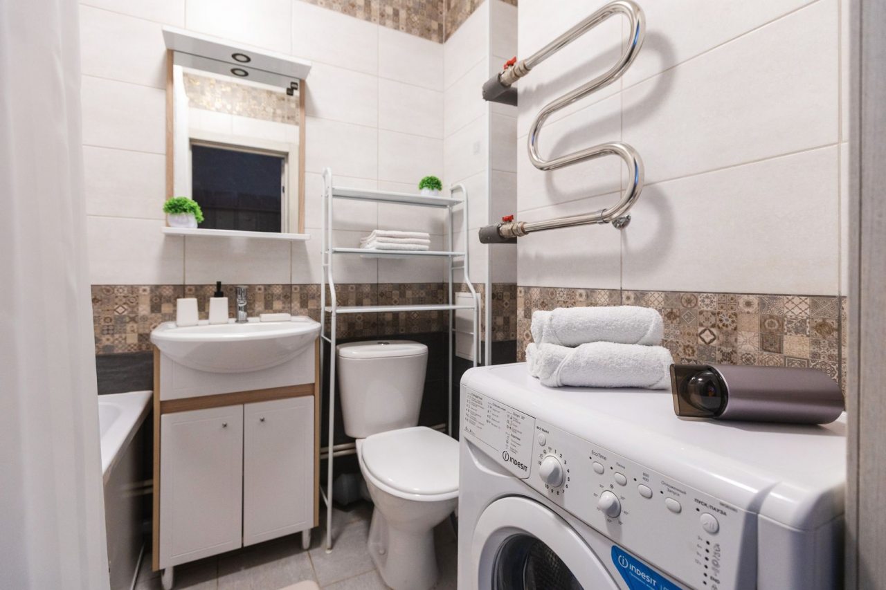 Внутри гостей ожидает удобная двуспальная кровать, телевизор, плотные шторы, вместительный шкаф с зеркалом в полный рост, а также ванная комната со стиральной машиной и феном.