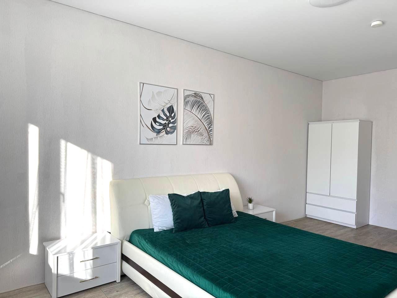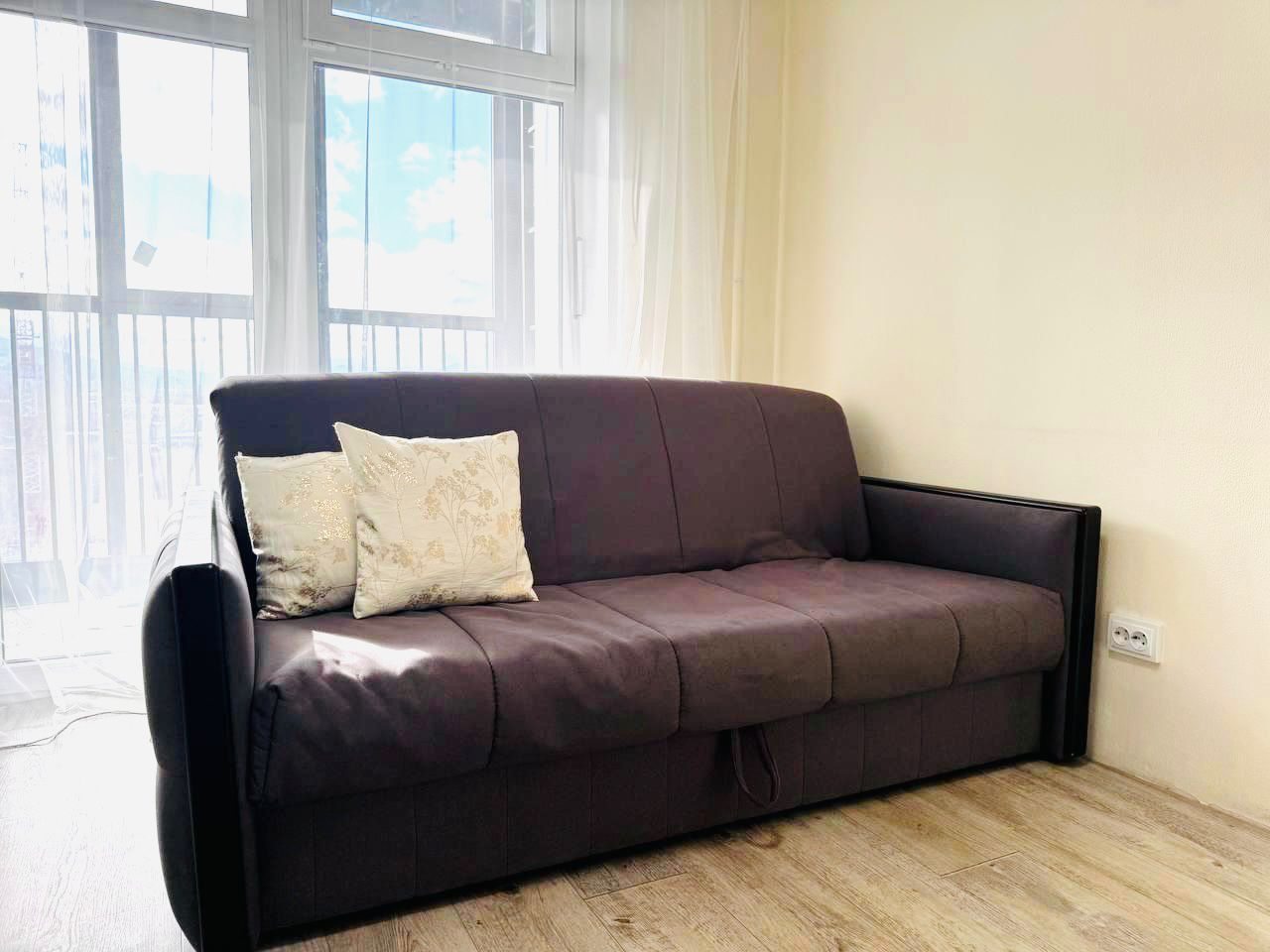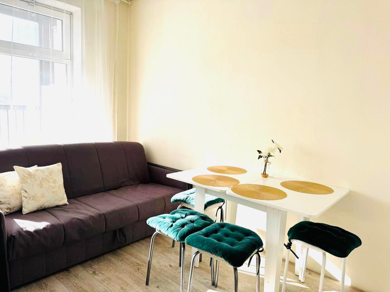 Внутри гостей ожидает удобный и мягкий диван, двуспальная кровать с качественным матрасом, плотные шторы и другая необходимая мебель и техника. В ванной комнате имеется стиральная машина.