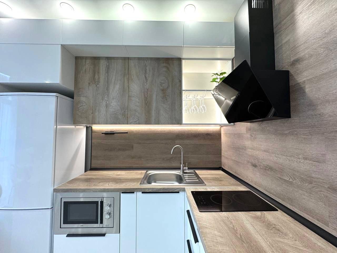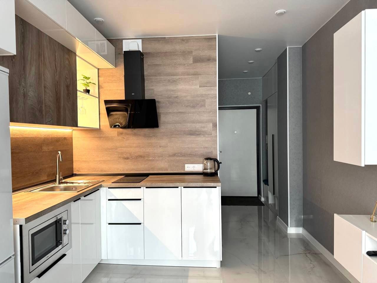 Кухонная зона укомплектована варочной панелью, вытяжкой, СВЧ-печью, холодильником, красивым обеденным столом со стульями, чтобы вы могли готовить любимые блюда.