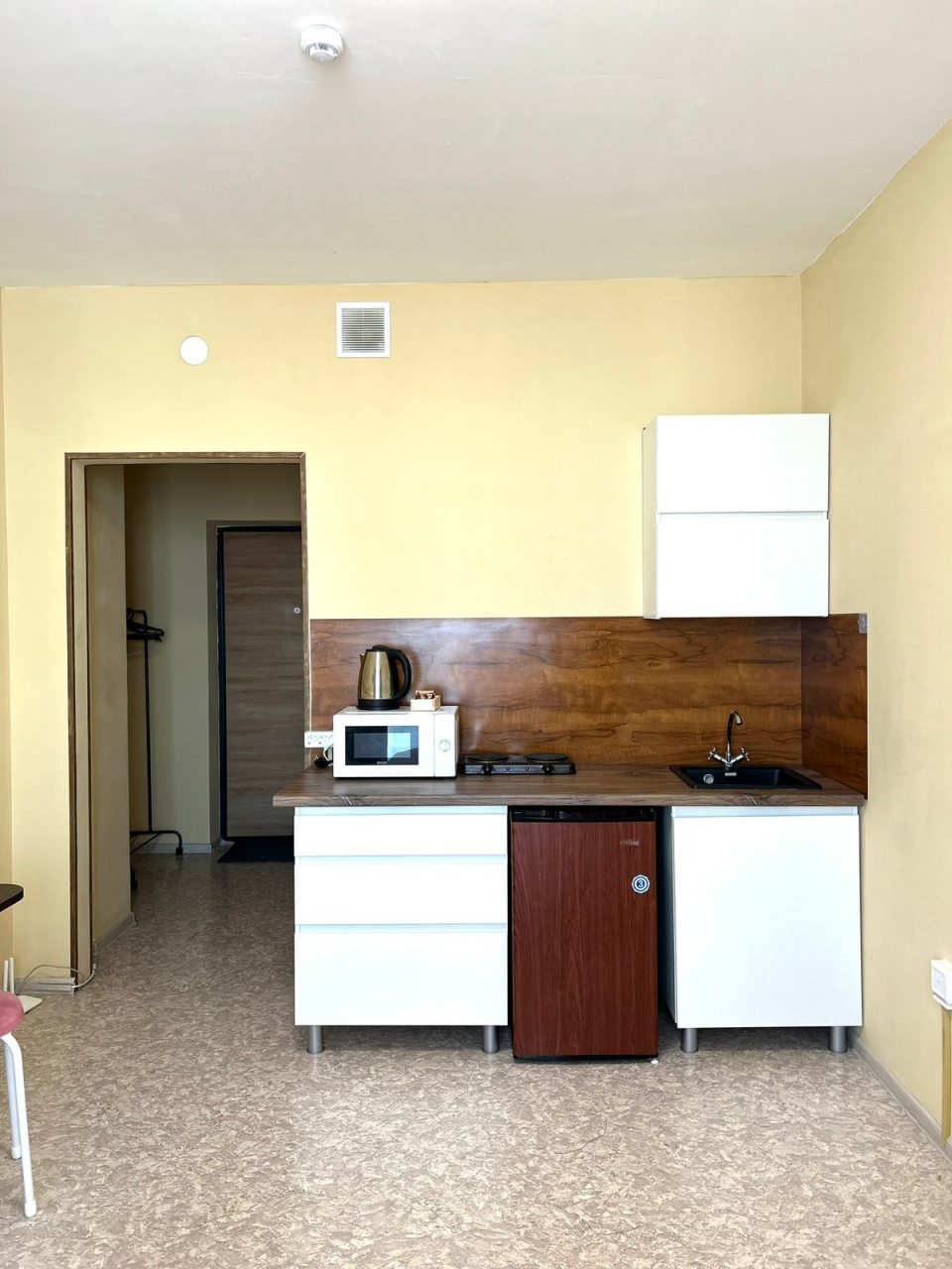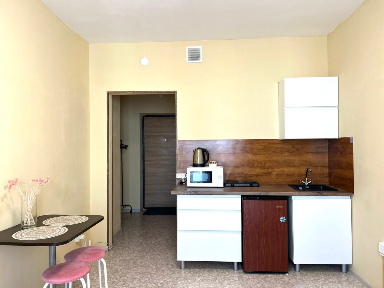 Кухонная зона позволит готовить любимые блюда, так как в наличии плита, мини-холодильник, СВЧ-печь, чайник и обеденная зона.