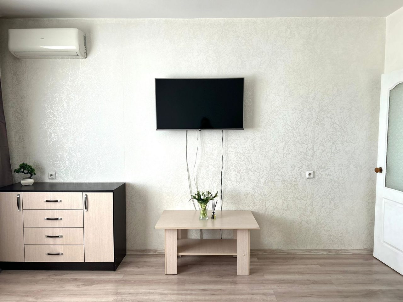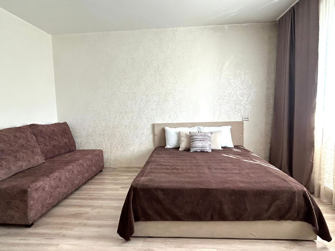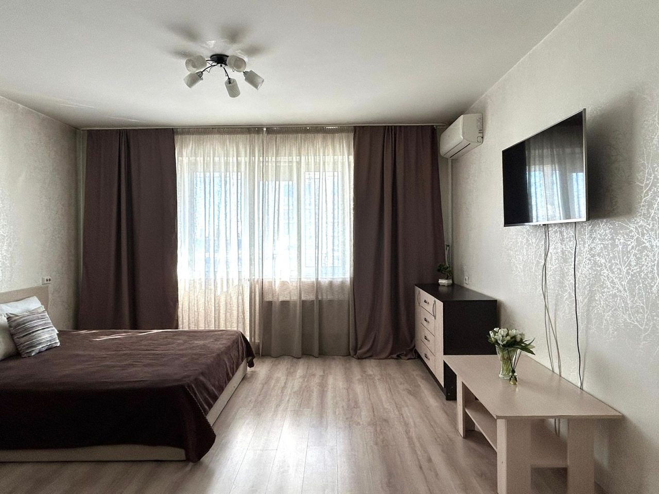 Внутри продумано всё для комфортного проживания и отдыха гостей, в том числе удобная кровать, комод, вместительный шкаф-купе с зеркалом в полный рост, мягкий диван, кондиционер, телевизор, стиральная машина, а также полноценная ванна.