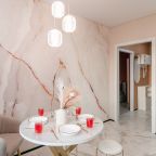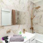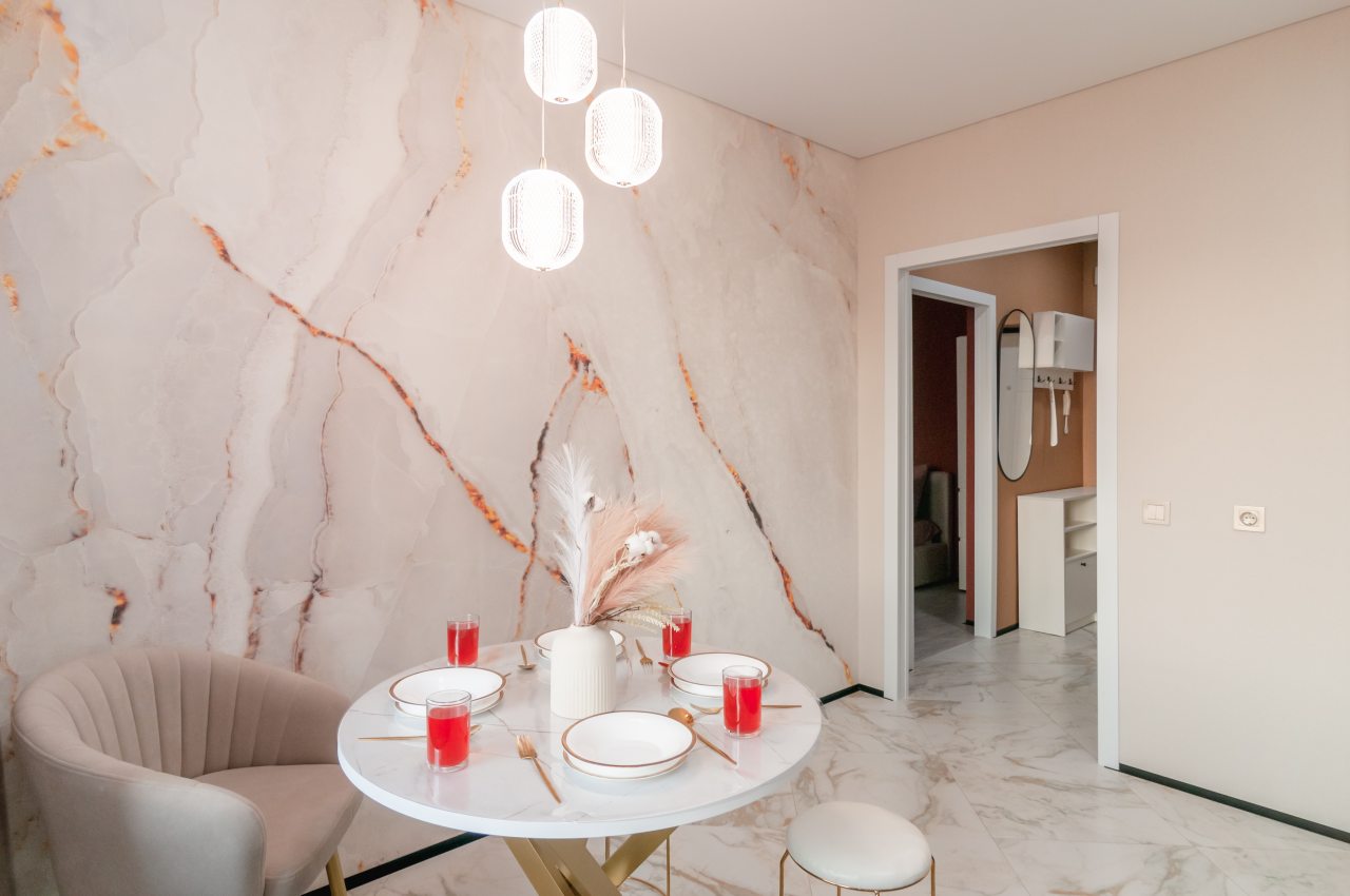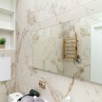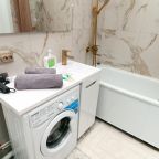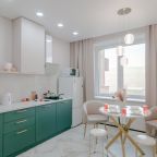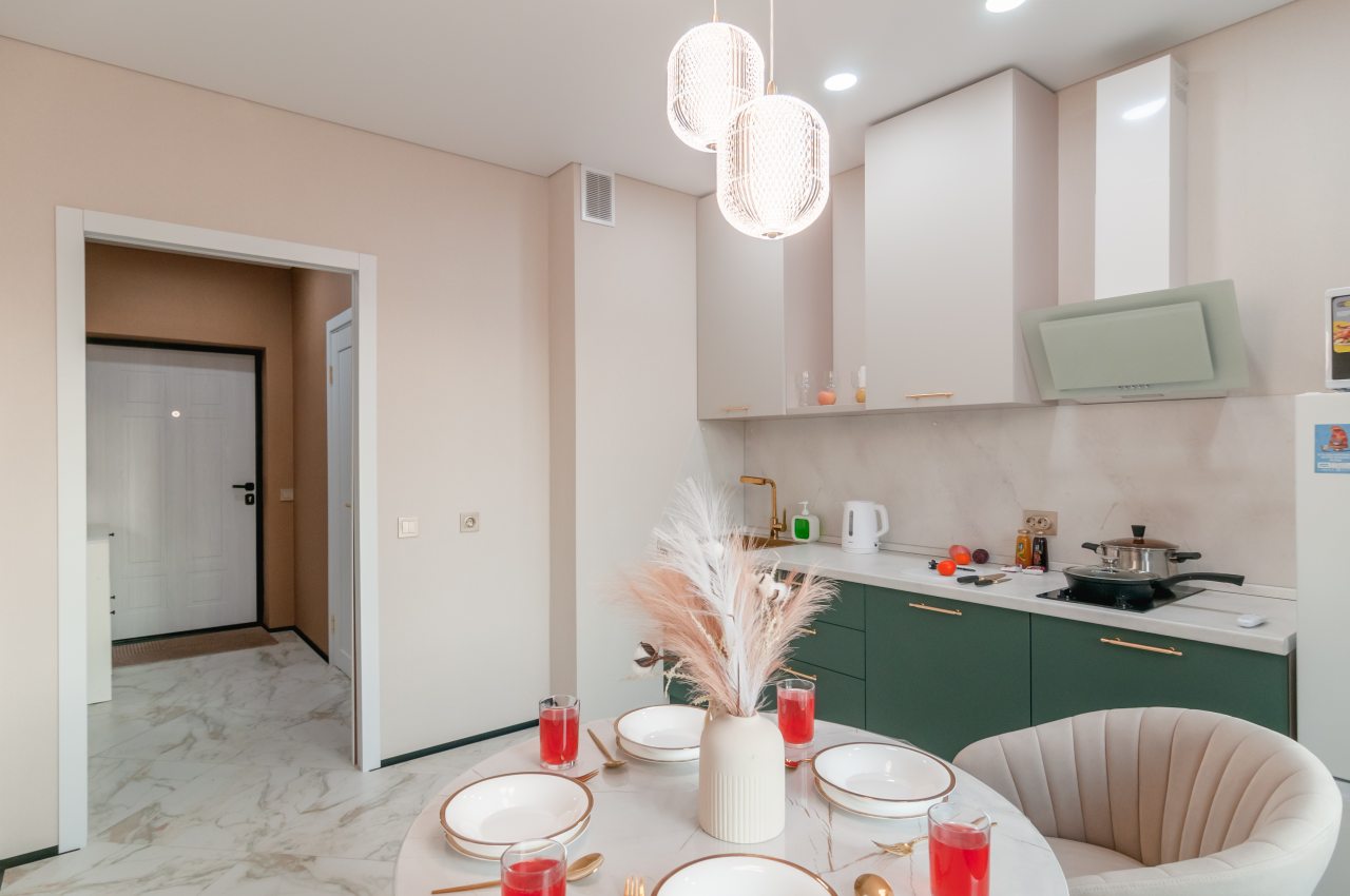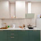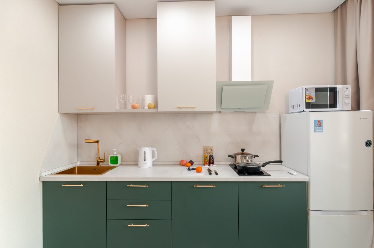 На светлой кухне будет приятно трапезничать и готовить любимые блюда. Из бытовой техники имеются СВЧ, холодильник, индукционная плита с вытяжкой, чайник.