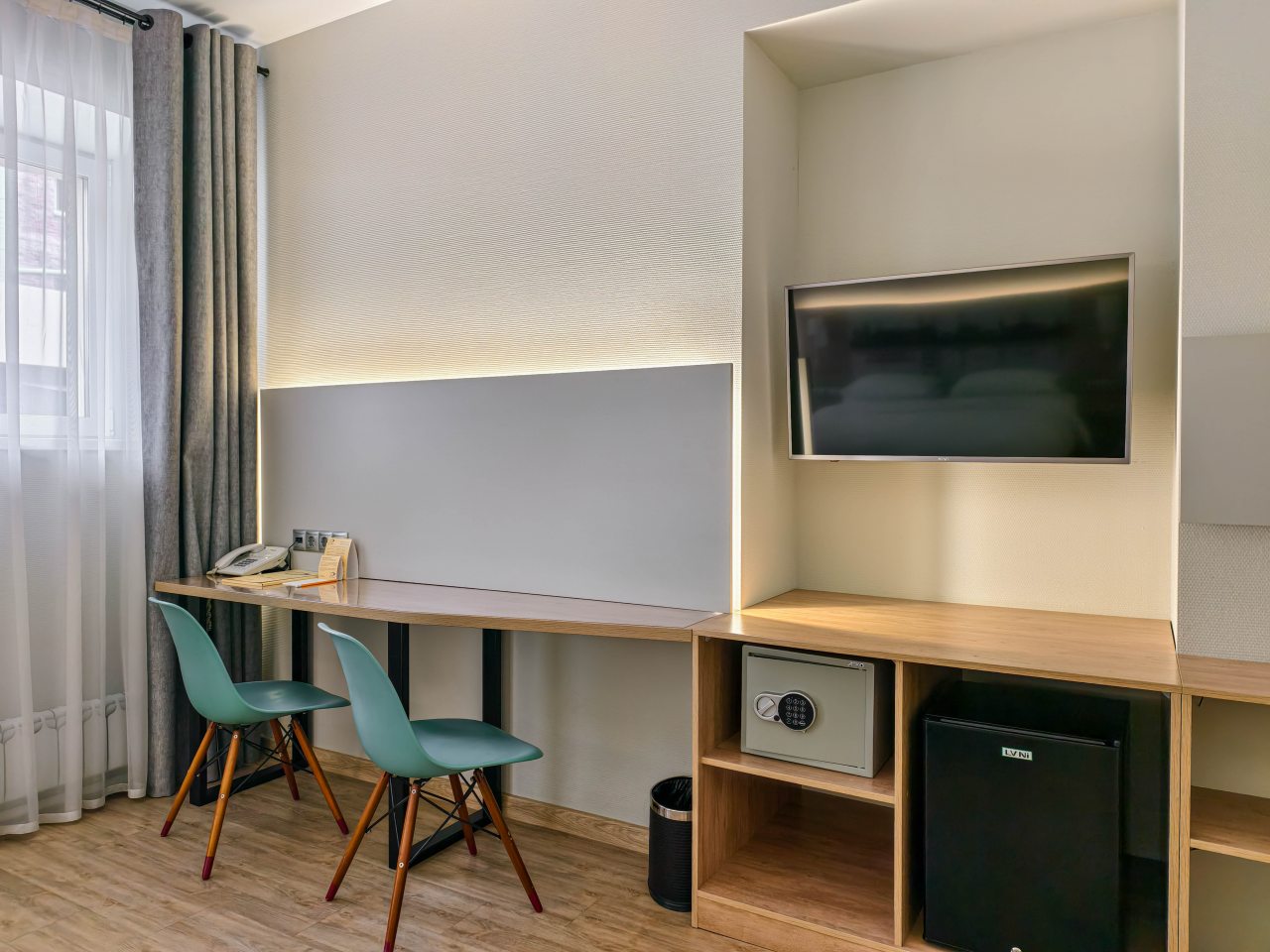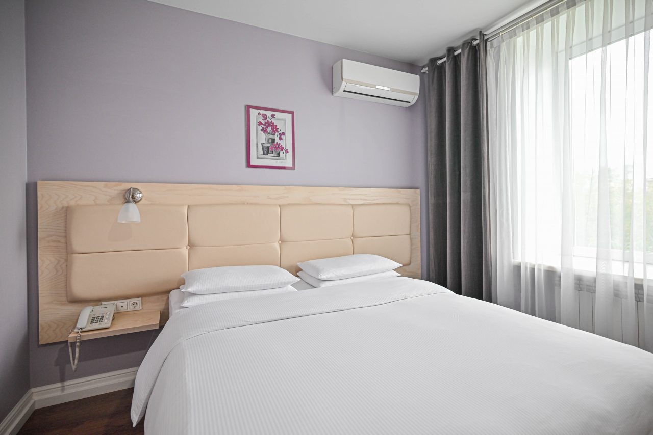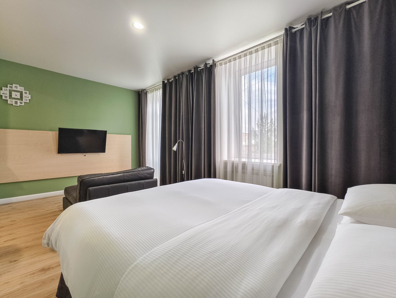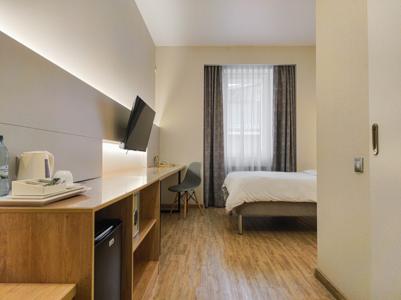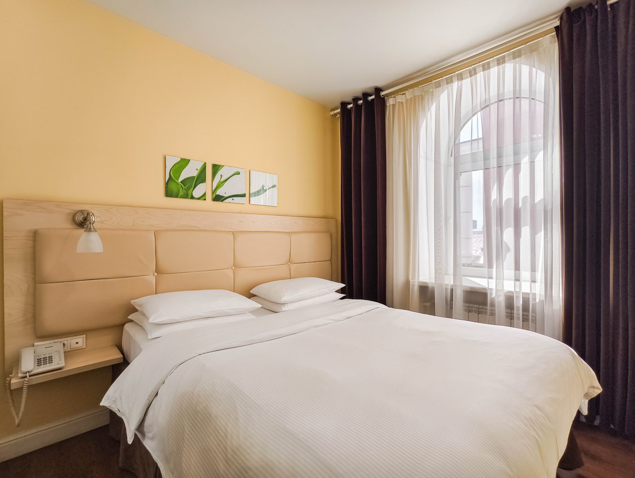 К услугам гостей 11 светлых, просторных номеров, с видом на проспект Мира - главную улицу города. В номерах гостиницы имеется все необходимое для удобства и комфорта: кровать, письменный стол, кондиционер, электрический чайник, посуда для чаепития. Каждый оборудован небольшой кухней, в которой имеется холодильник, варочная панель, микроволновая печь, кофемашина, стиральная машина.