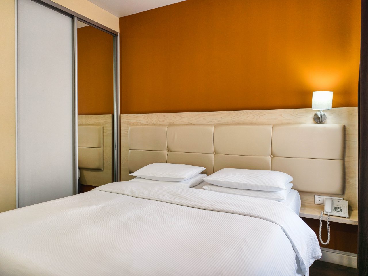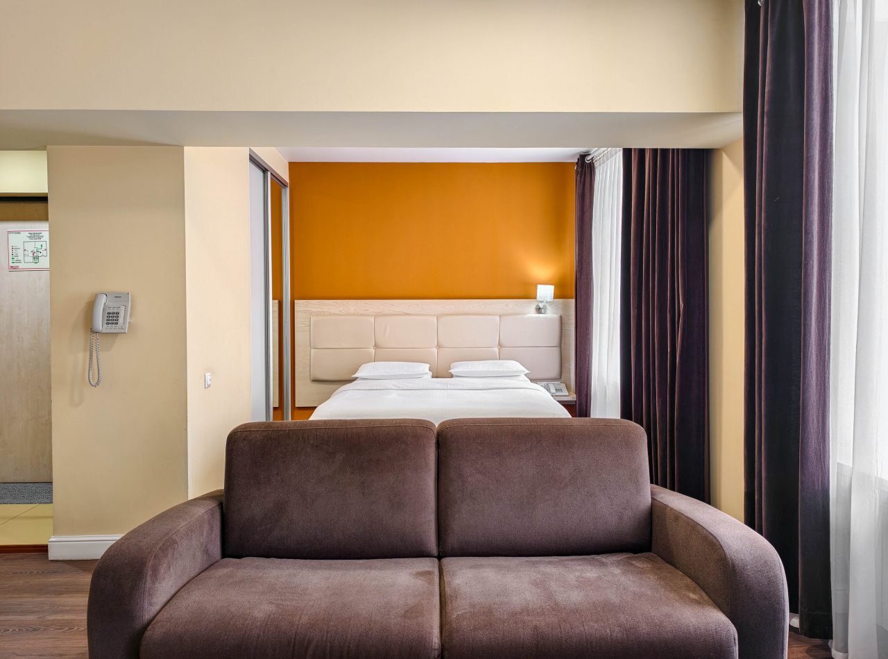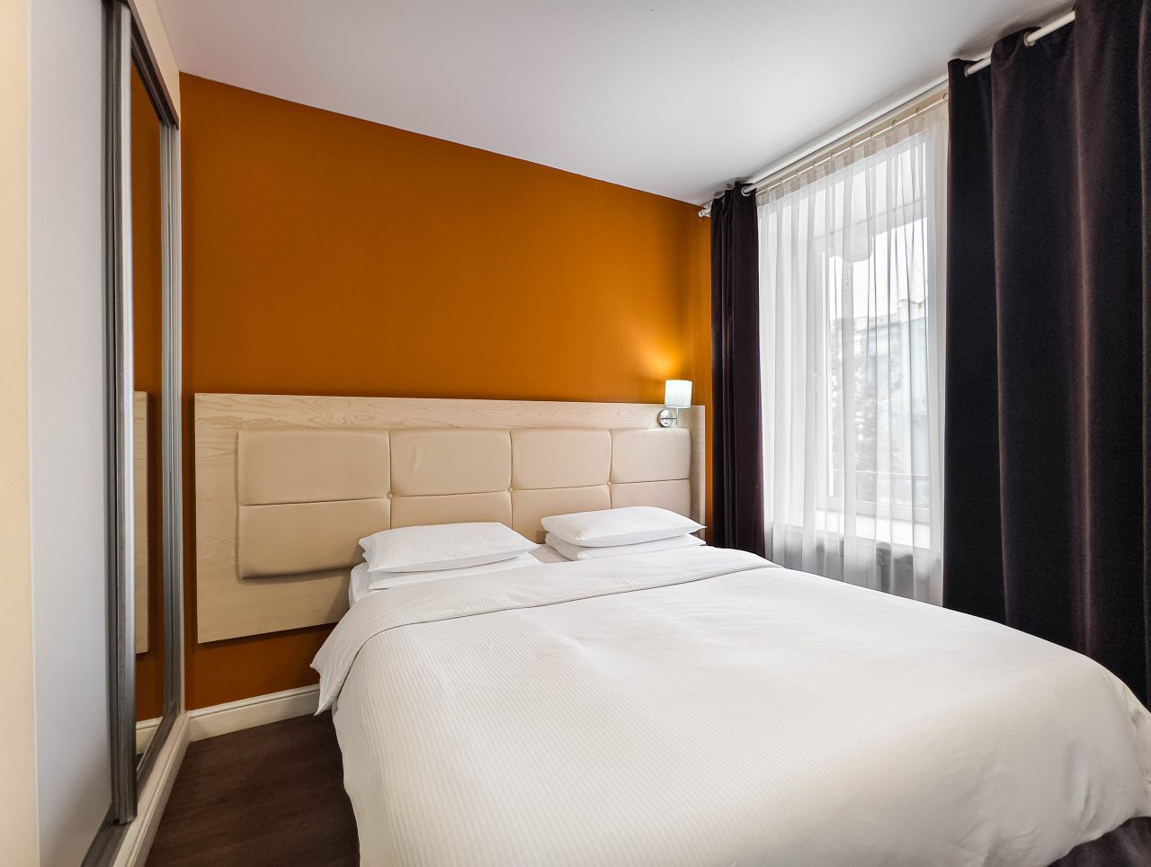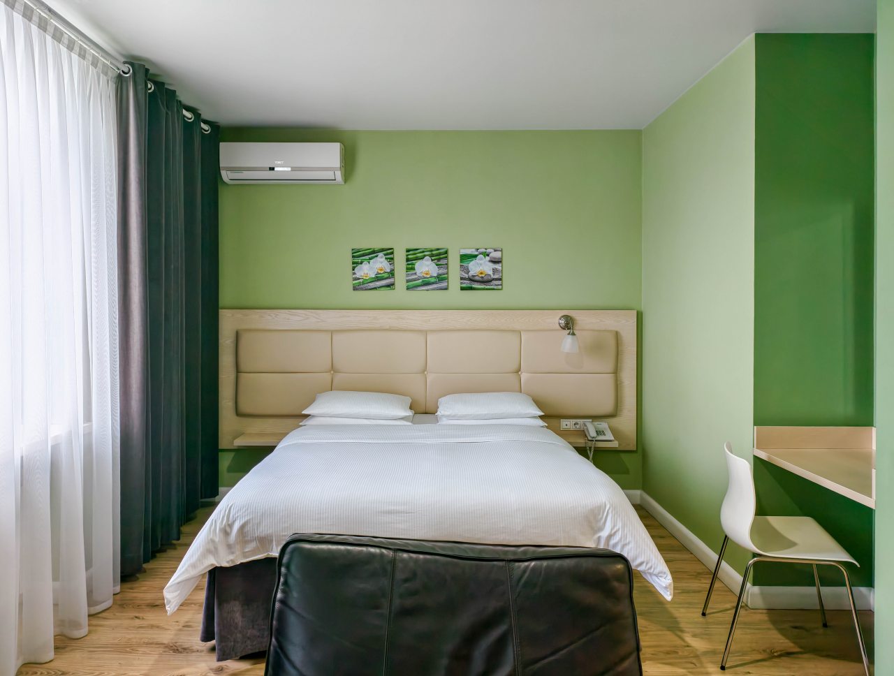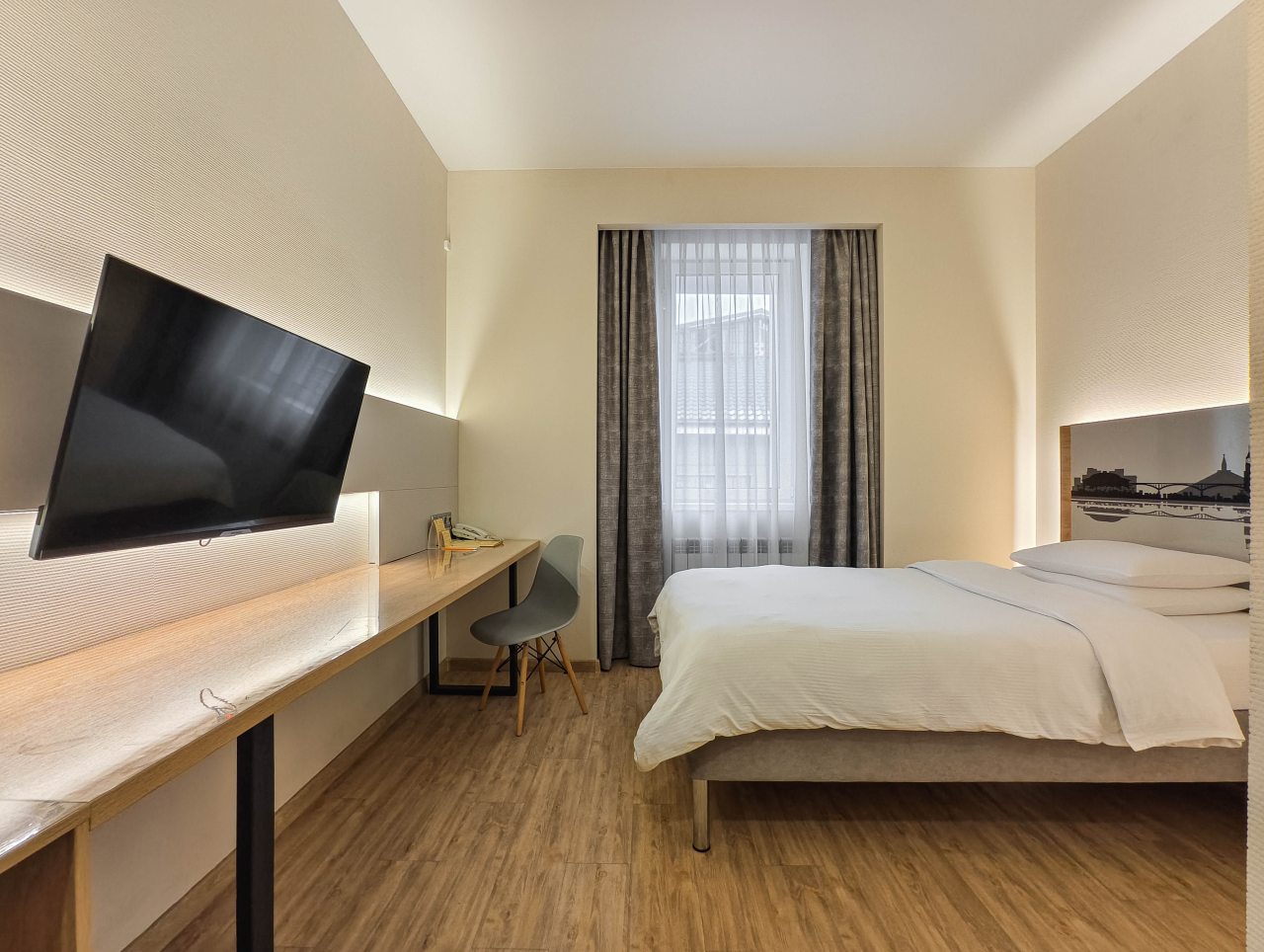К услугам гостей 11 светлых, просторных номеров, с видом на проспект Мира - главную улицу города. В номерах гостиницы имеется все необходимое для удобства и комфорта: кровать, письменный стол, кондиционер, электрический чайник, посуда для чаепития. Каждый оборудован небольшой кухней, в которой имеется холодильник, варочная панель, микроволновая печь, кофемашина, стиральная машина.
