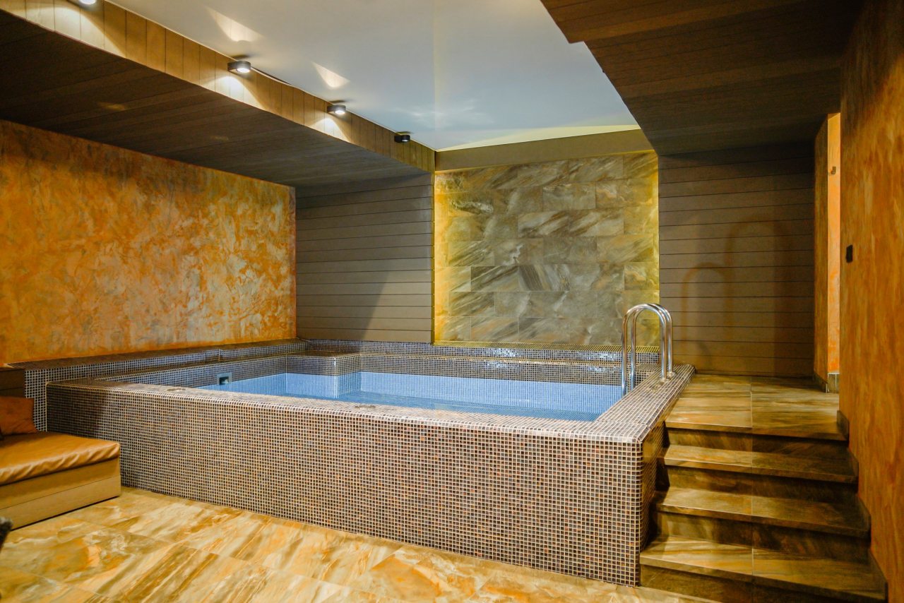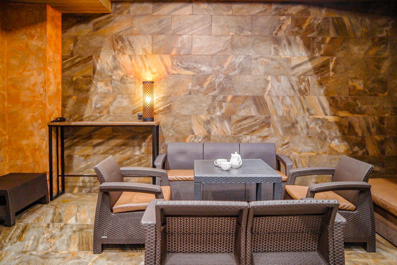 Сауна «Марокко» создана для комфортного отдыха небольшой компании. Интерьер выполнен в спокойных тонах с использованием темных и золотистых оттенков.