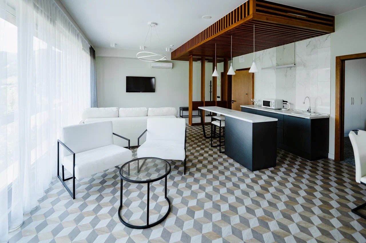 Отличная гостиница, оформлена она в минимализме, но знаете, все из того, что бы мне потребовалось на отдыхе здесь, было в моем распоряжении. Все очень грамотно продумано. В апартаментах есть кухня, что очень удобно, но мы предпочли питаться в местном ресторане. Он находится рядышком.