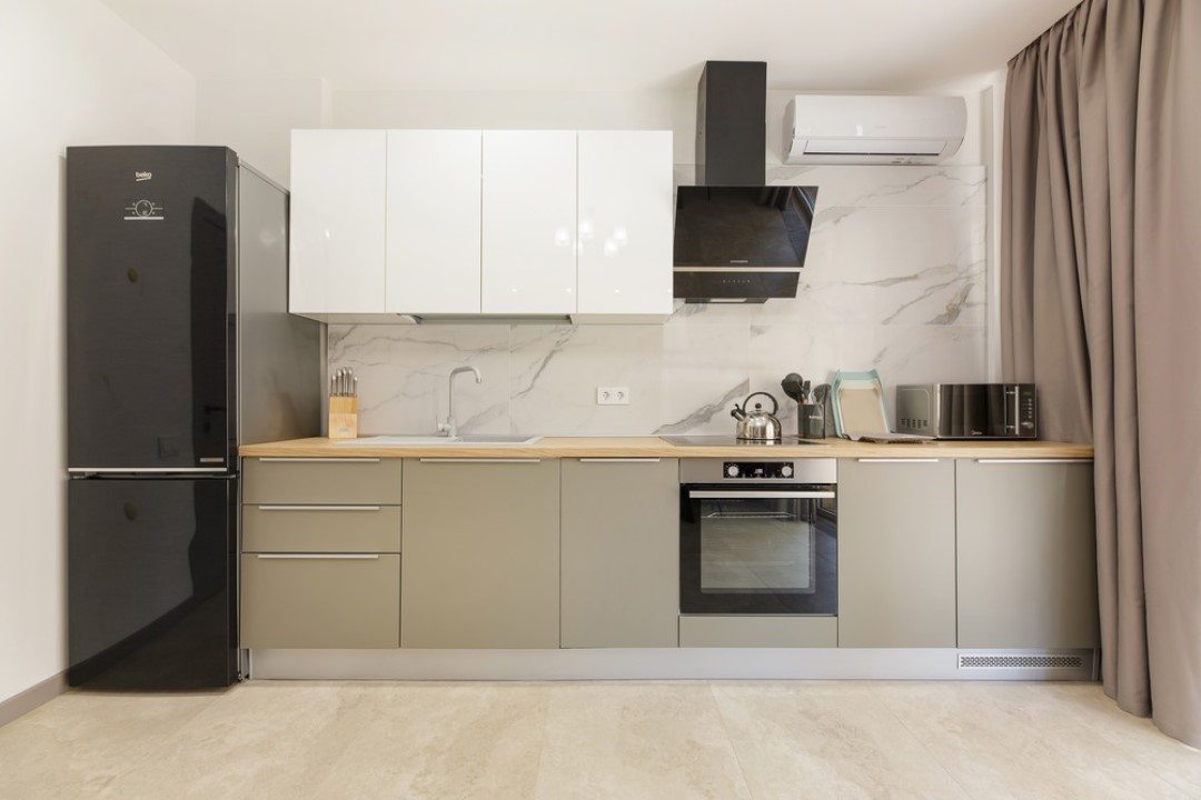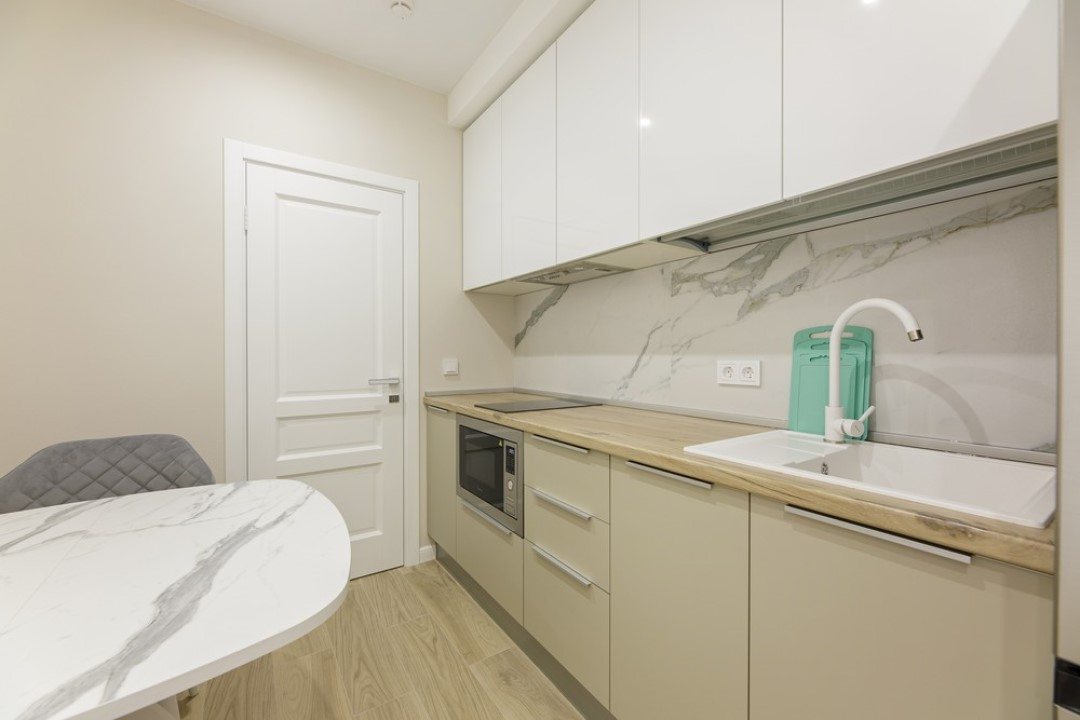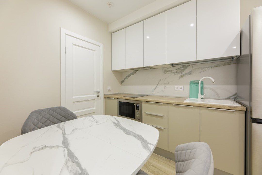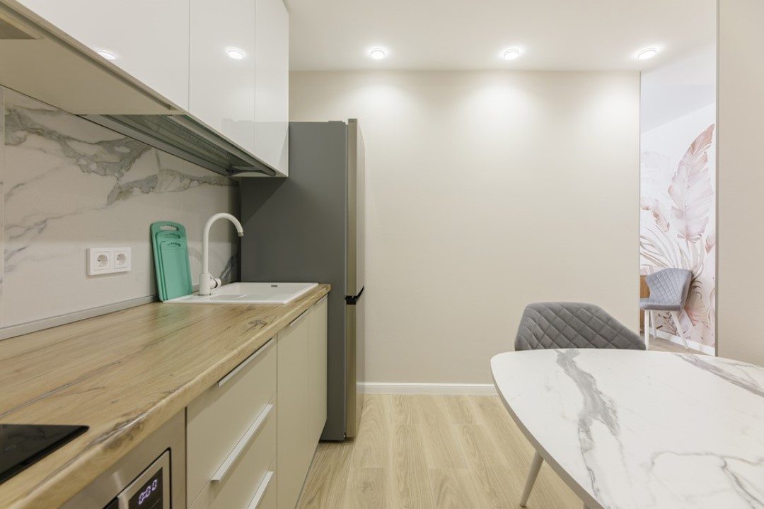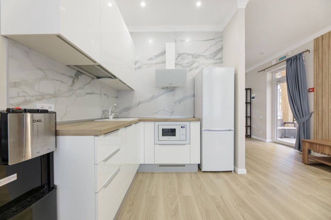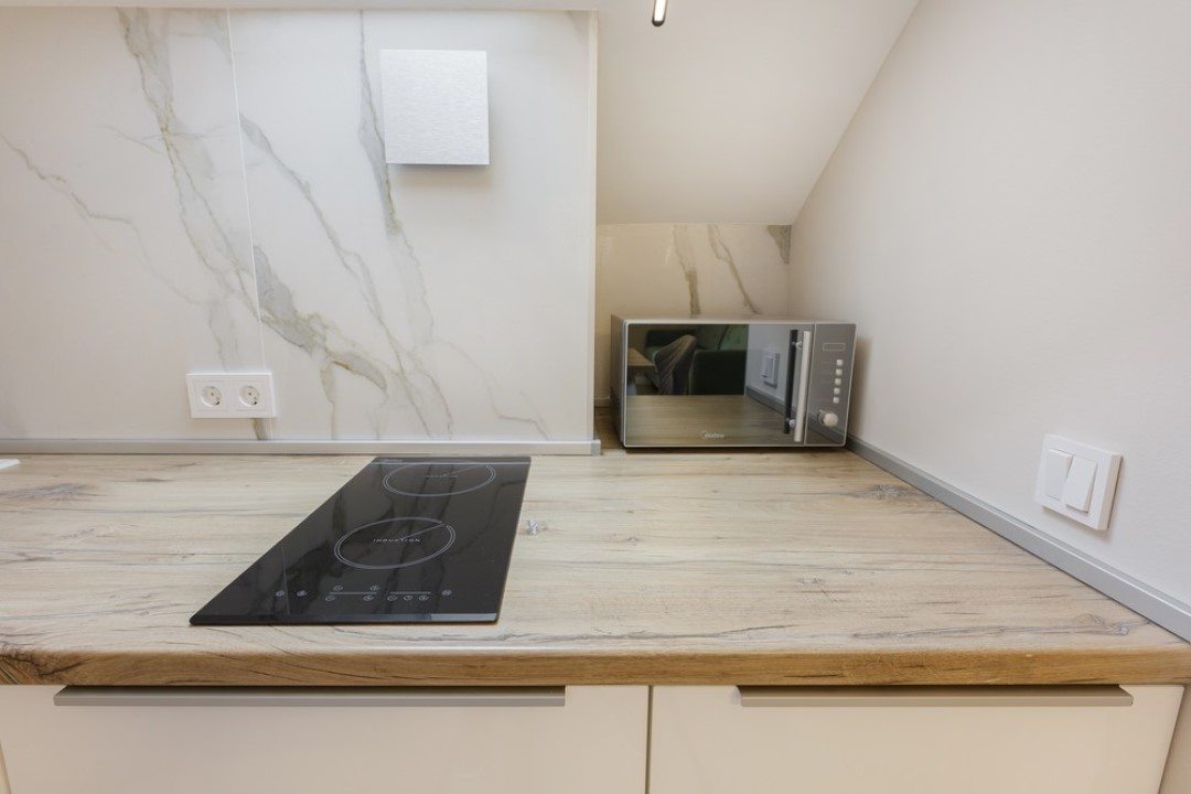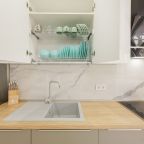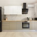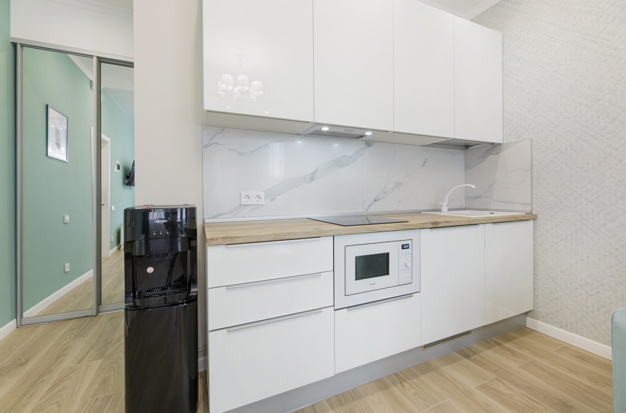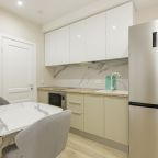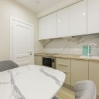 В каждых апартаментах есть своя небольшая кухня, на которой установлены: холодильник, плита, столешницы, обеденный стол. Поблизости есть столовая и закусочная.