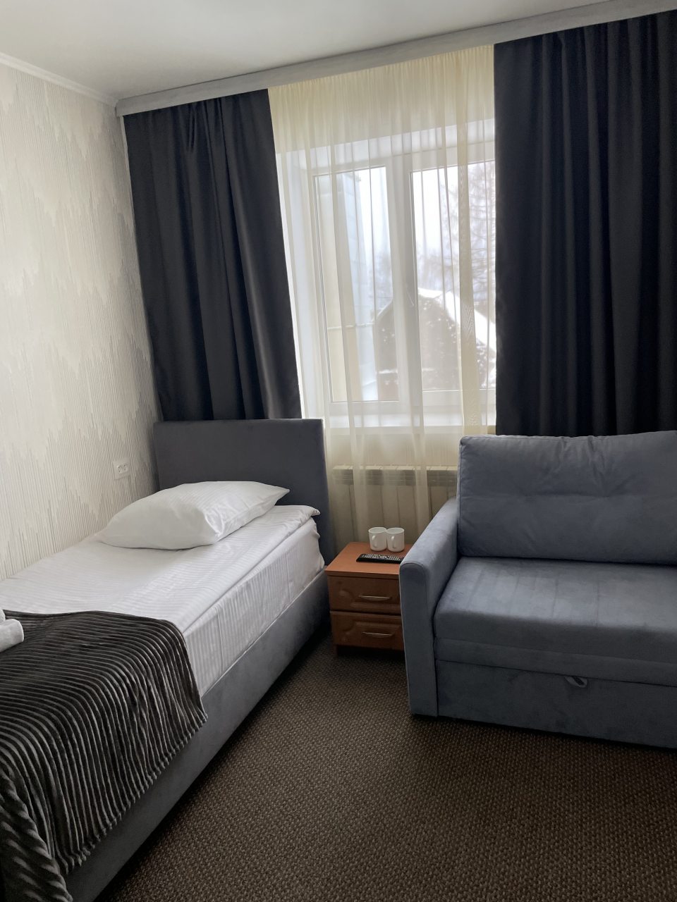 Сделали привал на ночь во время путешествия. Администратор-девушка детально проинформировала и провела в комнату. Номер и постельное белье отличались чистотой. Завтрак был включен в цену, но мы уехали до его начала. Вид из окон открывался на трассу, что создавало непрерывный гул. Нам это не сильно помешало, но для чуткого сна может быть проблемой.