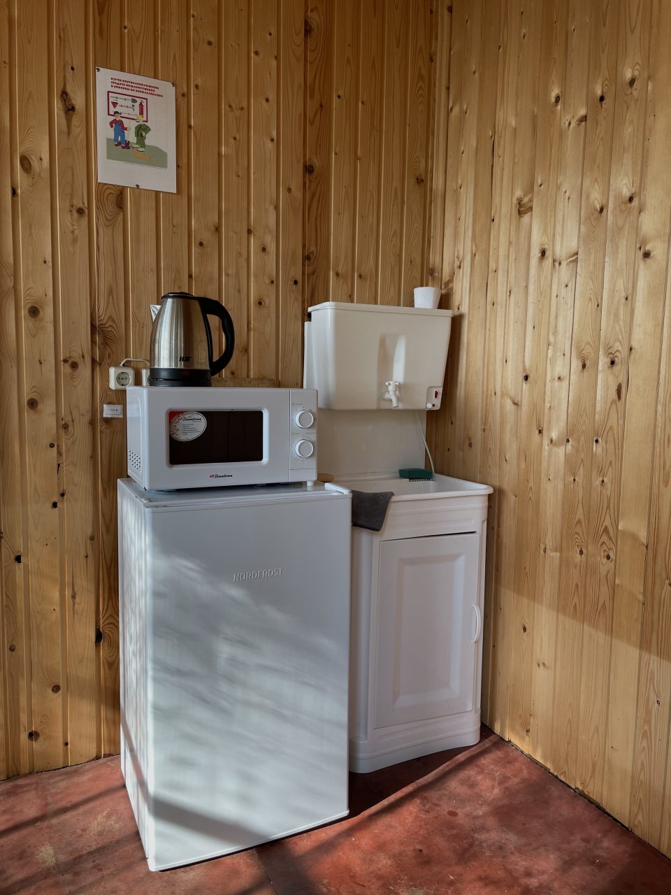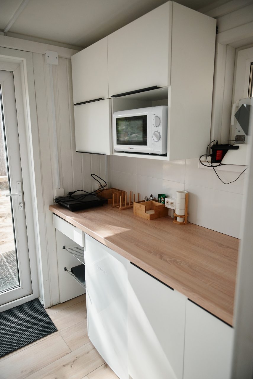Некоторые варианты размещения оснащены собственной кухонной зоной или бытовой техникой для самостоятельной организации питания: микроволновая печь, холодильник, также возможно наличие чайника и электрической плиты.