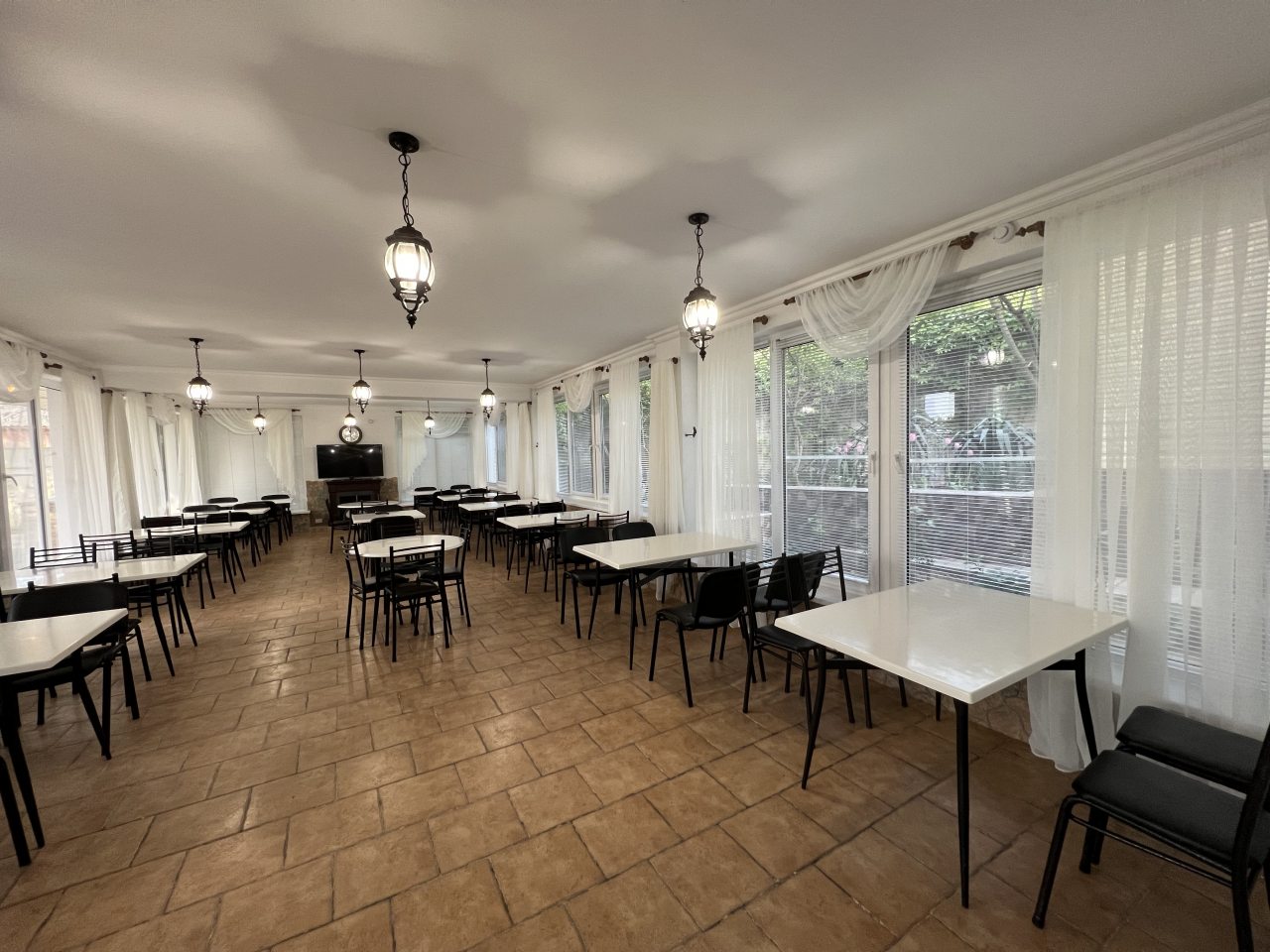 Есть общая кухня с большим обеденным столом и необходимой утварью. Просторная, так что толкаться тут никто не будет. Дополнительно можно обедать, завтракать и ужинать в кафе по меню.