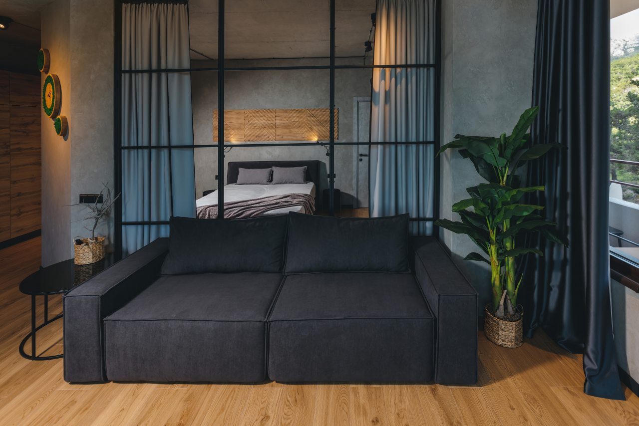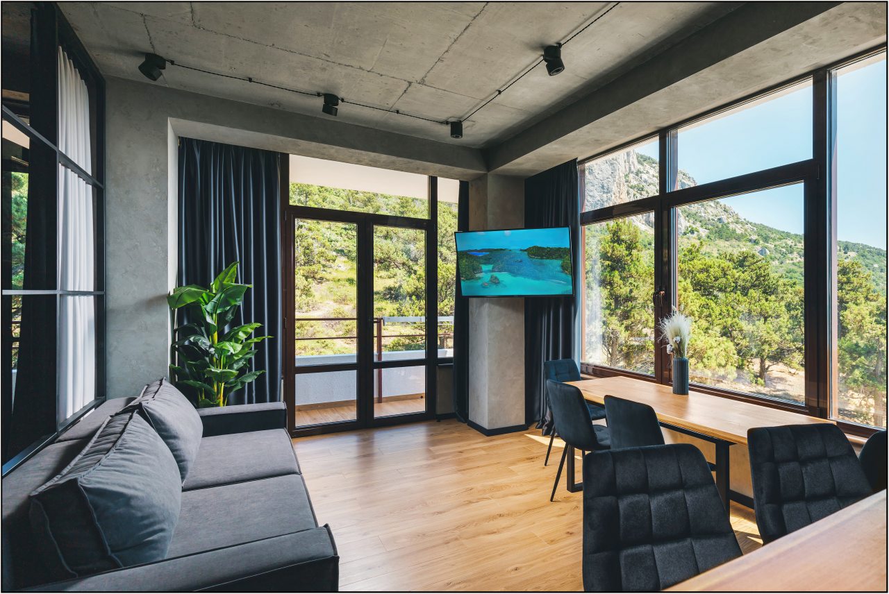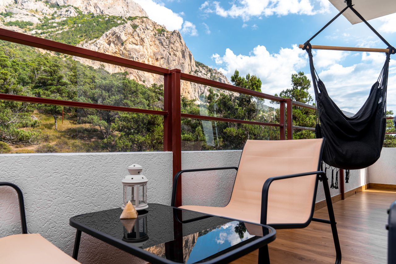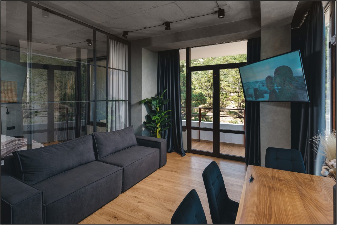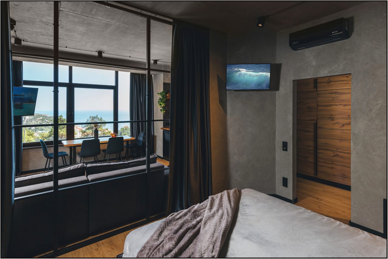 Внутри вас ожидает живописный вид из окон, качественная и современная мебель и техника, в том числе удобная двуспальная кровать, мягкий диван с телевизором, уютный балкон с зоной отдыха, просторный санузел с душевой.
