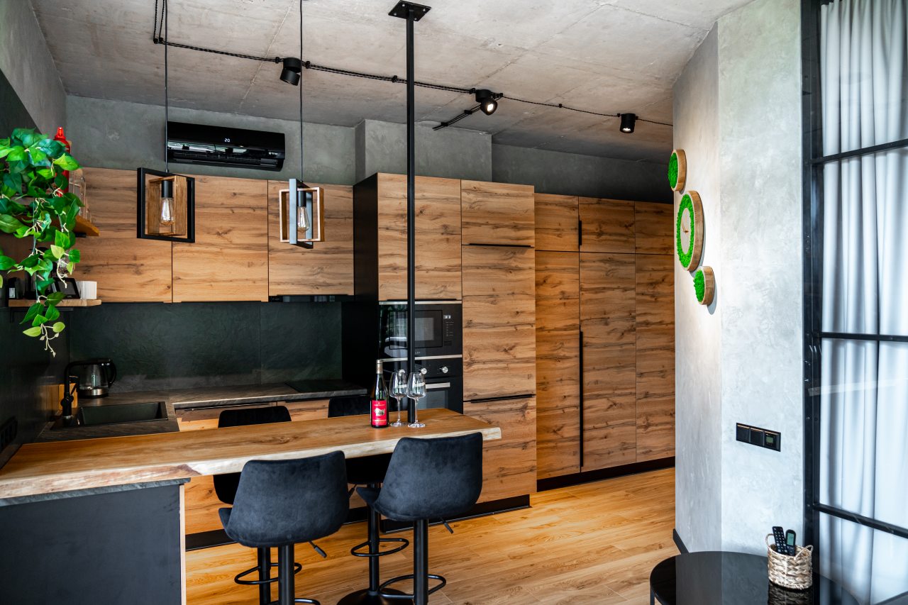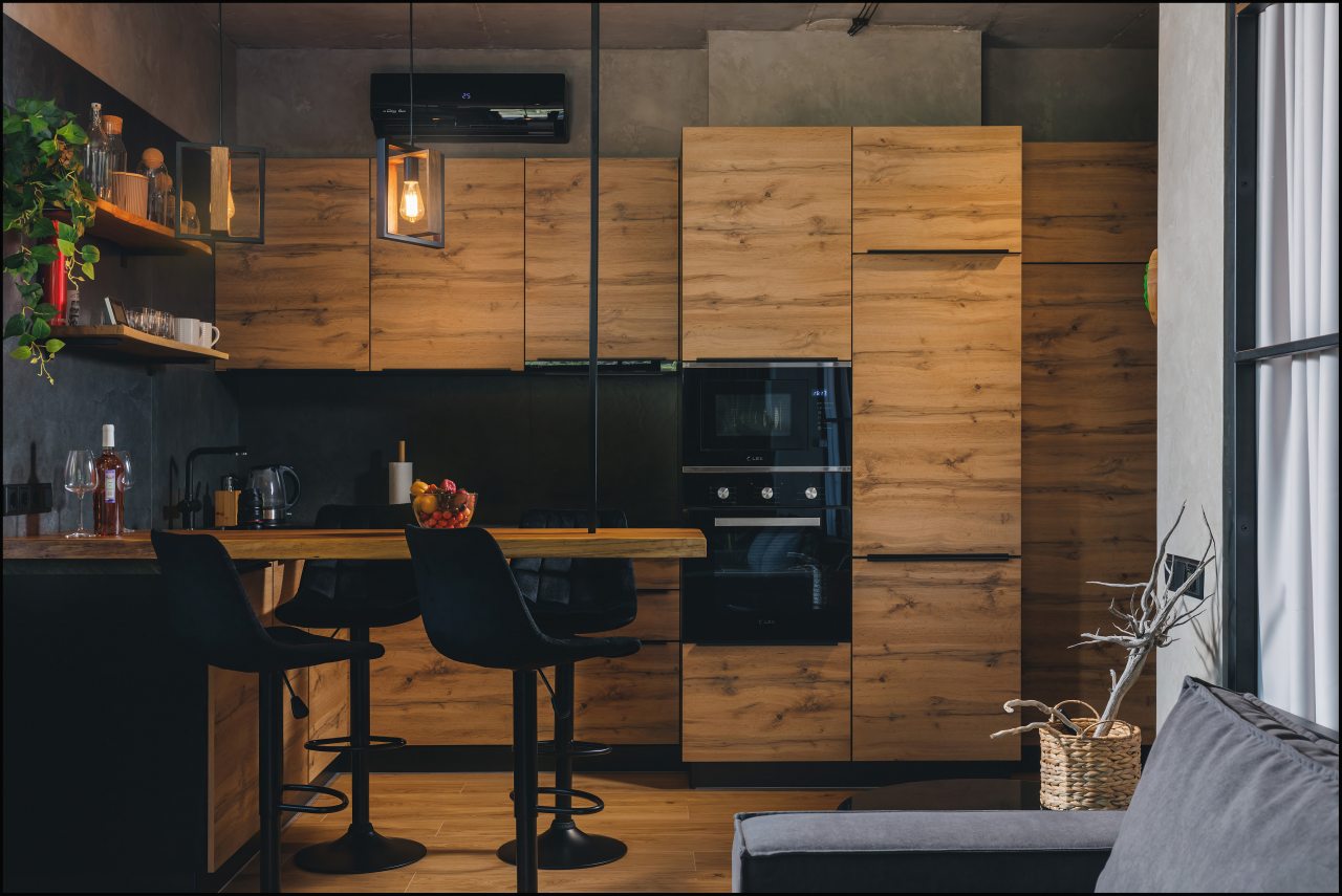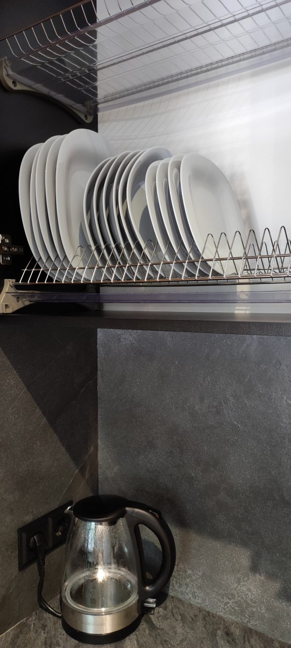 На кухне будет приятно готовить, так как в наличии духовой шкаф, СВЧ, посуда, чайник, красивая обеденная зона.