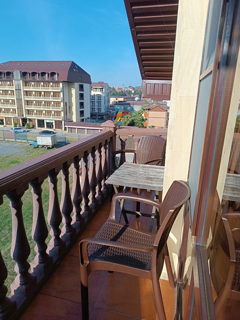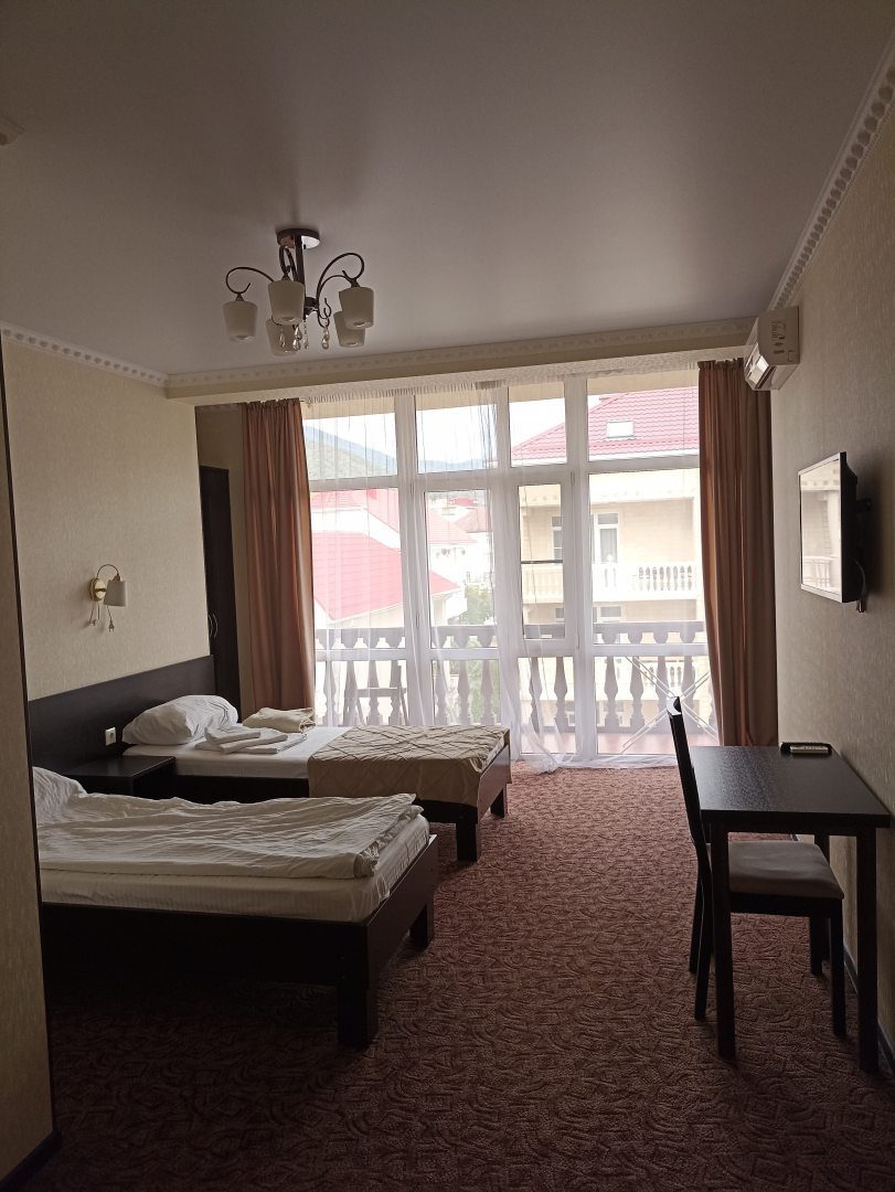 Есть основные удобства в номере(туалет и душ, кондиционер), просторно, балкон с видом на горы и соседние домики. В наличии фен, сейф маленький, холодильник.