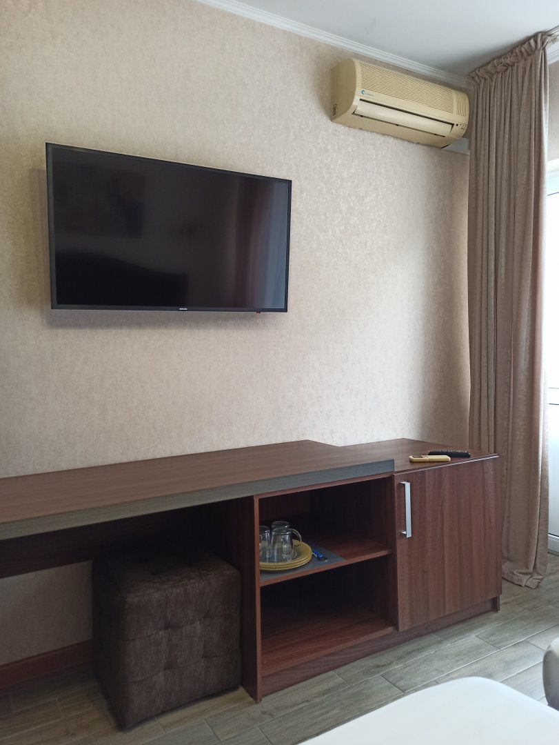 Отель расположен на первой линии. Можно не переодеваясь, в полотенце за 2 минуты оказаться у себя в номере. Это очень удобно. В номере телевизор, кондиционер, сейф, холодильник. В отеле есть лифт. Рядом детский парк с аттракционами.