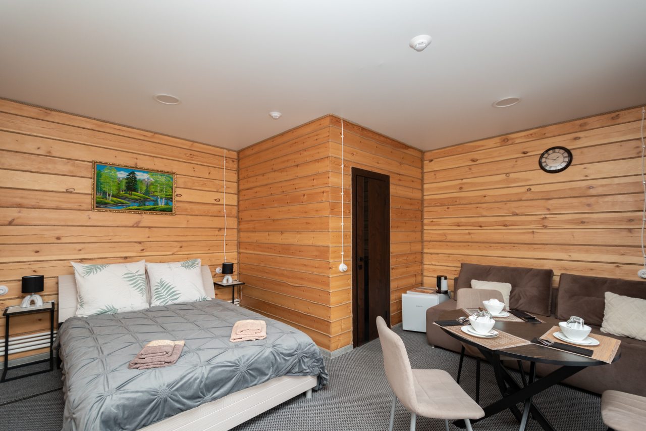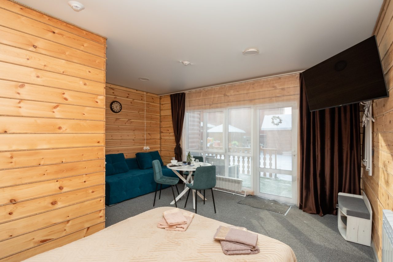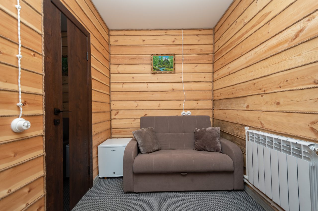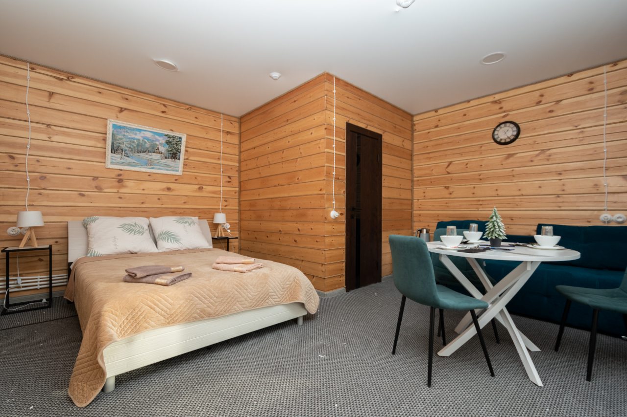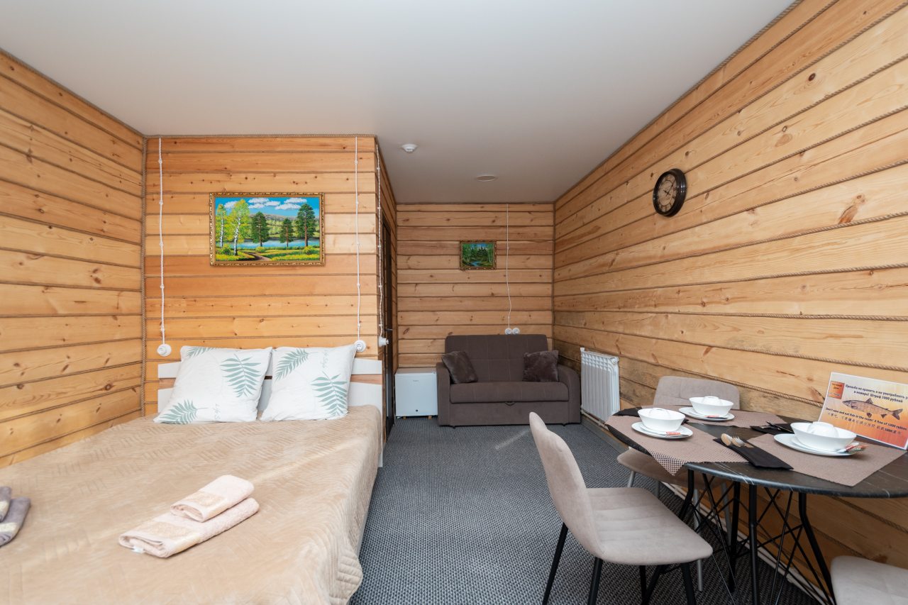 В уютных домиках выполнен современный ремонт и установлена комфортабельная мебель. Среди удобств для гостей: спальные места, зона отдыха с мягким диваном, полноценная ванная комната. На террасах перед домиками стоят плетеные кресла.