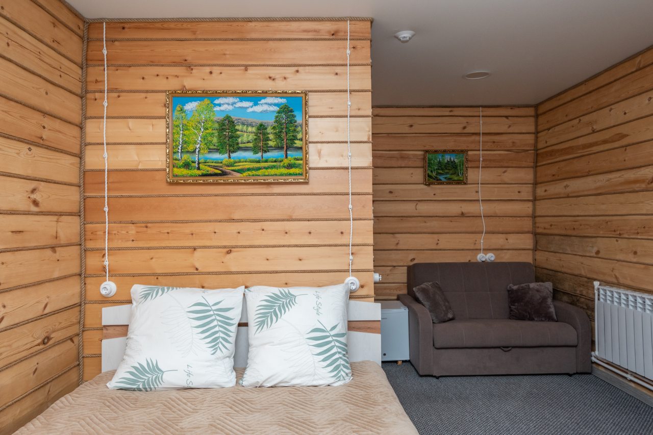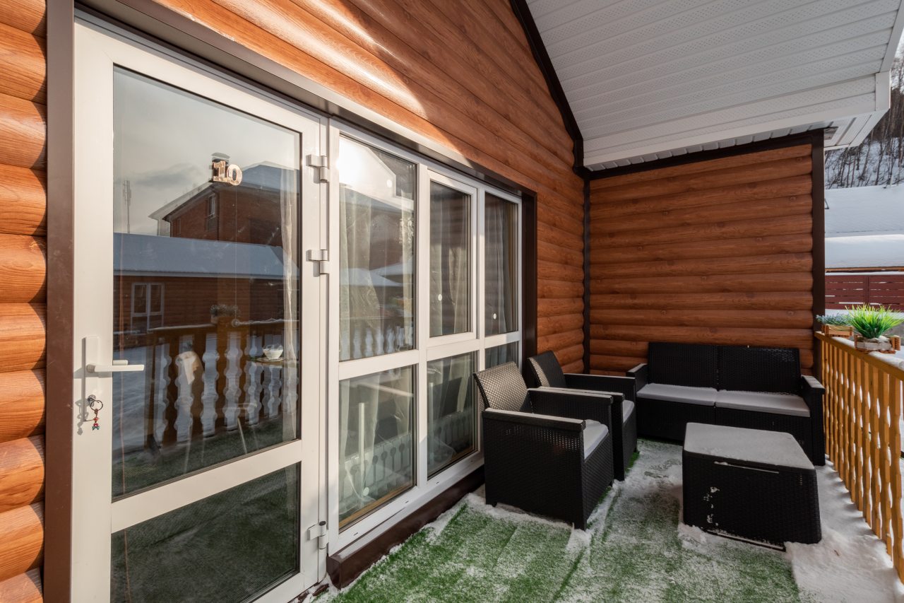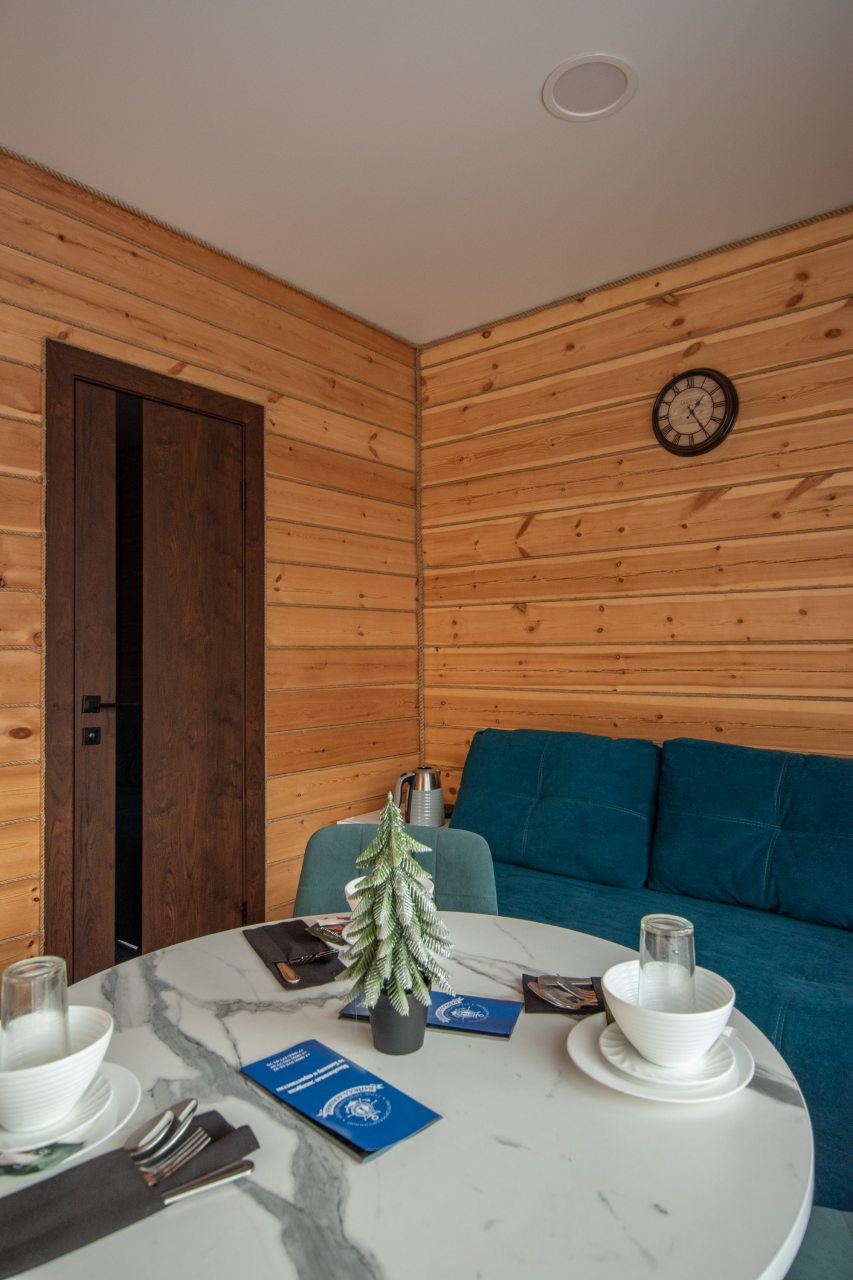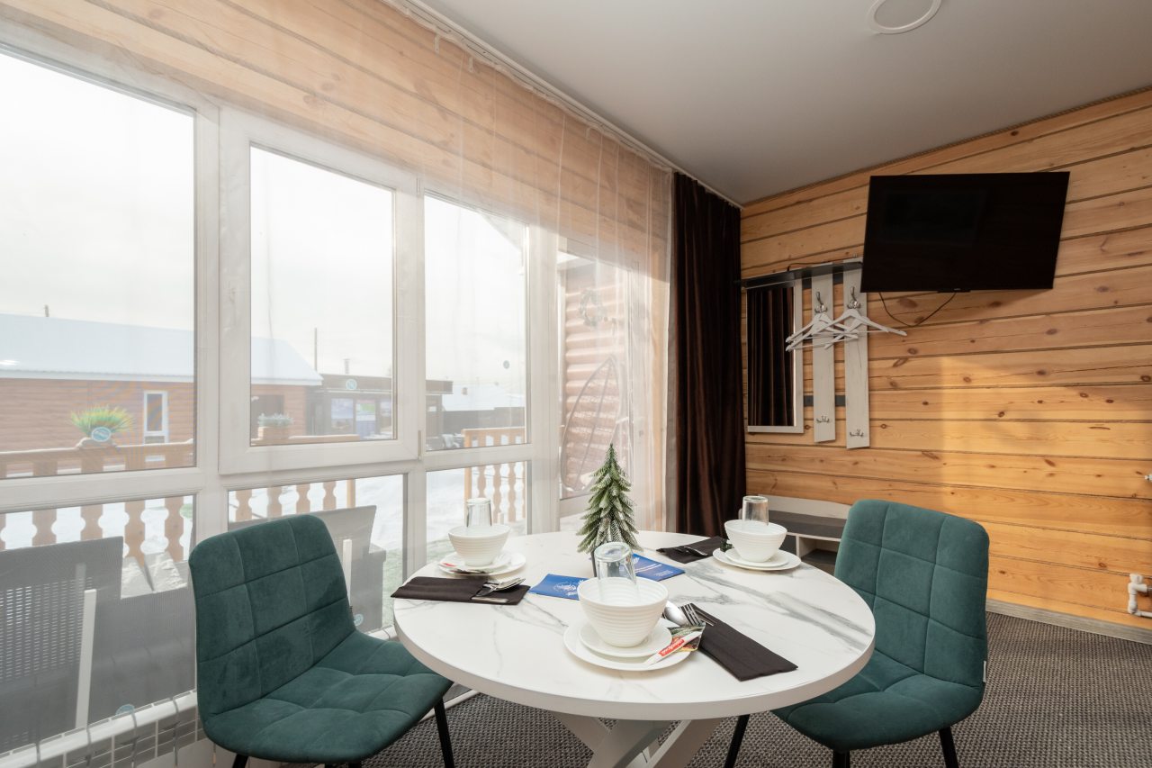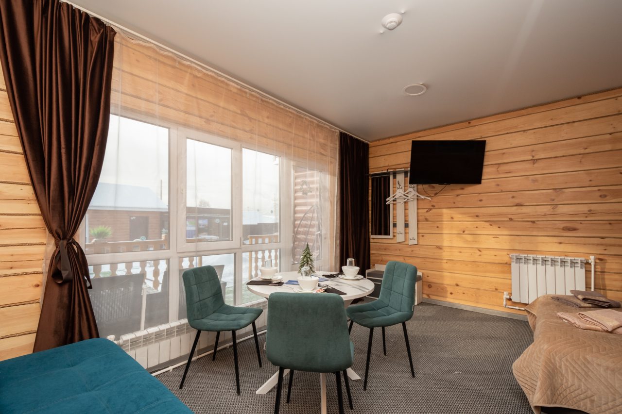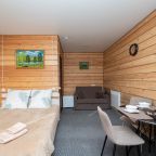 В уютных домиках выполнен современный ремонт и установлена комфортабельная мебель. Среди удобств для гостей: спальные места, зона отдыха с мягким диваном, полноценная ванная комната. На террасах перед домиками стоят плетеные кресла.