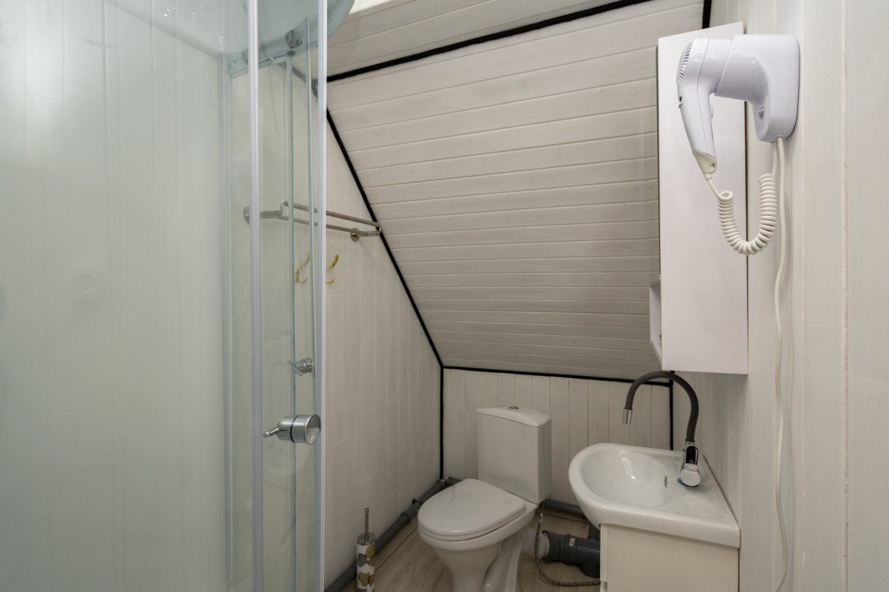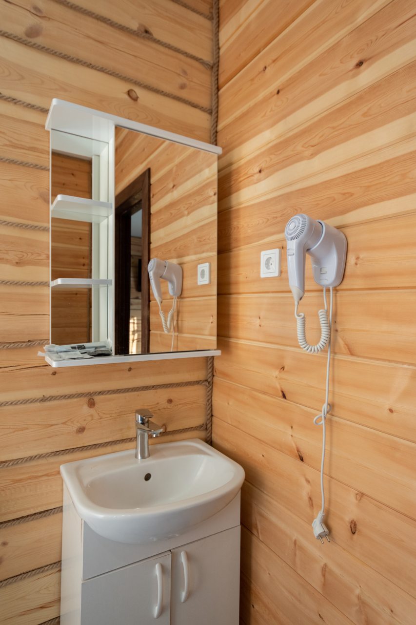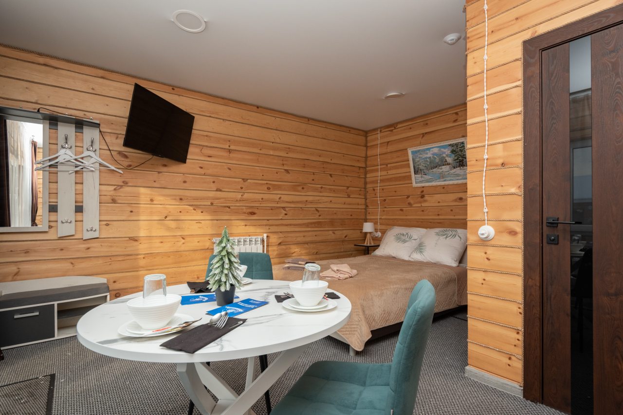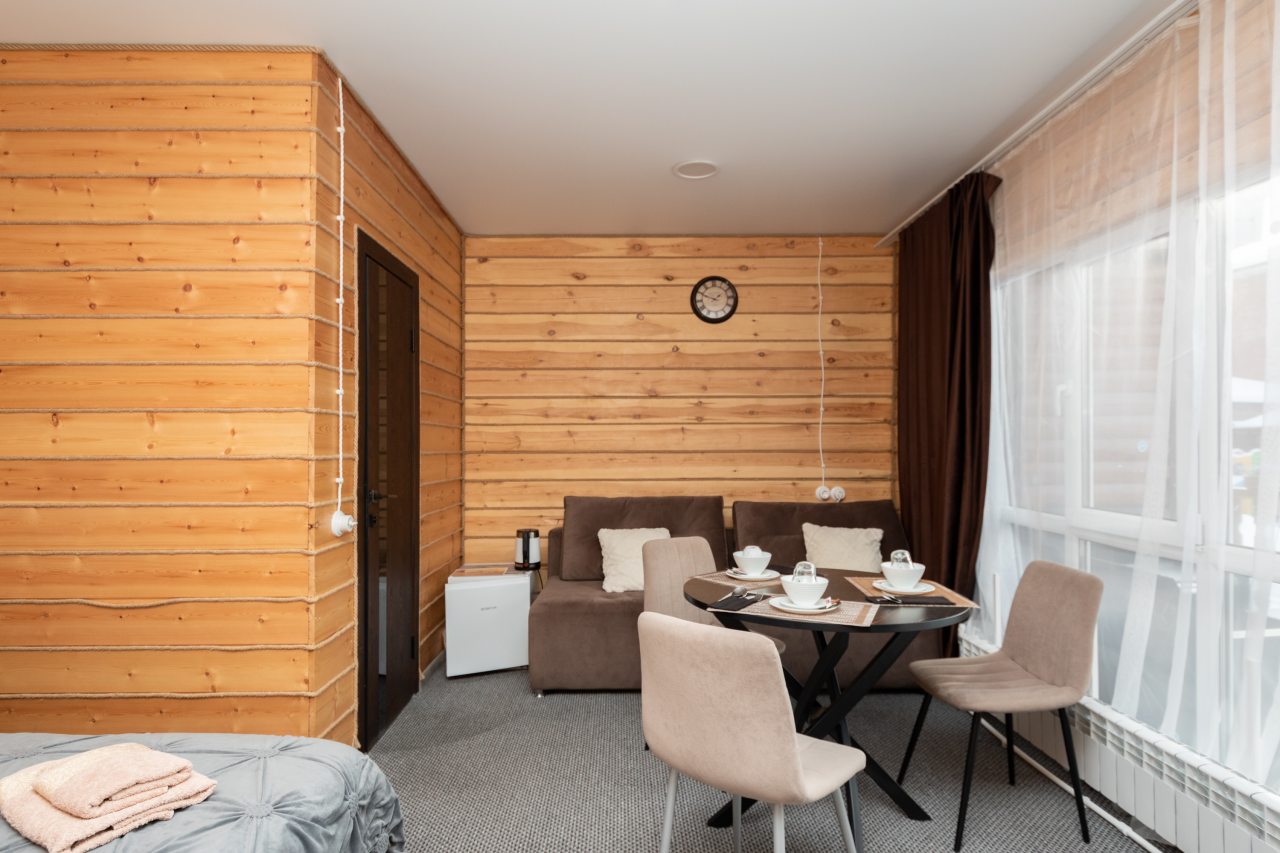 В уютных домиках выполнен современный ремонт и установлена комфортабельная мебель. Среди удобств для гостей: спальные места, зона отдыха с мягким диваном, полноценная ванная комната. На террасах перед домиками стоят плетеные кресла.