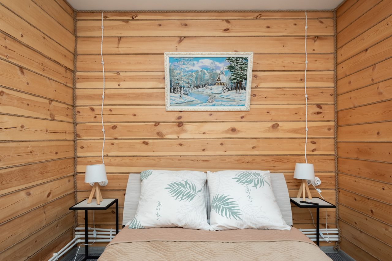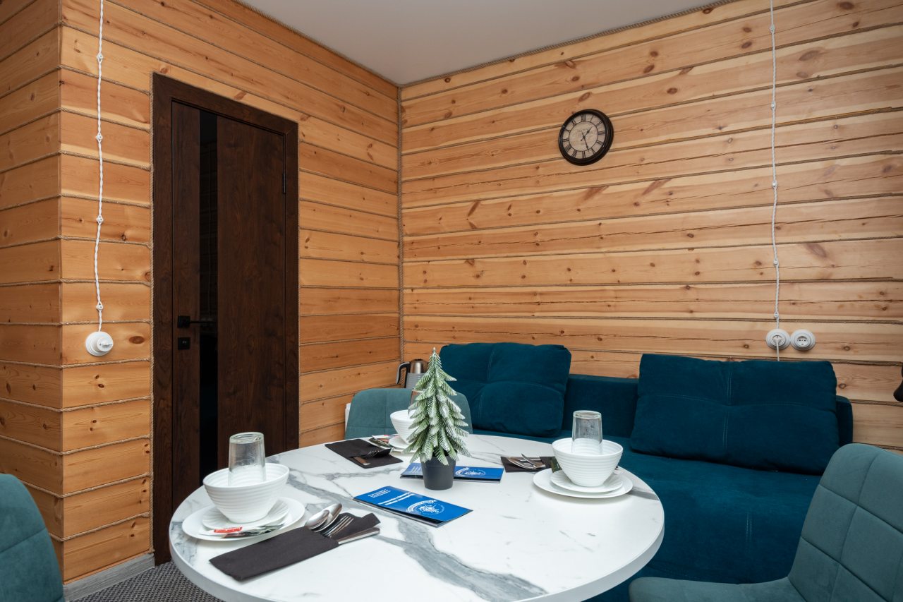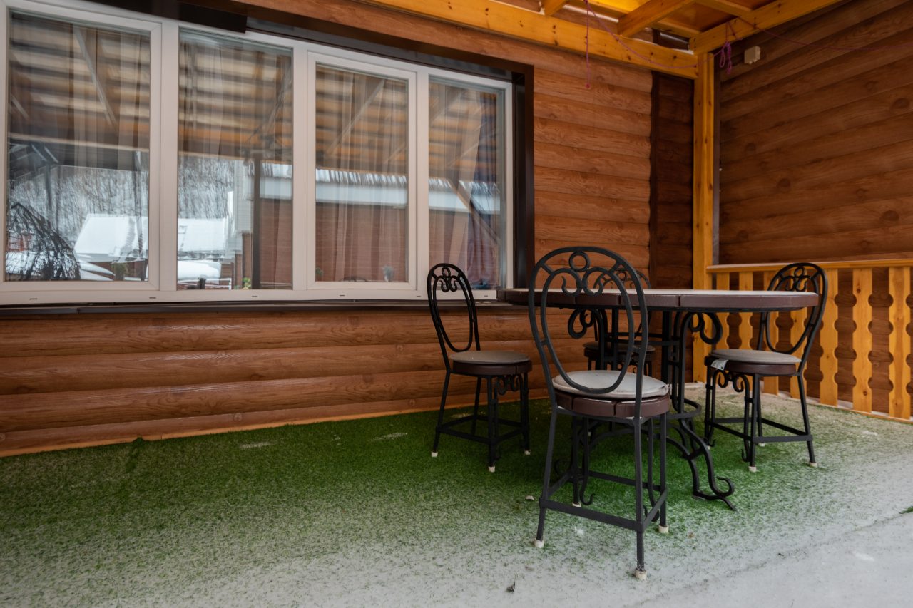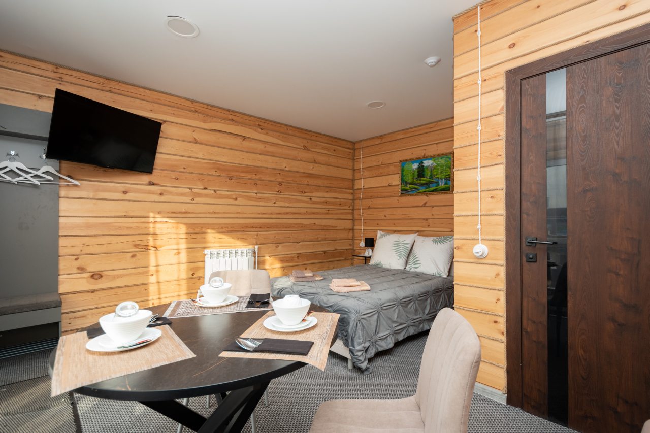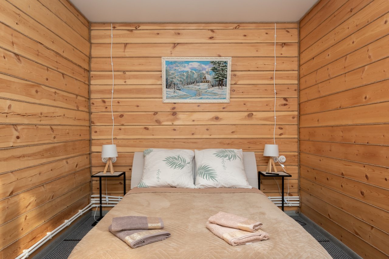 В уютных домиках выполнен современный ремонт и установлена комфортабельная мебель. Среди удобств для гостей: спальные места, зона отдыха с мягким диваном, полноценная ванная комната. На террасах перед домиками стоят плетеные кресла.
