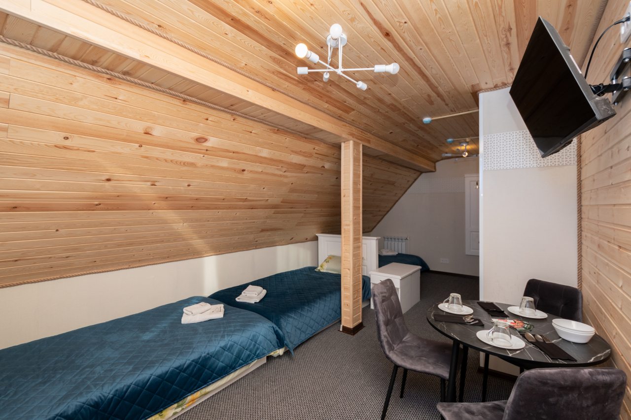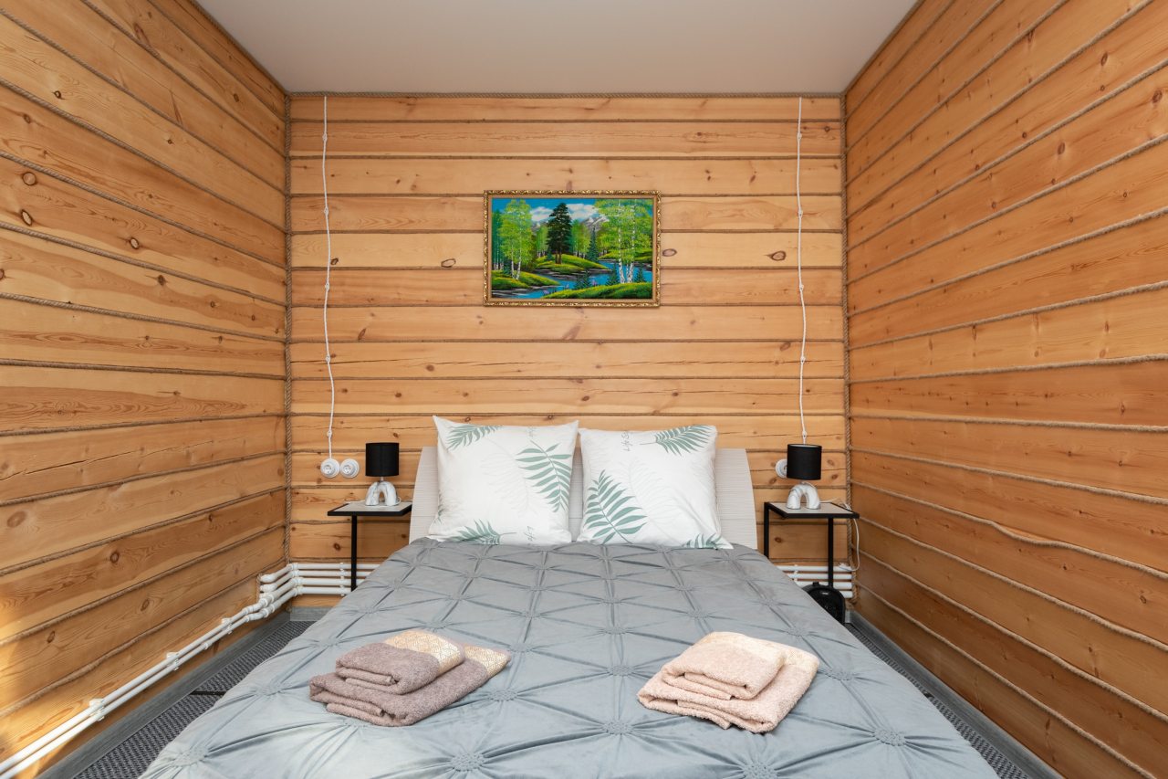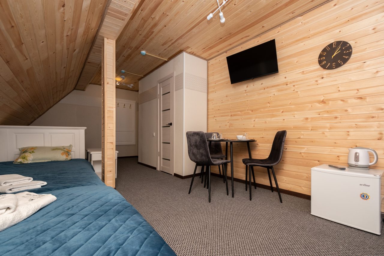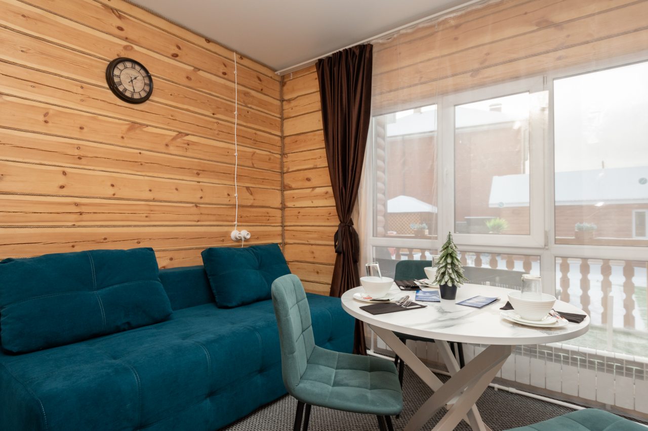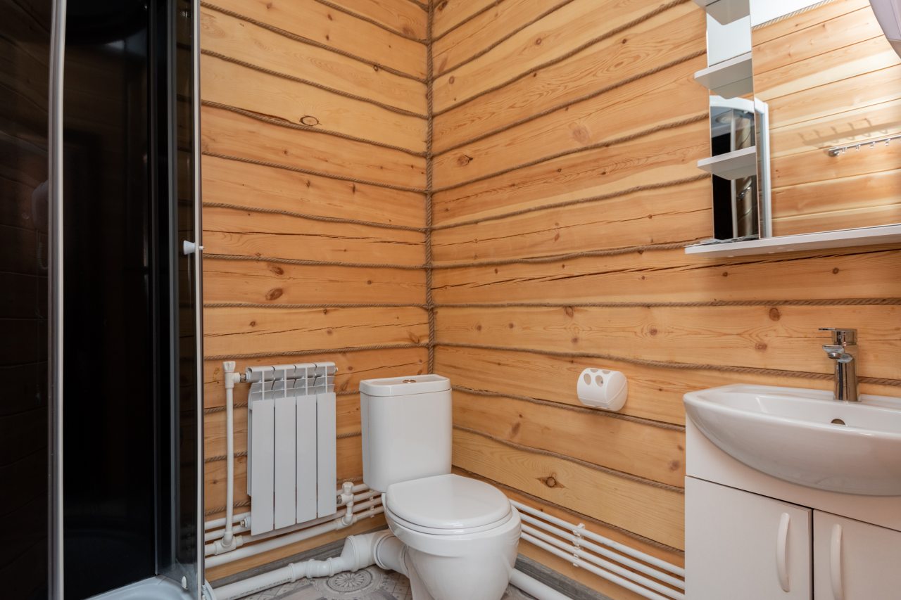 В уютных домиках выполнен современный ремонт и установлена комфортабельная мебель. Среди удобств для гостей: спальные места, зона отдыха с мягким диваном, полноценная ванная комната. На террасах перед домиками стоят плетеные кресла.